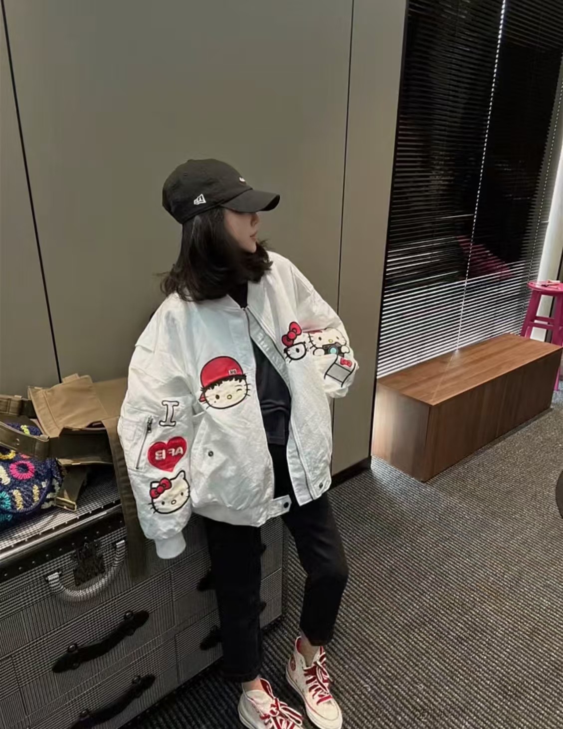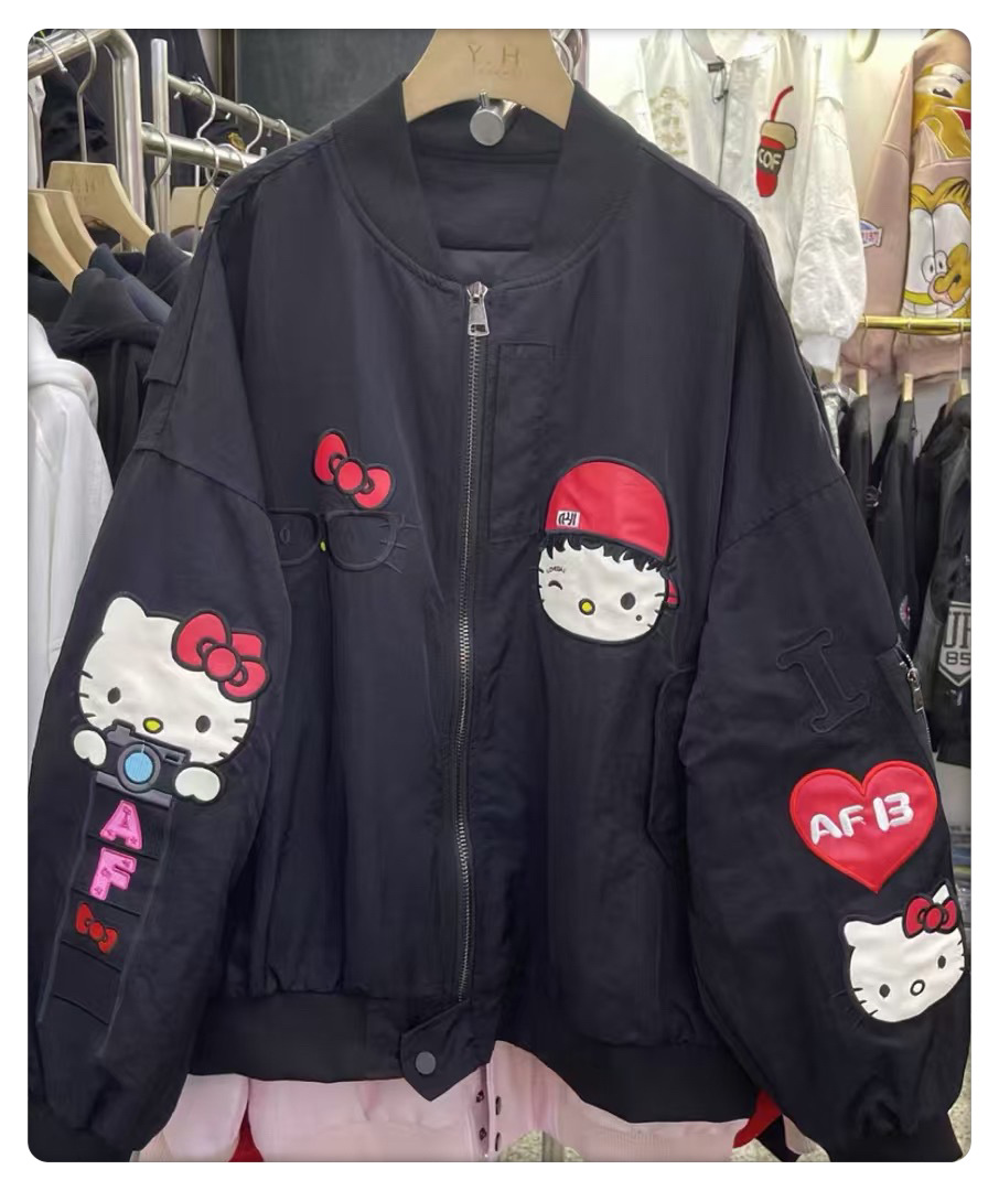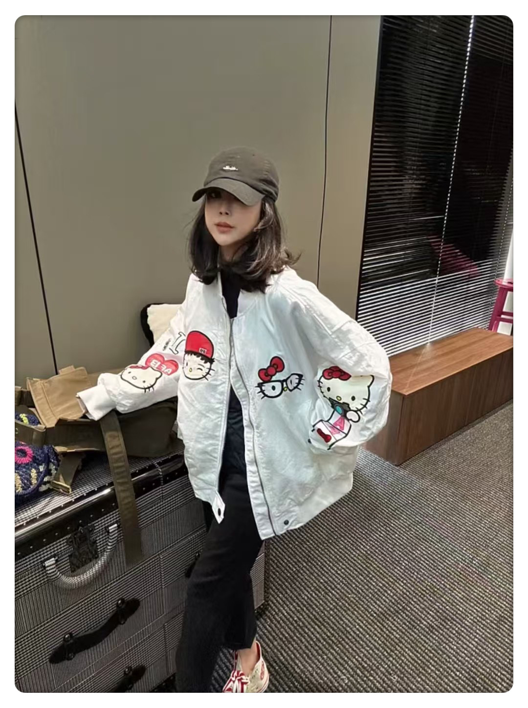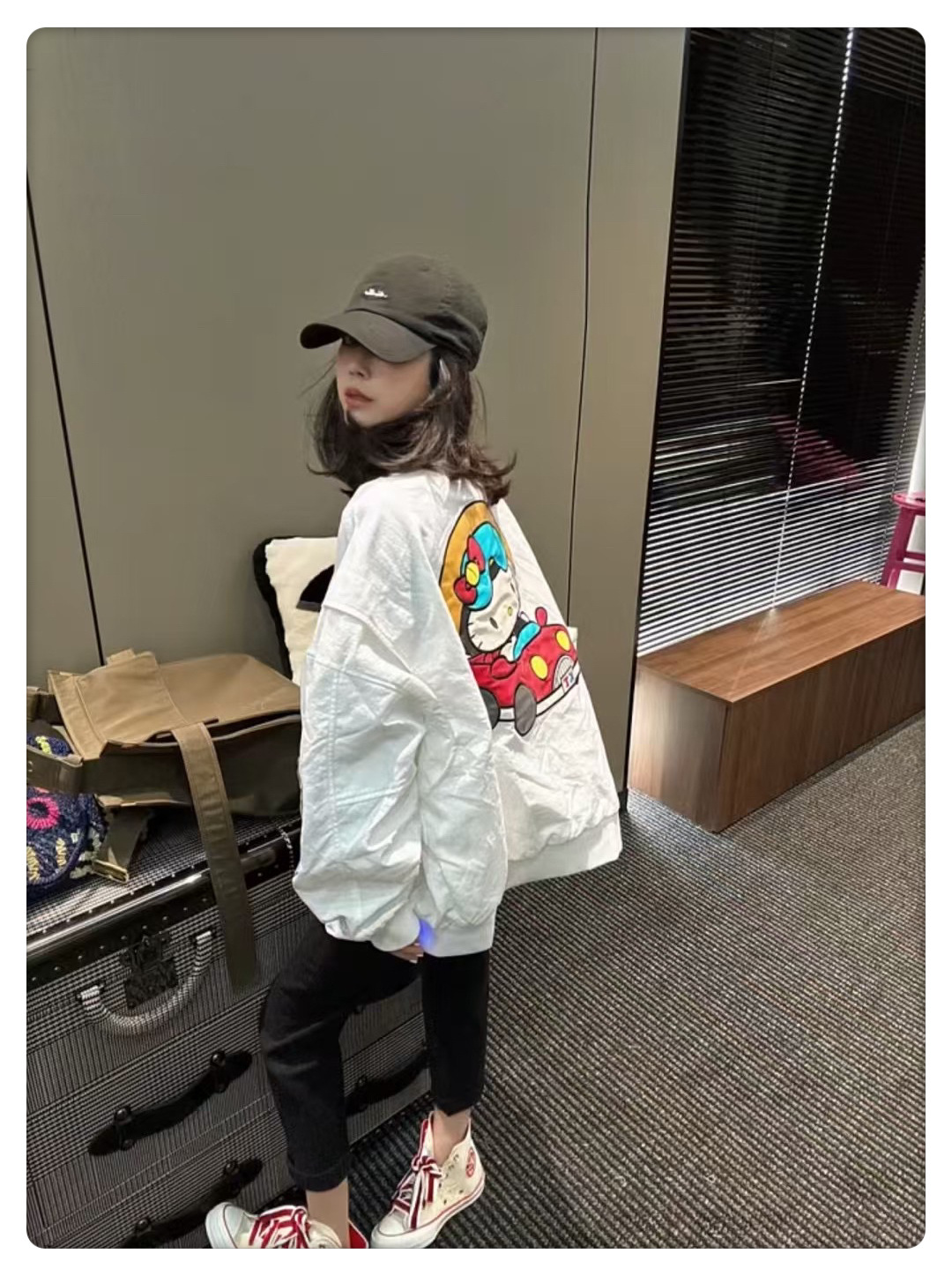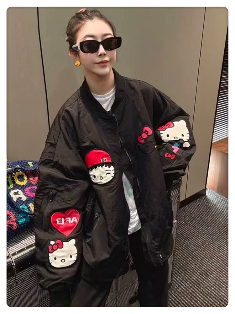 유럽 PU 가죽 자켓 여성의 2025 봄 새로운 블랙 무거운 자수 만화 고양이 느슨한 재킷 트렌디스토어 가기