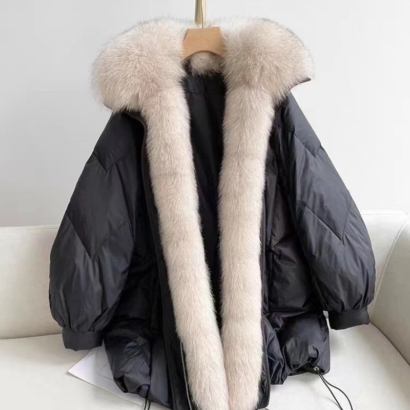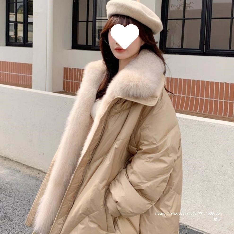 폭스 2024 모피 칼라 거위, 가죽 긴 중간 및 긴 느슨한 두꺼운 다운 재킷 겨울 새로운 코트 흰색 직접 판매스토어 가기