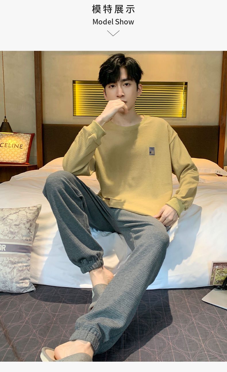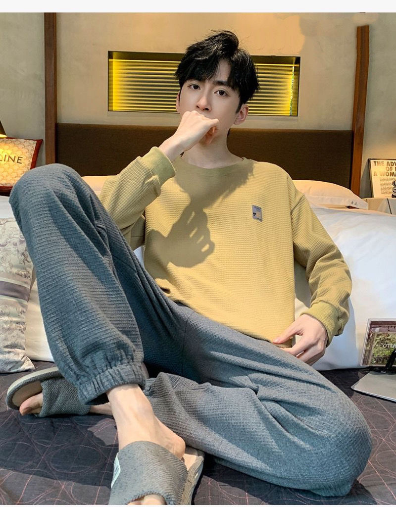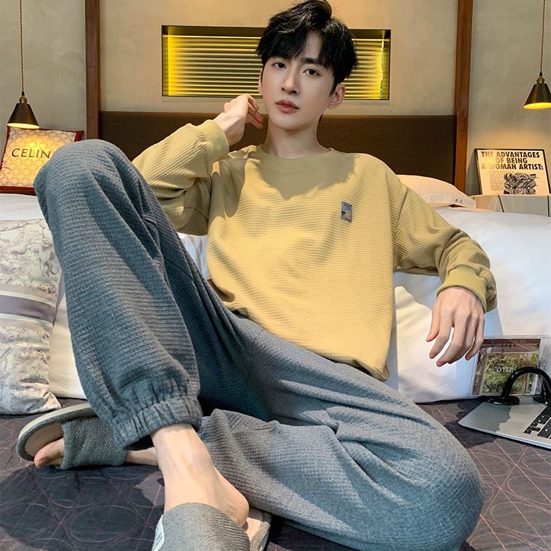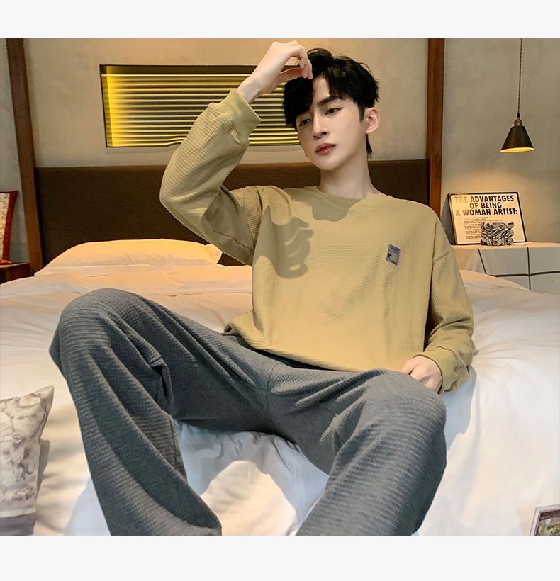 와플 파자마 남자 봄과 가을 긴 소매 바지 둥근 목 세트 청소년과 소년 간단한 느슨한 홈 옷스토어 가기