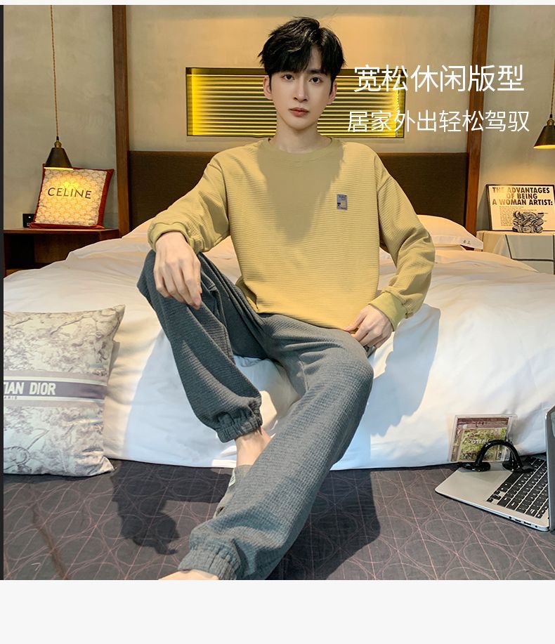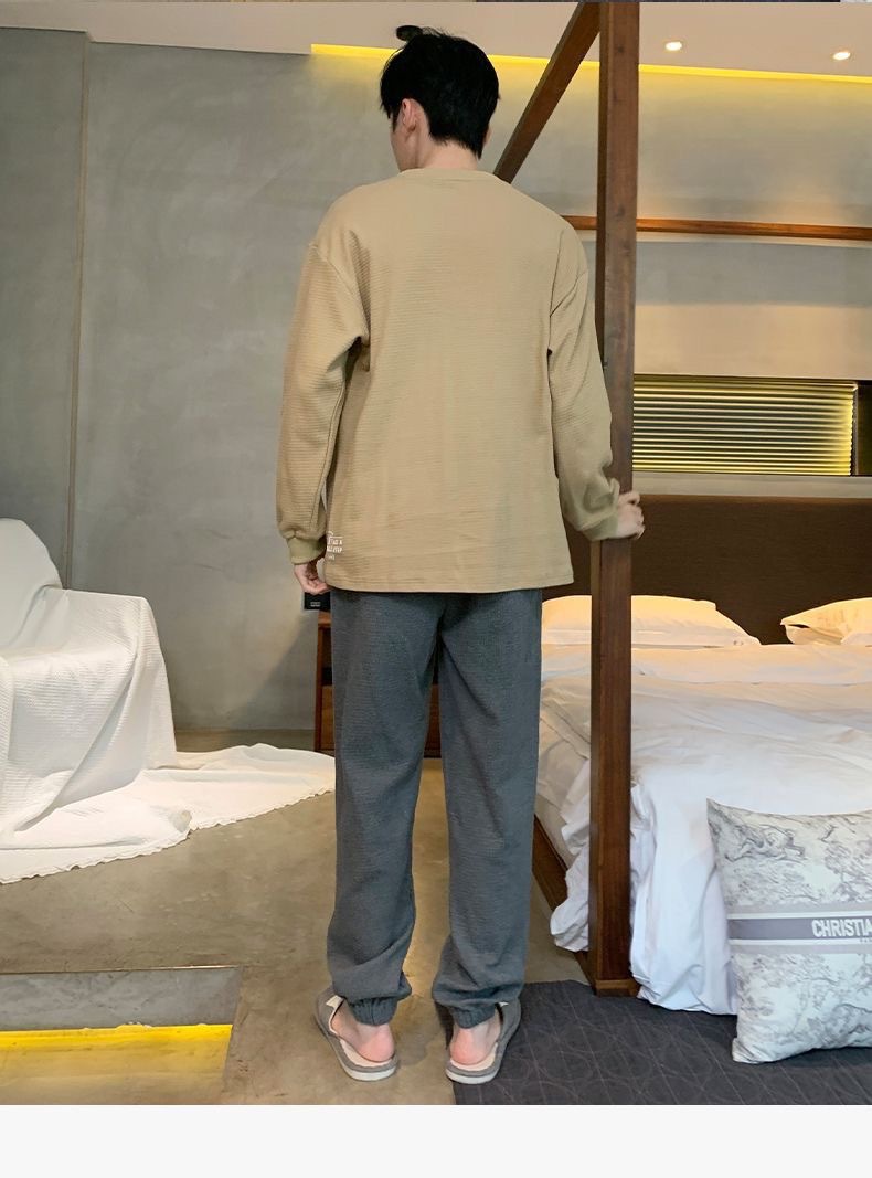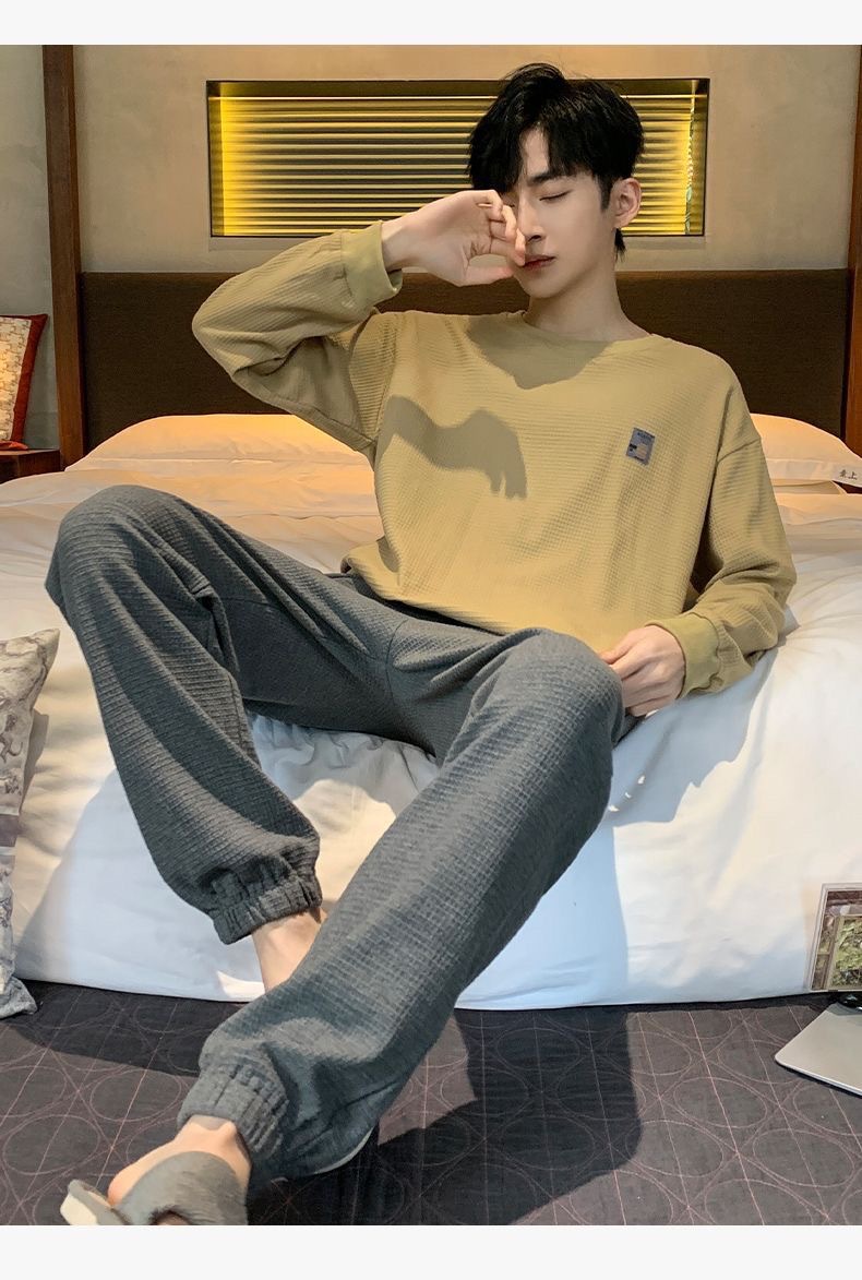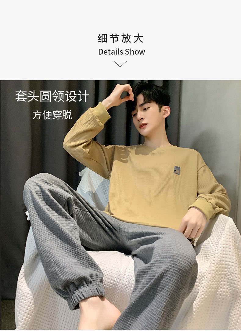 와플 파자마 남자 봄과 가을 긴 소매 바지 둥근 목 세트 청소년과 소년 간단한 느슨한 홈 옷스토어 가기