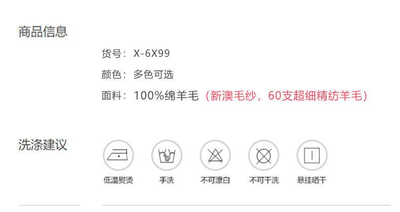 面料成份:绵羊毛(新澳毛纱,90毛条60支超细精纺羊毛,薄款)