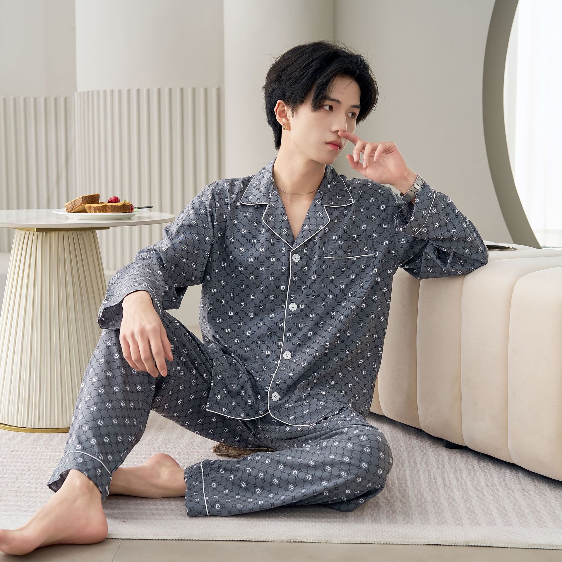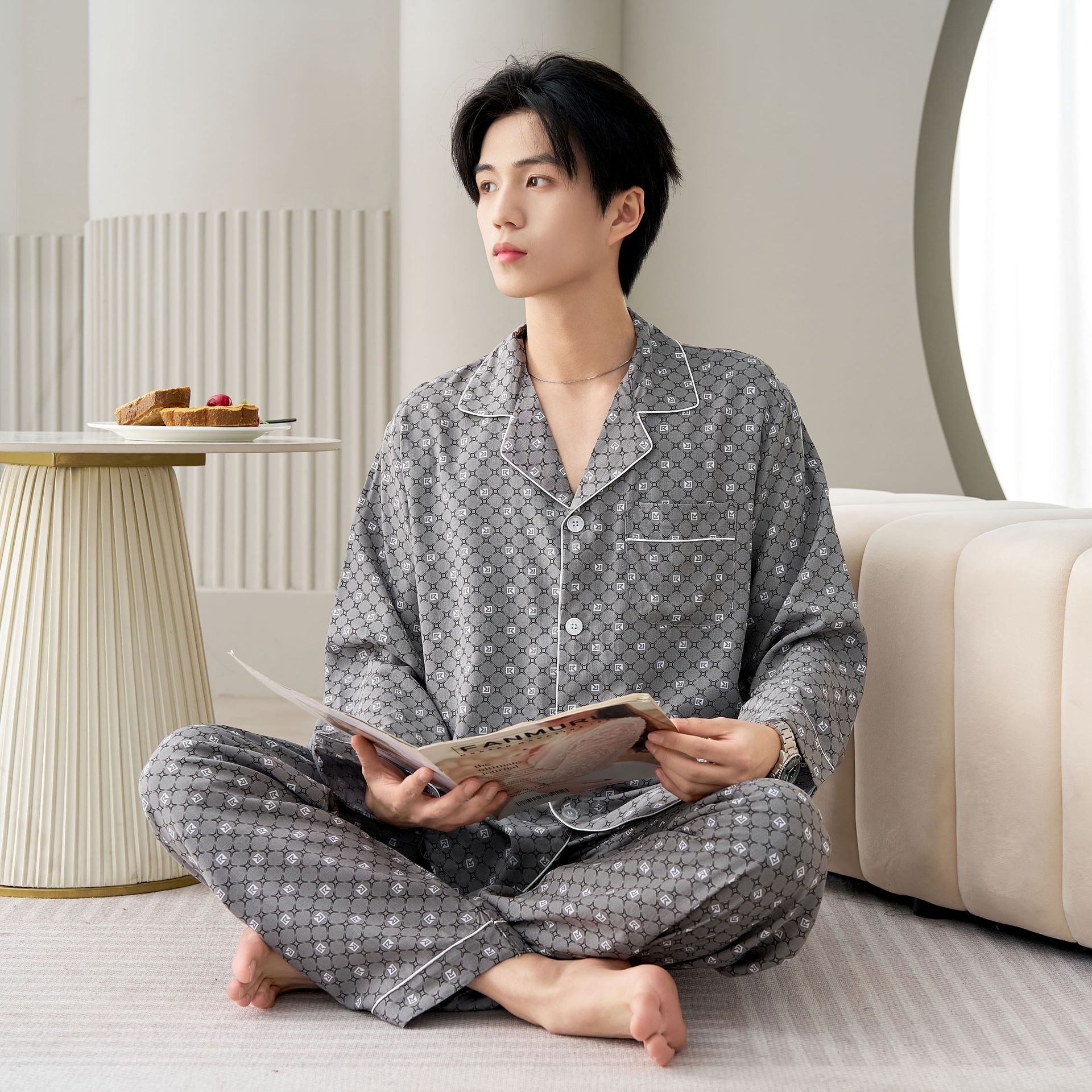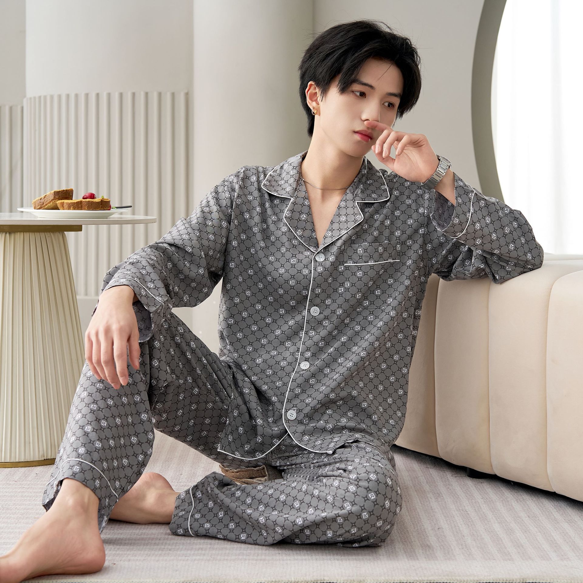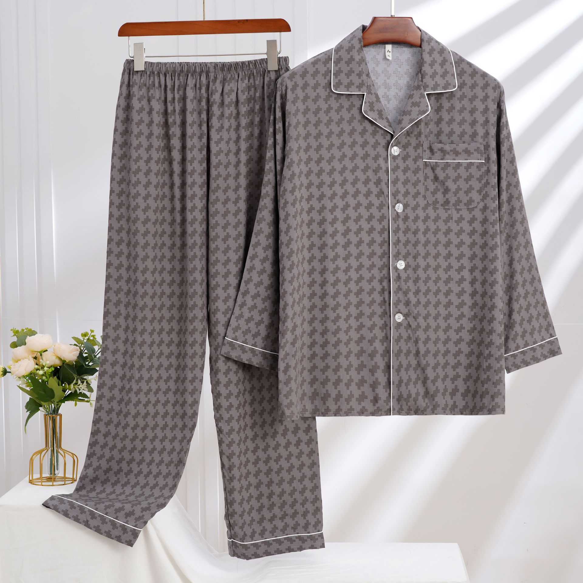 2025 새로운 재고 남성면 실크 봄 여름 가을 긴 소매 얇은 느슨한 잠옷 간단한 편안한 홈 옷