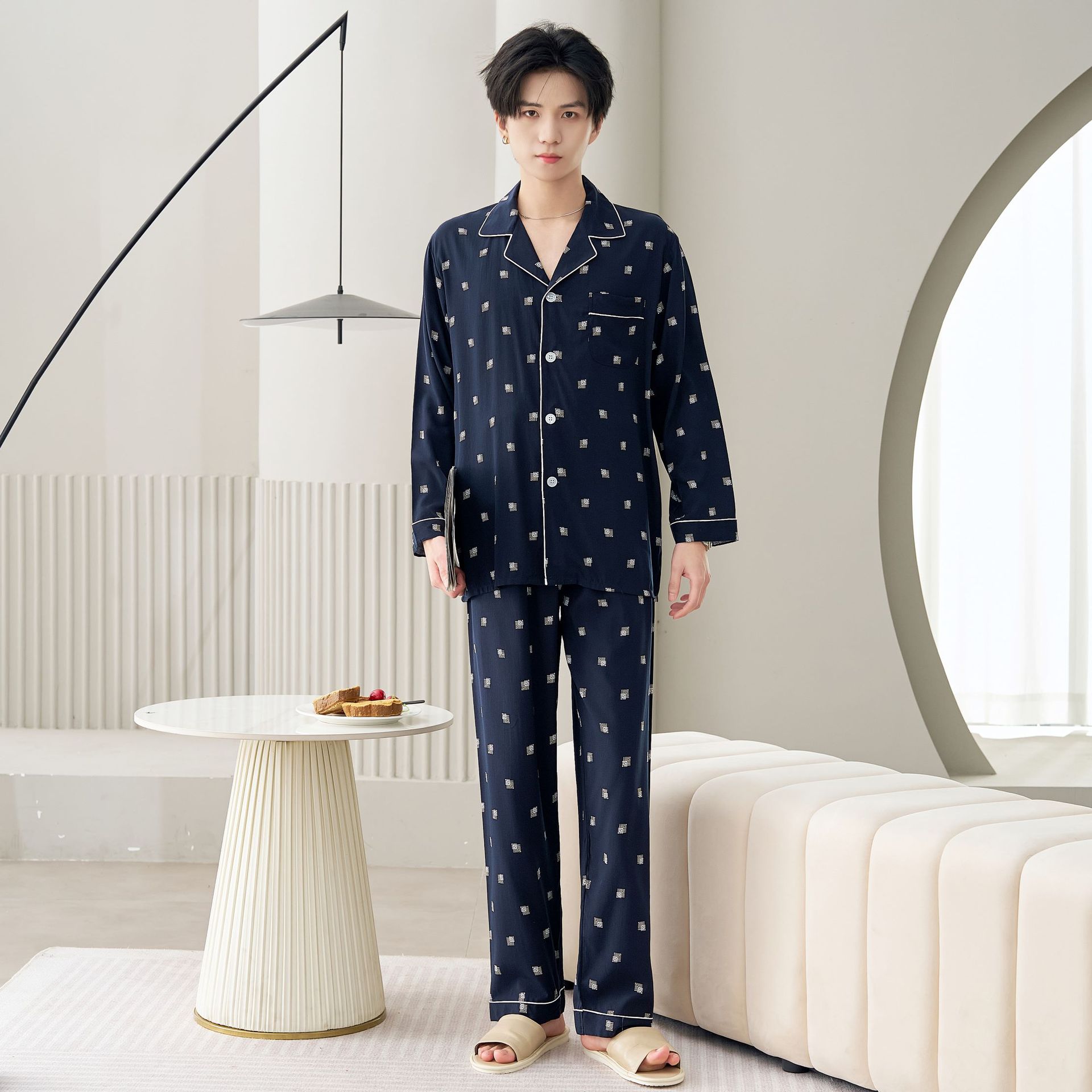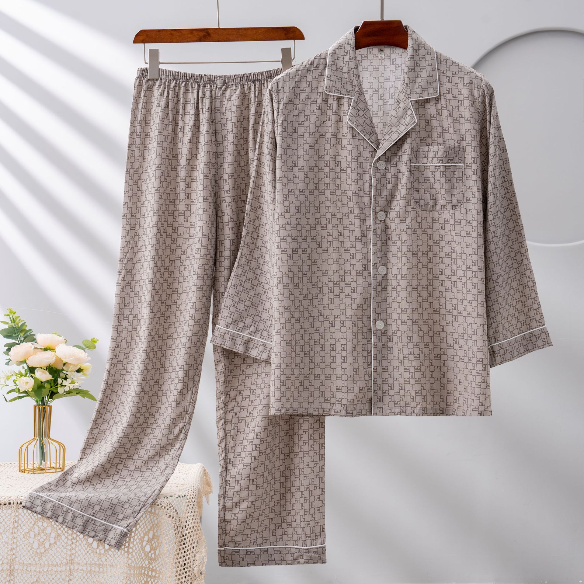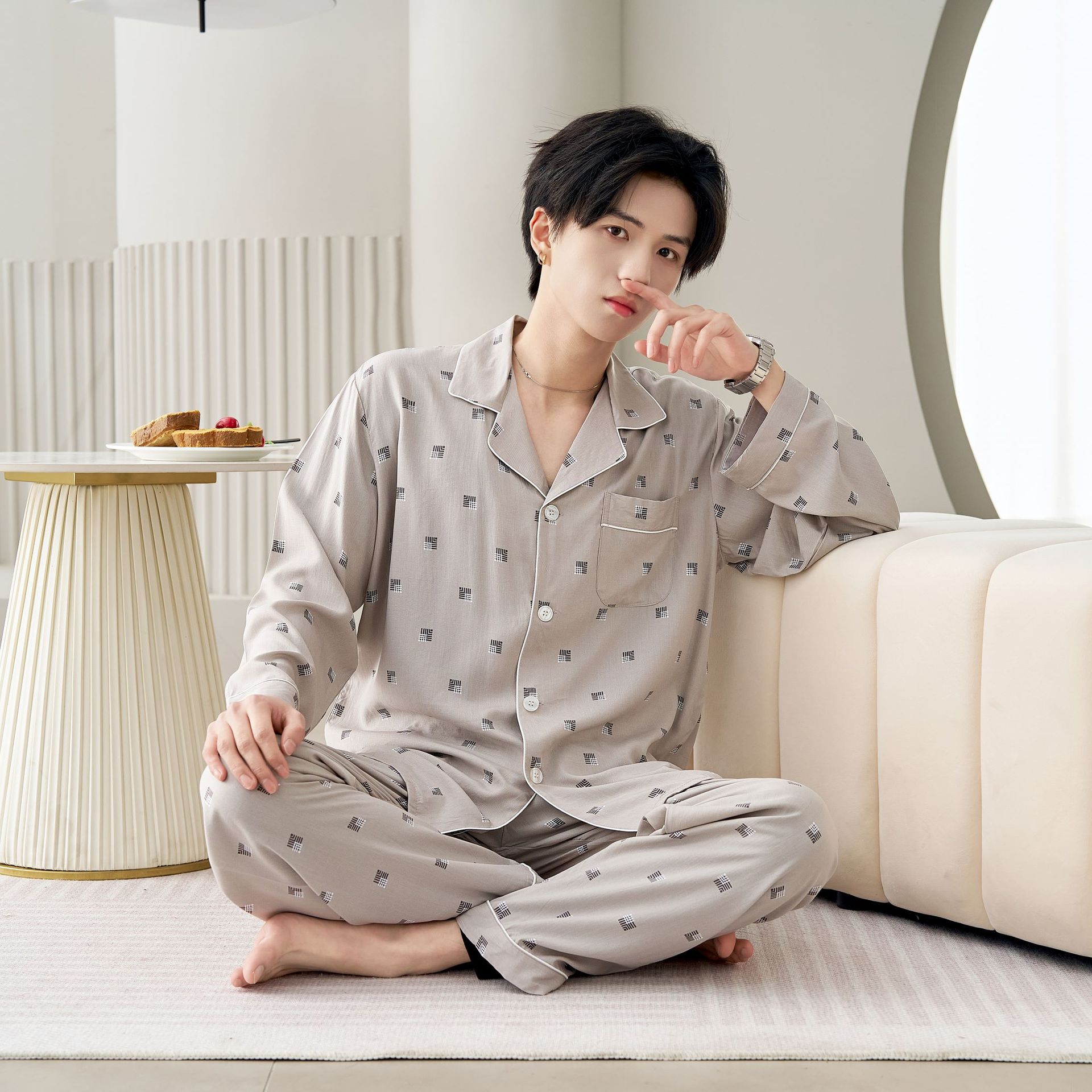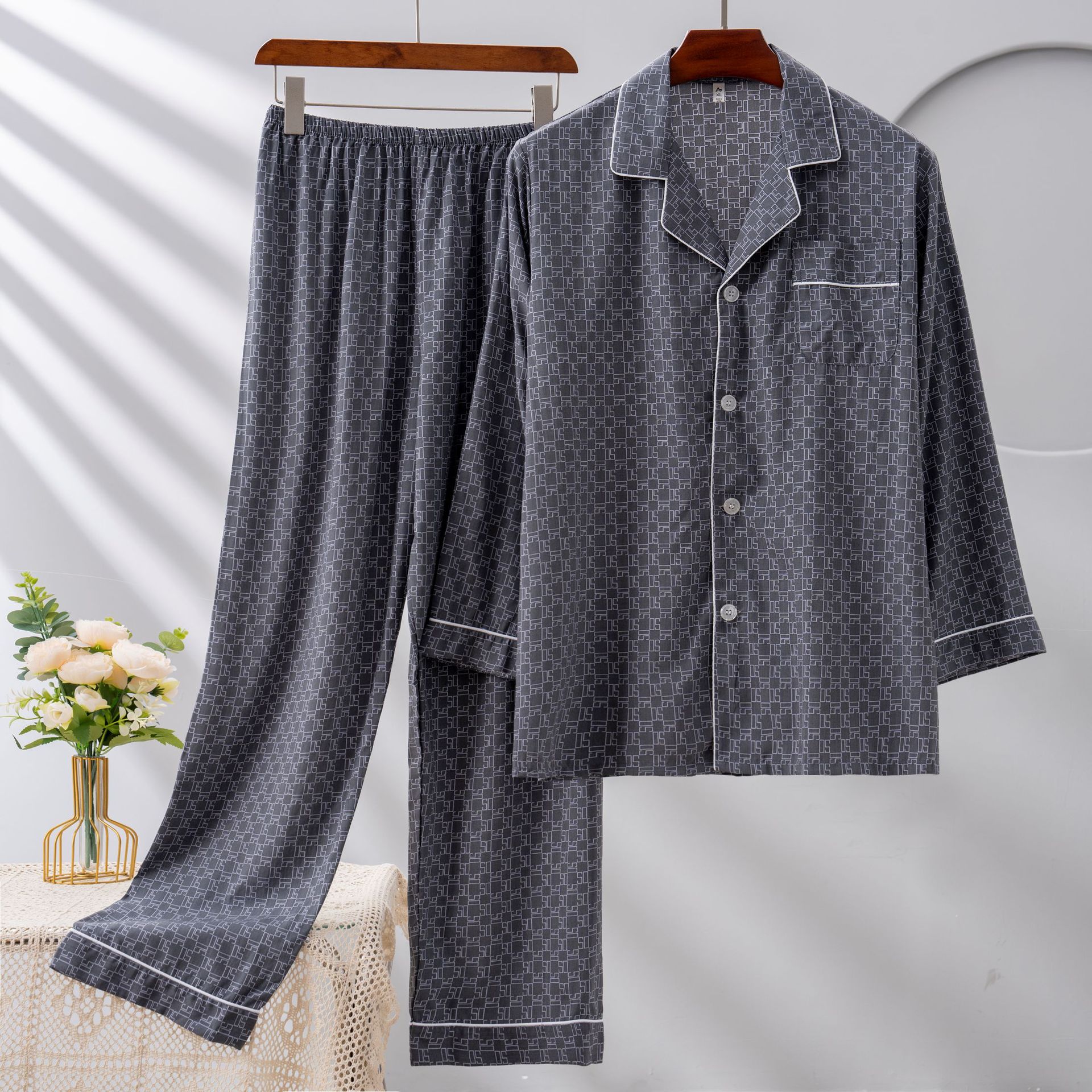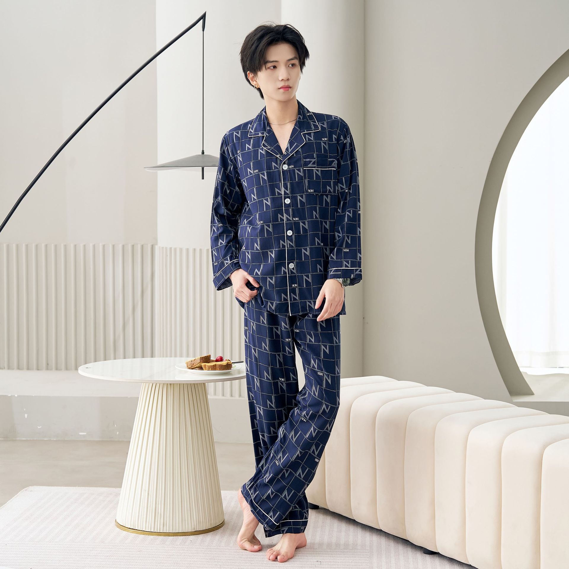 2025 새로운 재고 남성면 실크 봄 여름 가을 긴 소매 얇은 느슨한 잠옷 간단한 편안한 홈 옷
