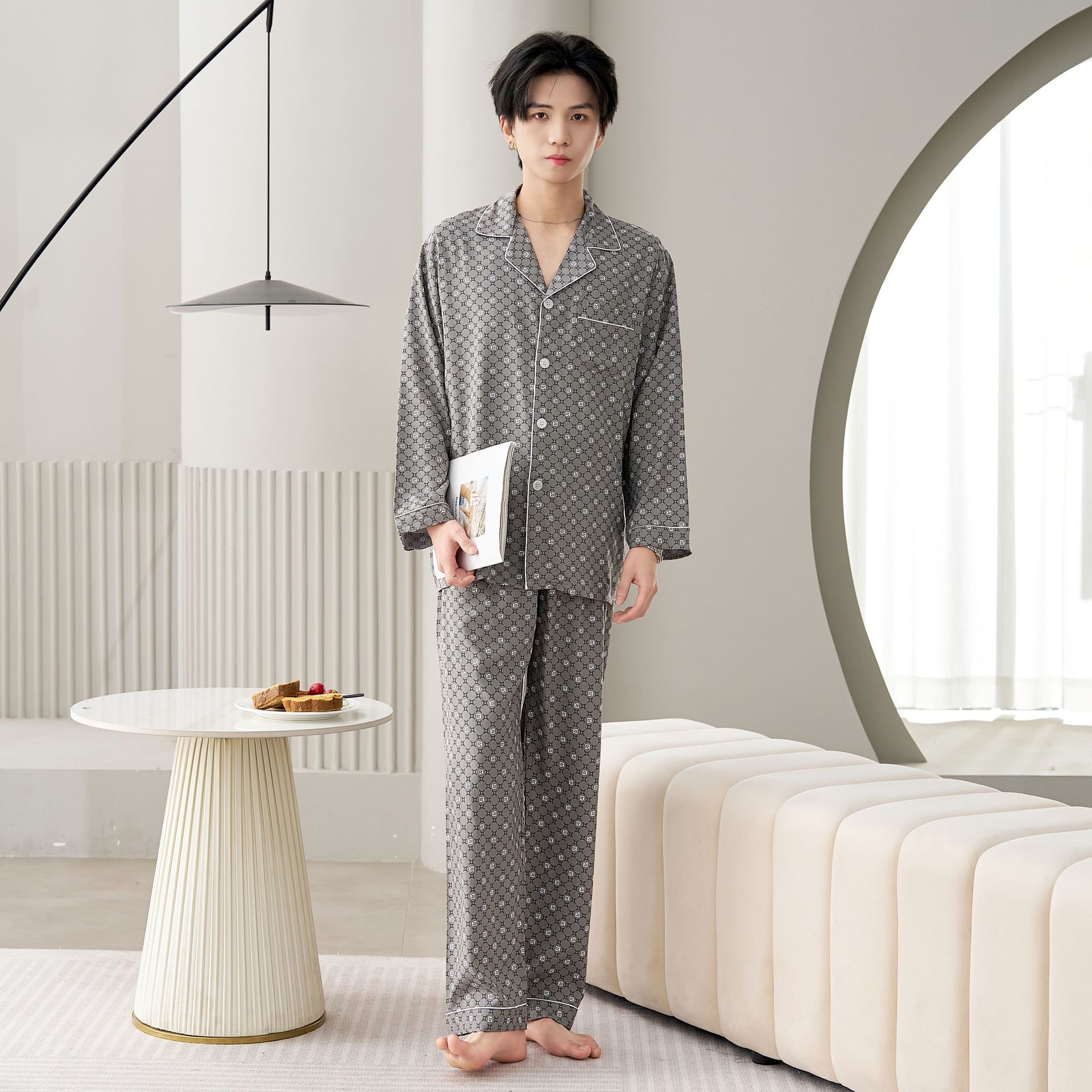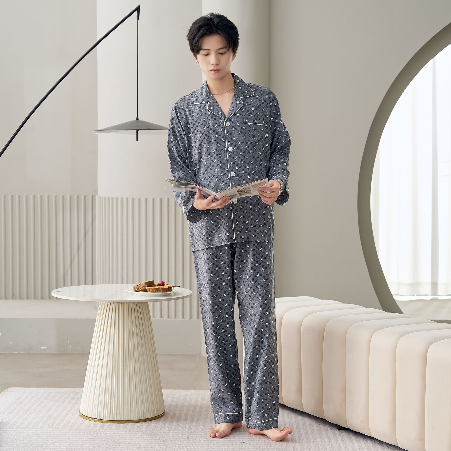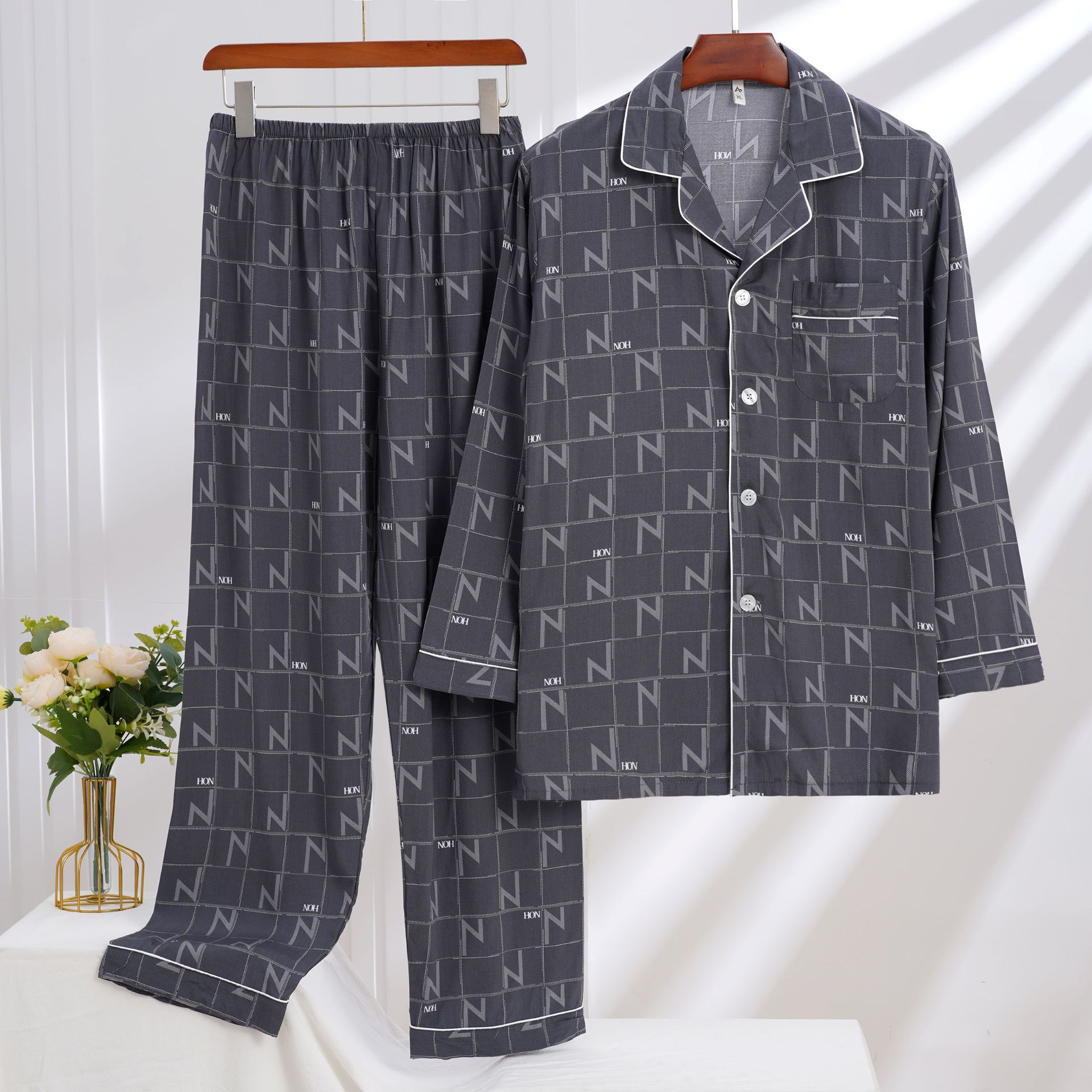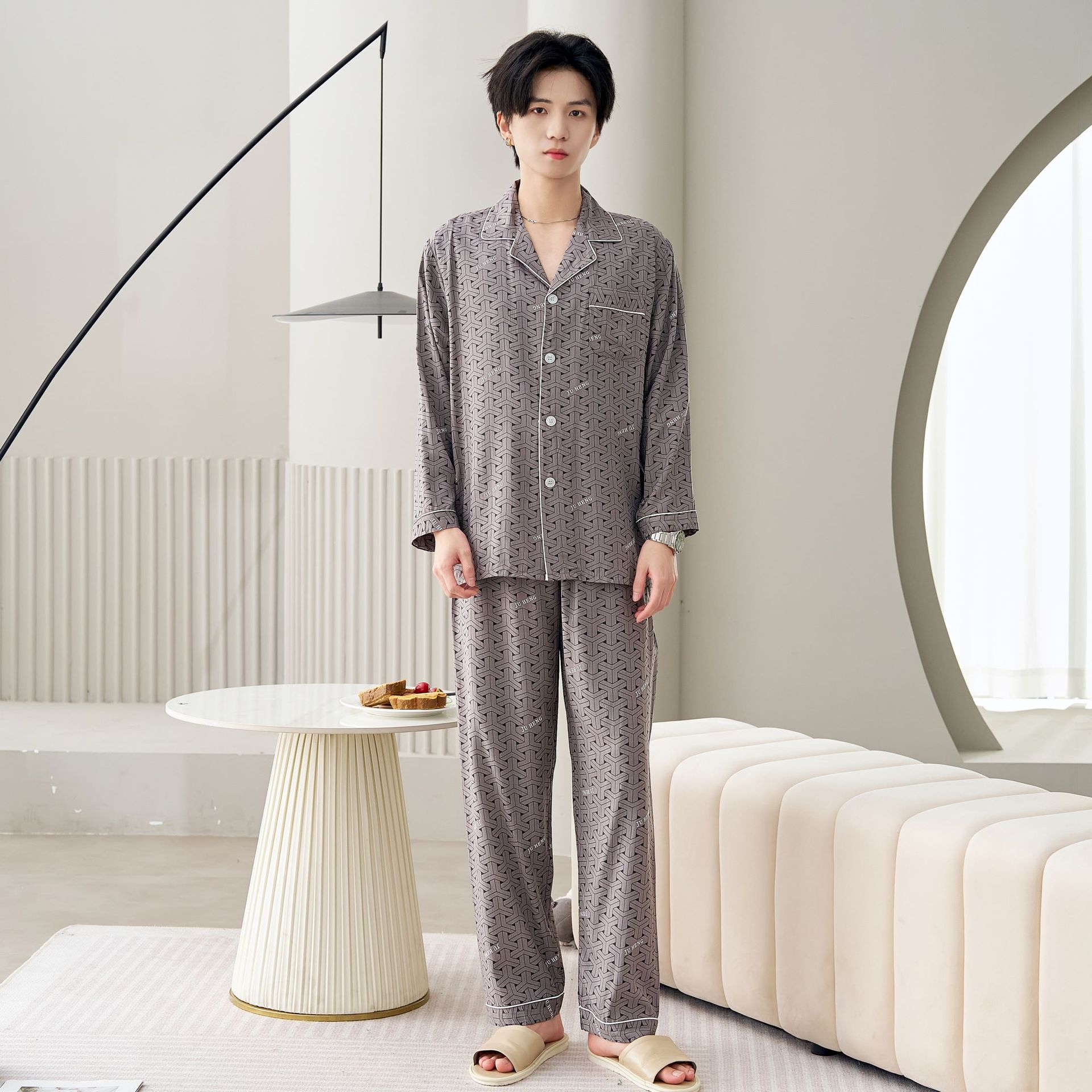 2025 새로운 재고 남성면 실크 봄 여름 가을 긴 소매 얇은 느슨한 잠옷 간단한 편안한 홈 옷