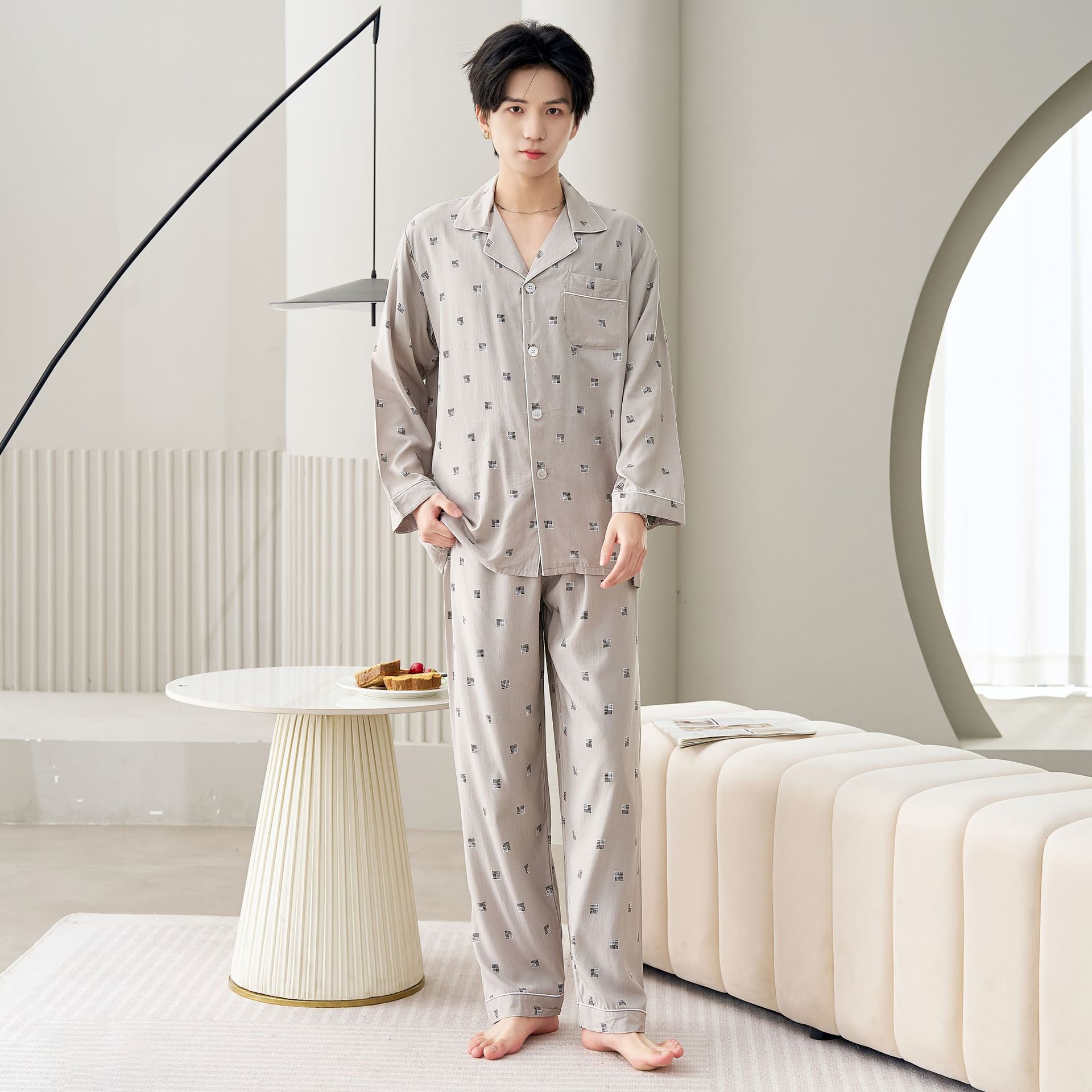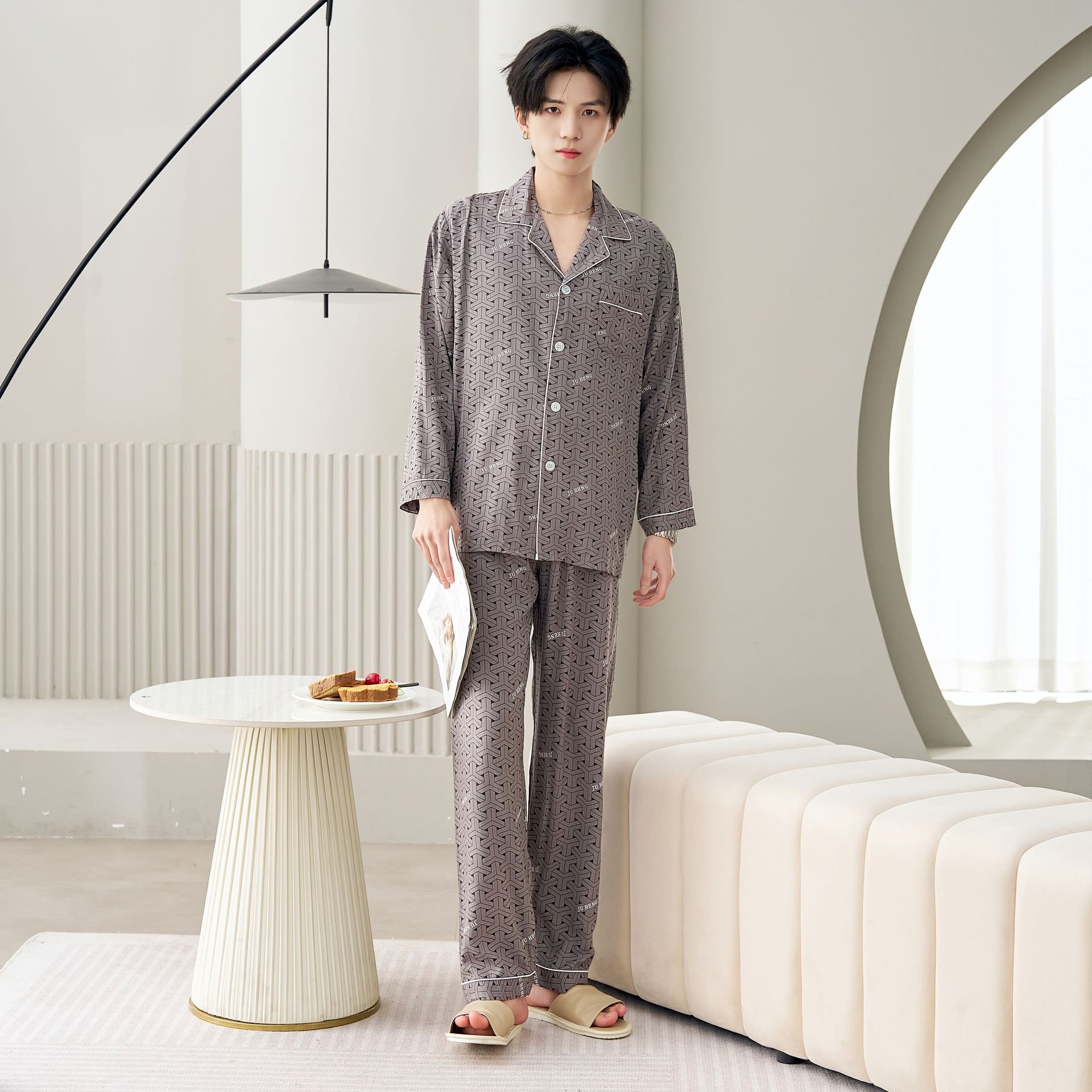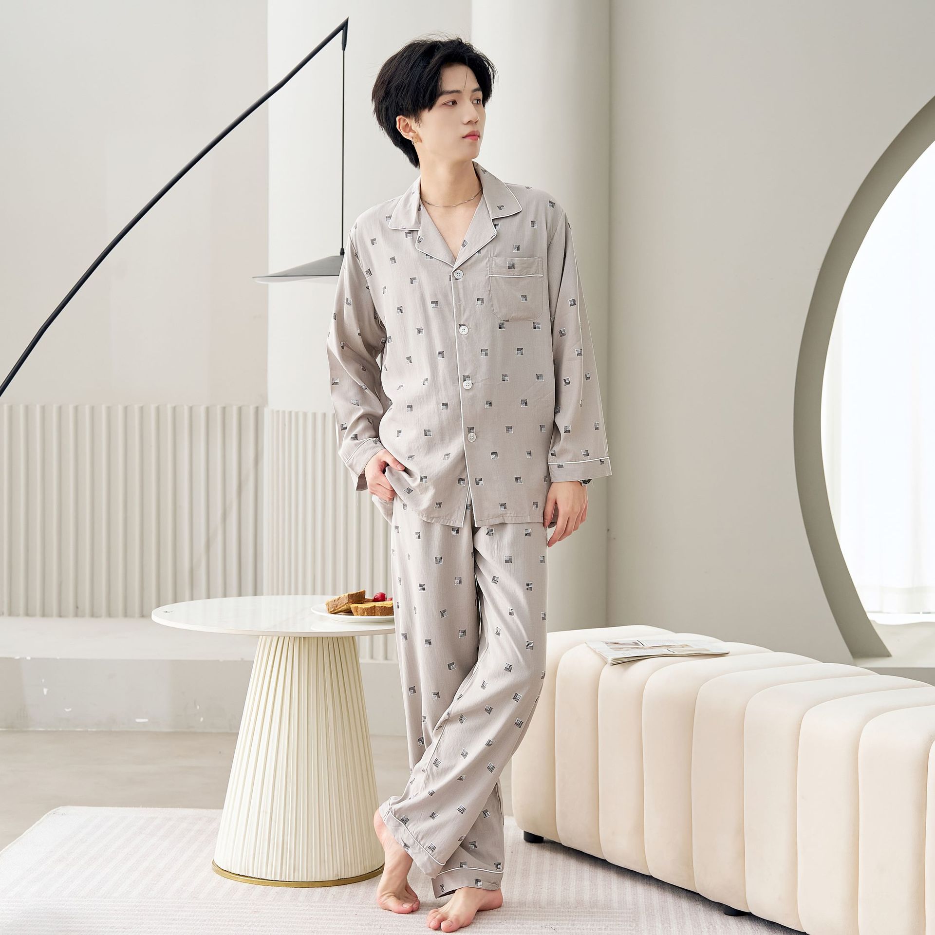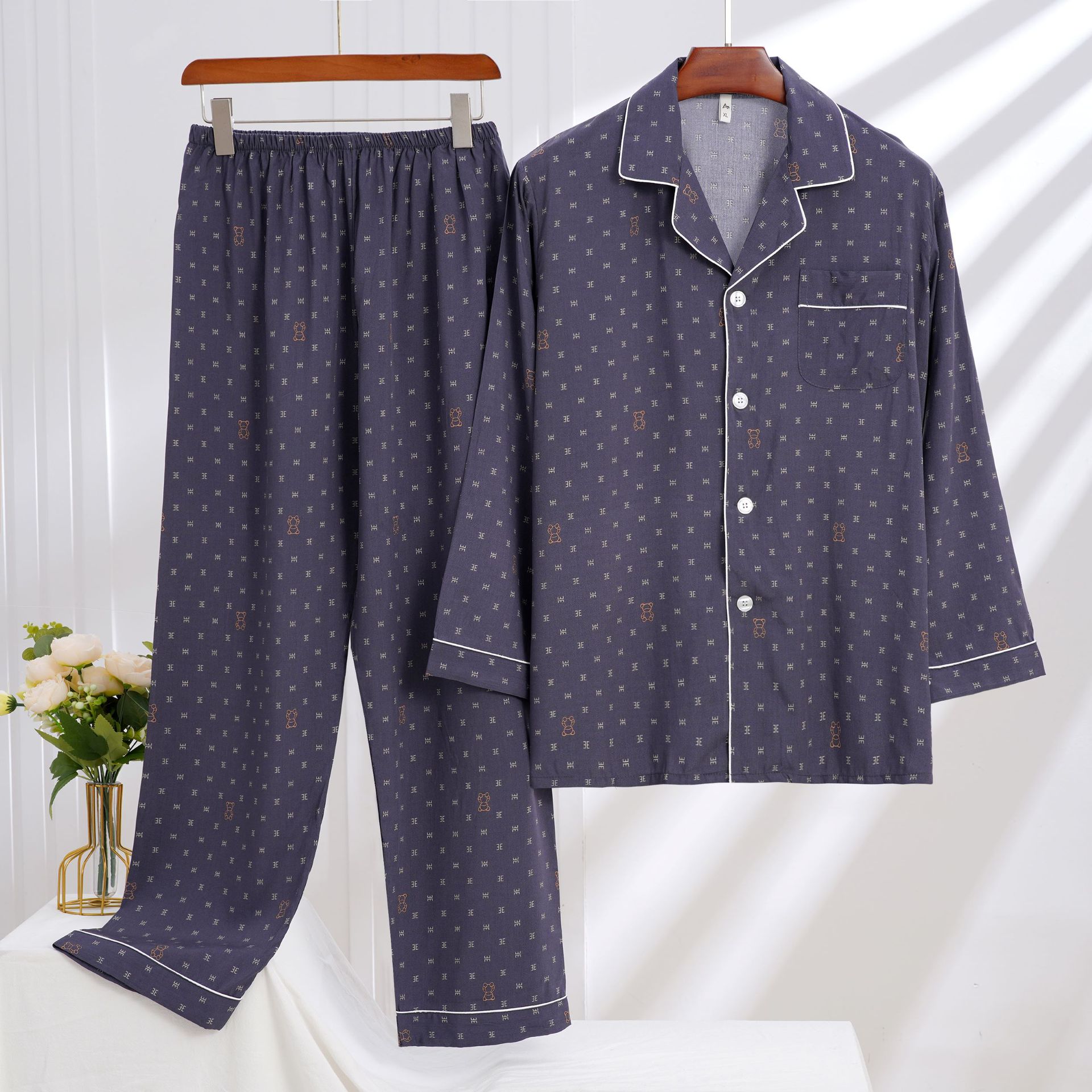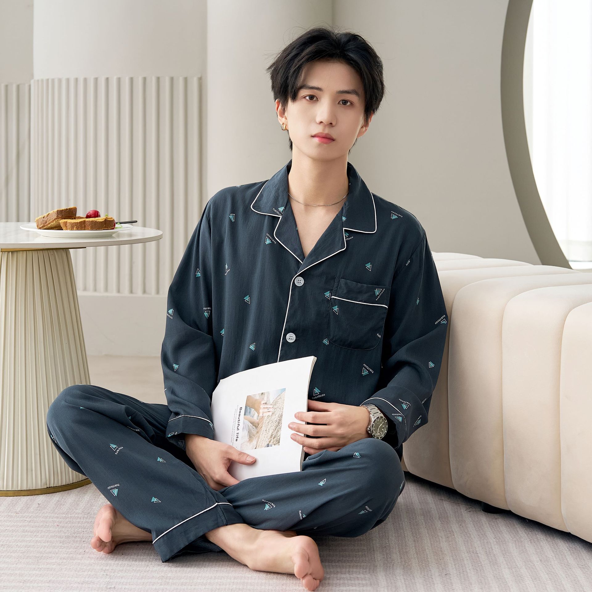 2025 새로운 재고 남성면 실크 봄 여름 가을 긴 소매 얇은 느슨한 잠옷 간단한 편안한 홈 옷