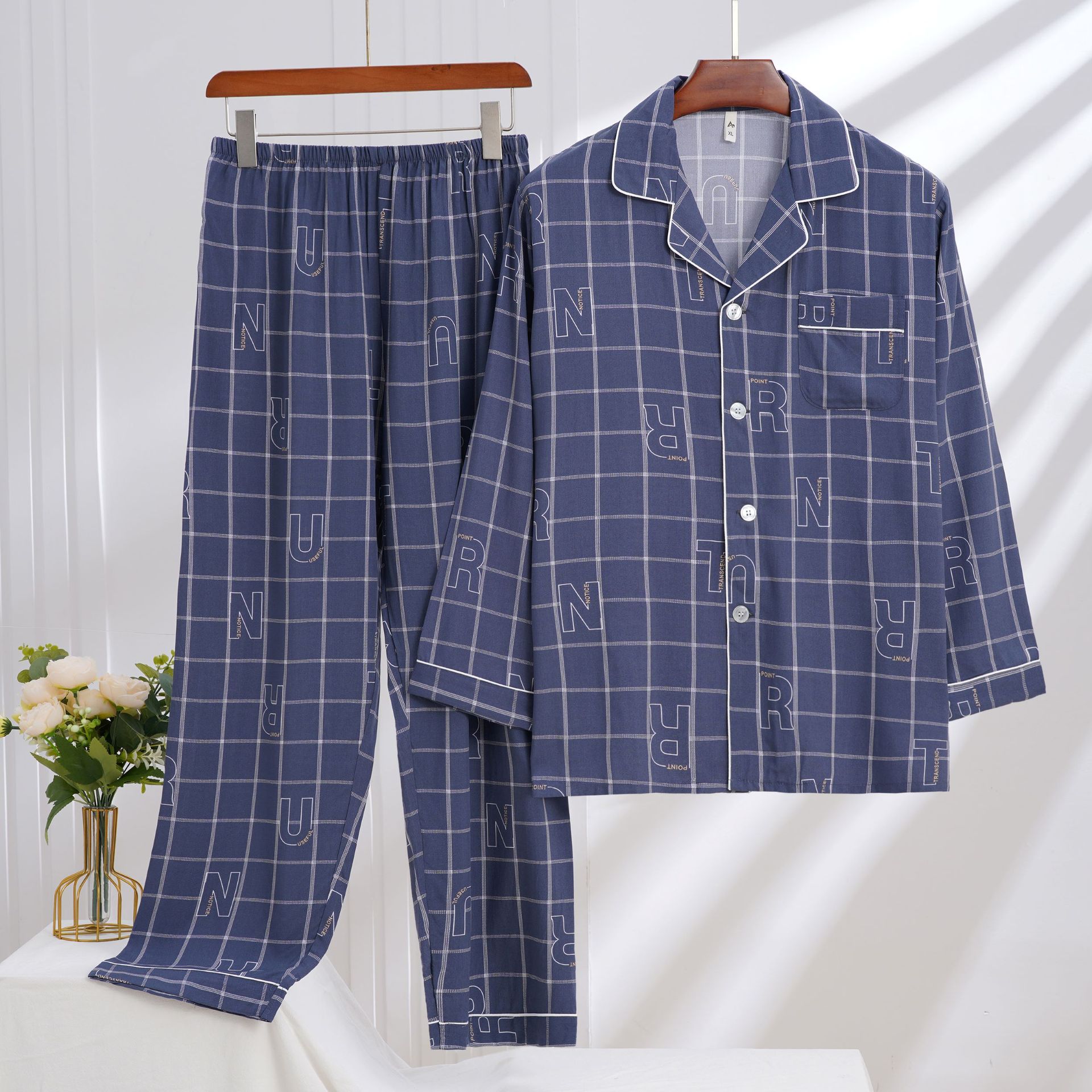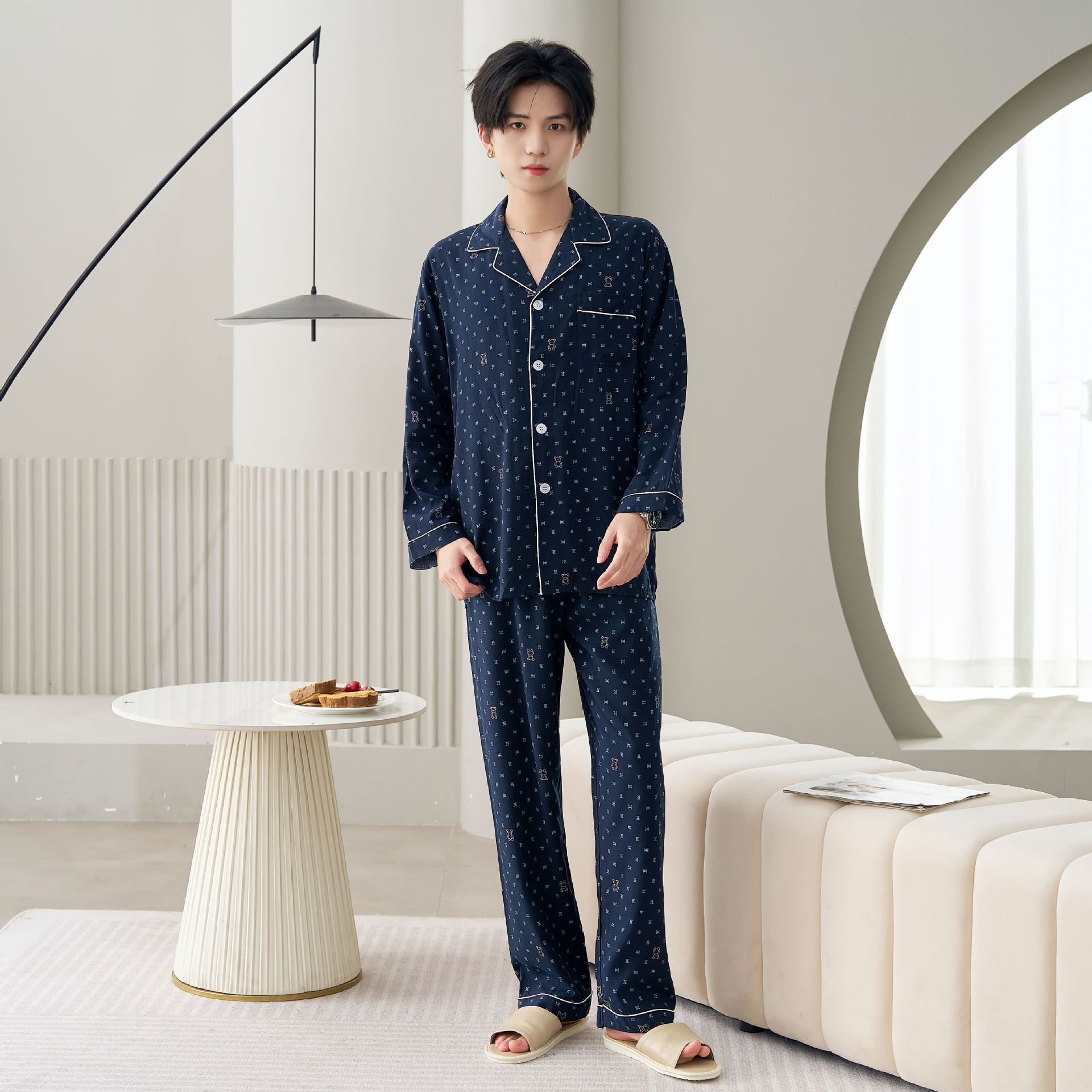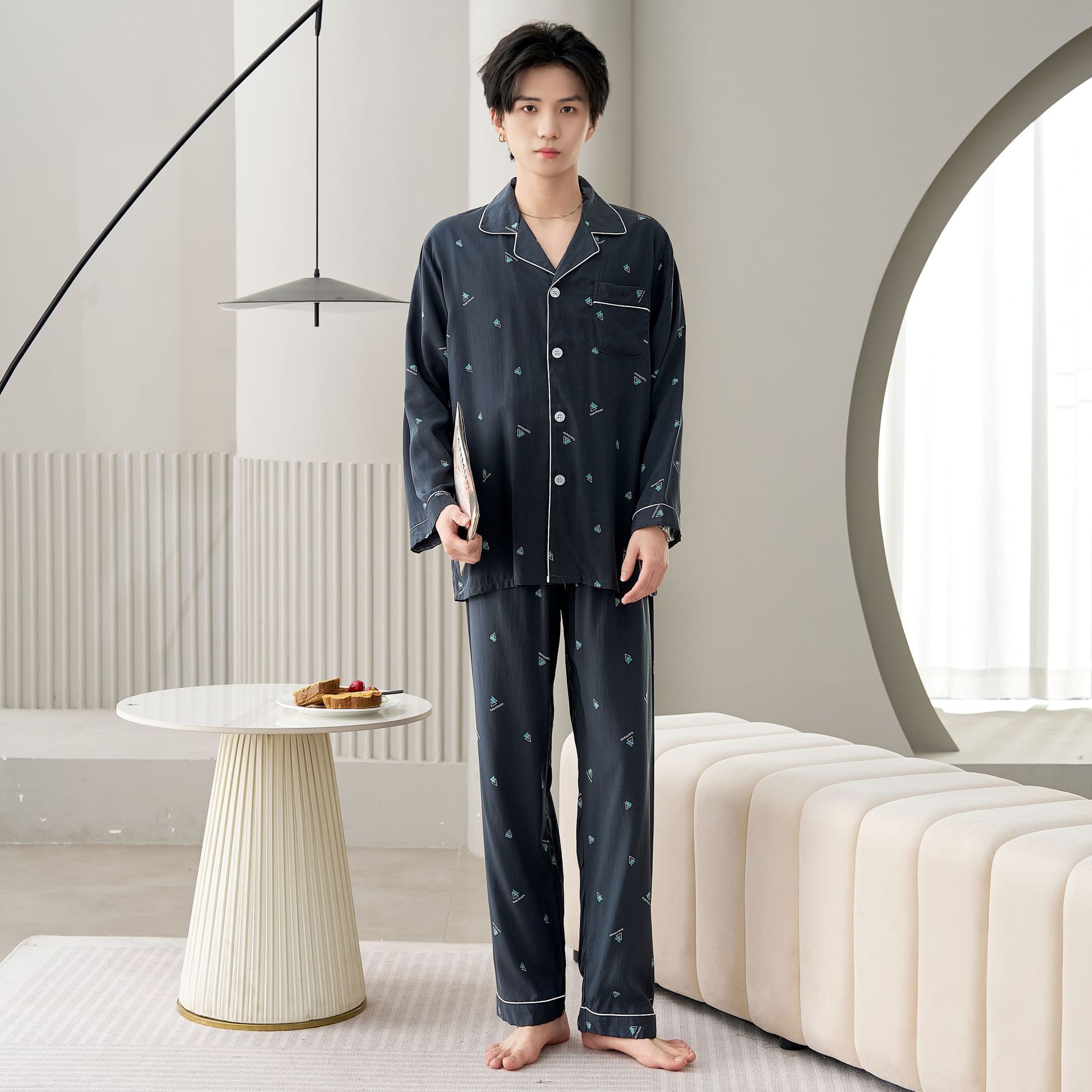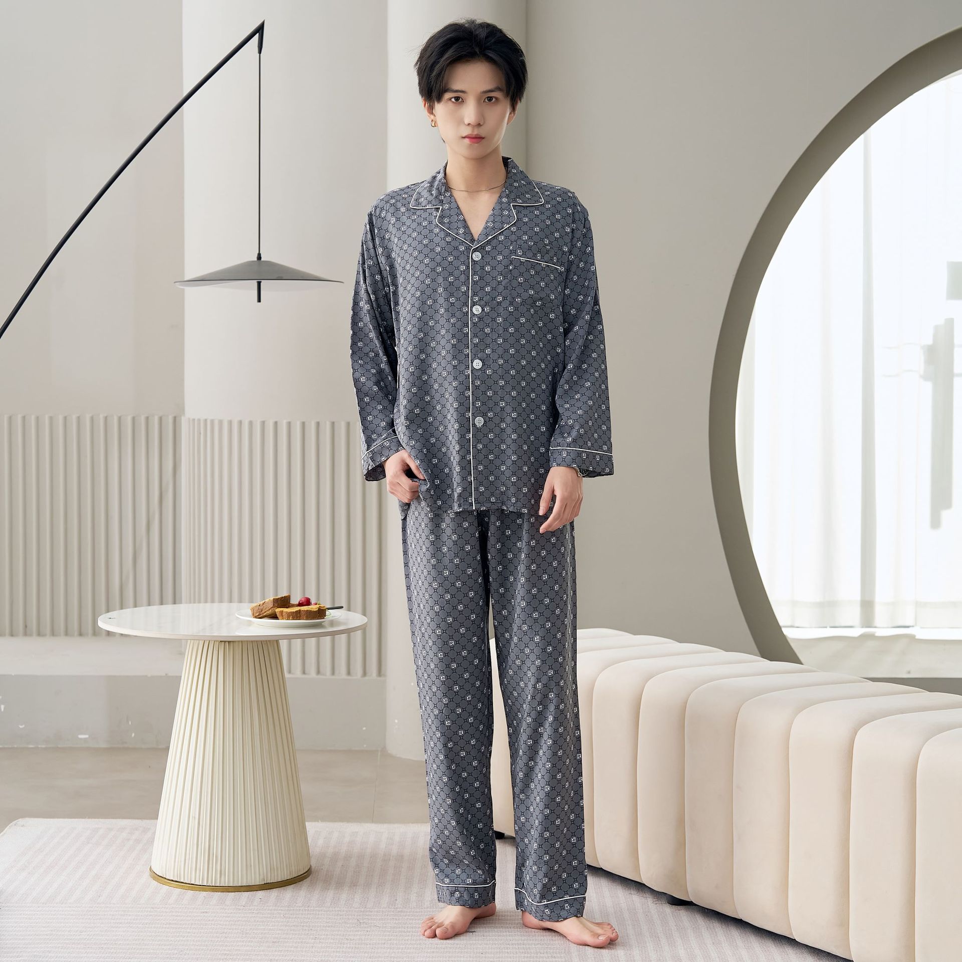 2025 새로운 재고 남성면 실크 봄 여름 가을 긴 소매 얇은 느슨한 잠옷 간단한 편안한 홈 옷