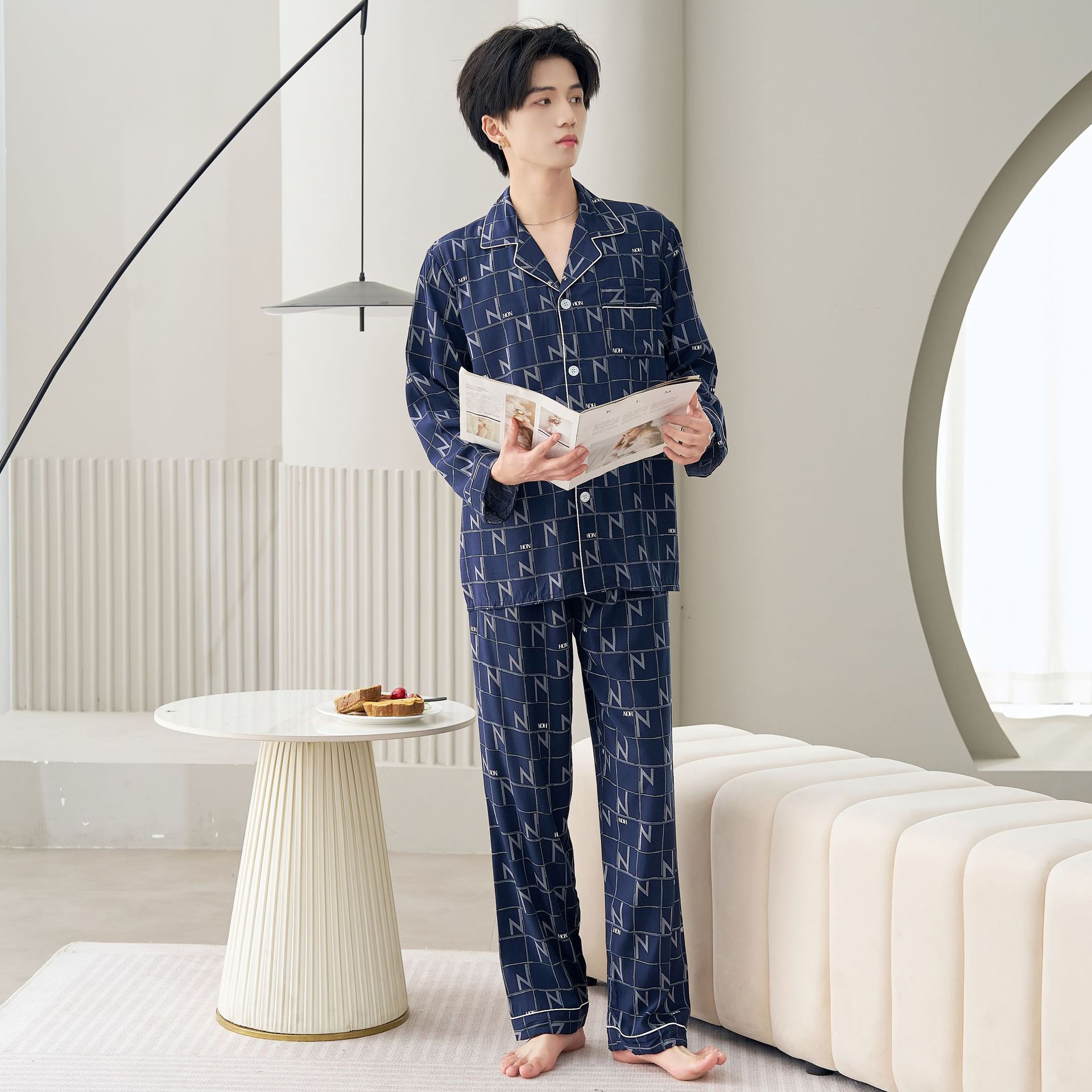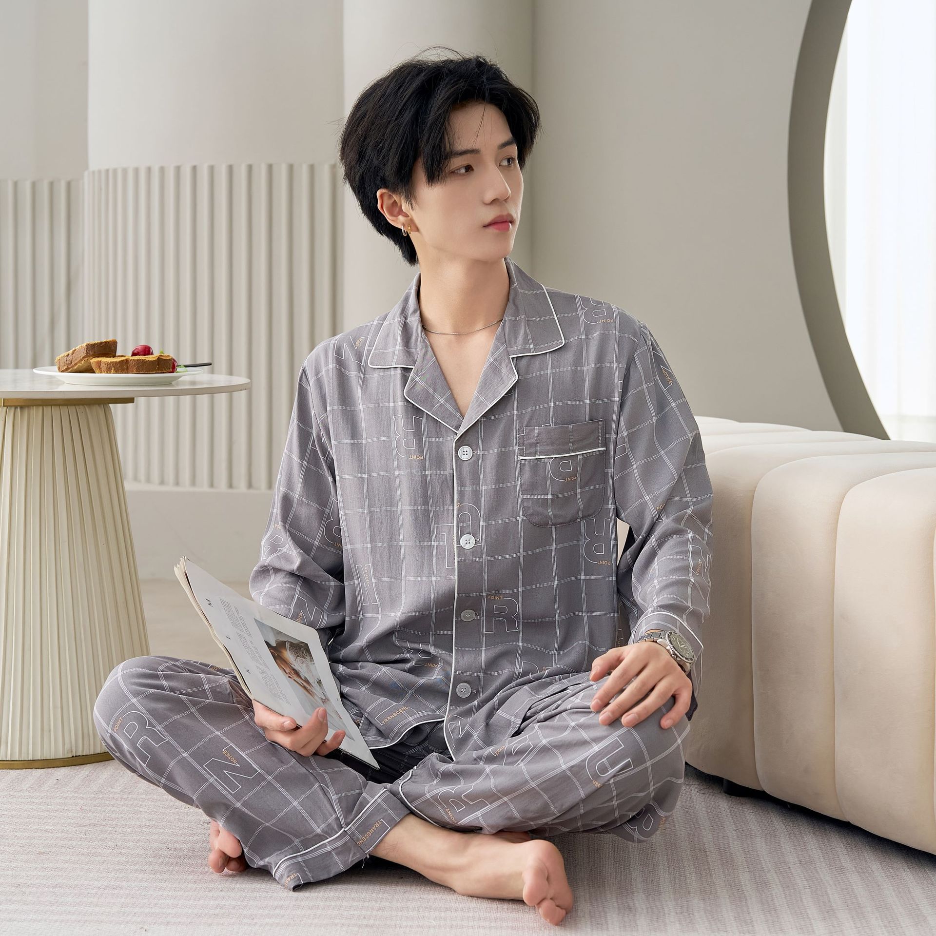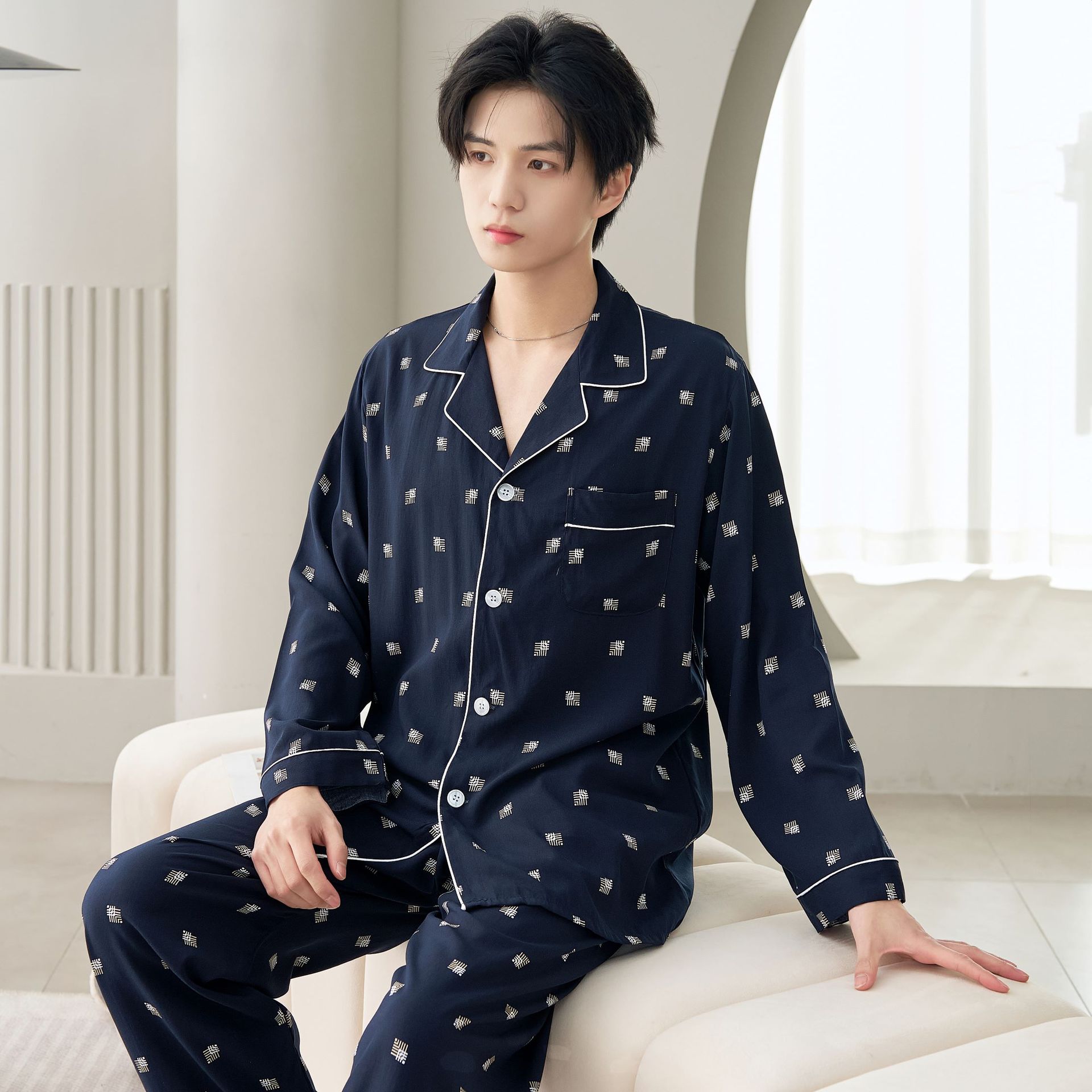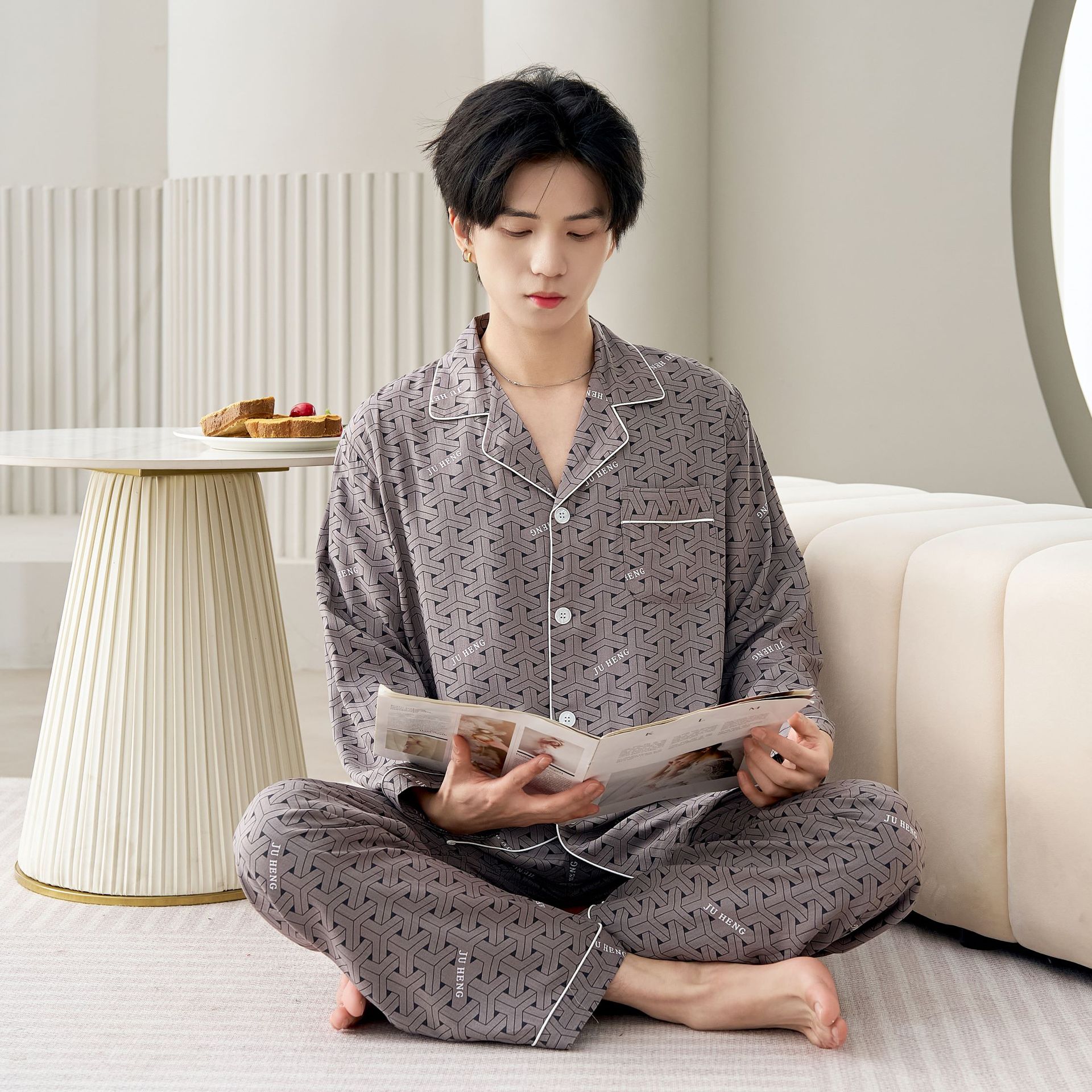 2025 새로운 재고 남성면 실크 봄 여름 가을 긴 소매 얇은 느슨한 잠옷 간단한 편안한 홈 옷스토어 가기