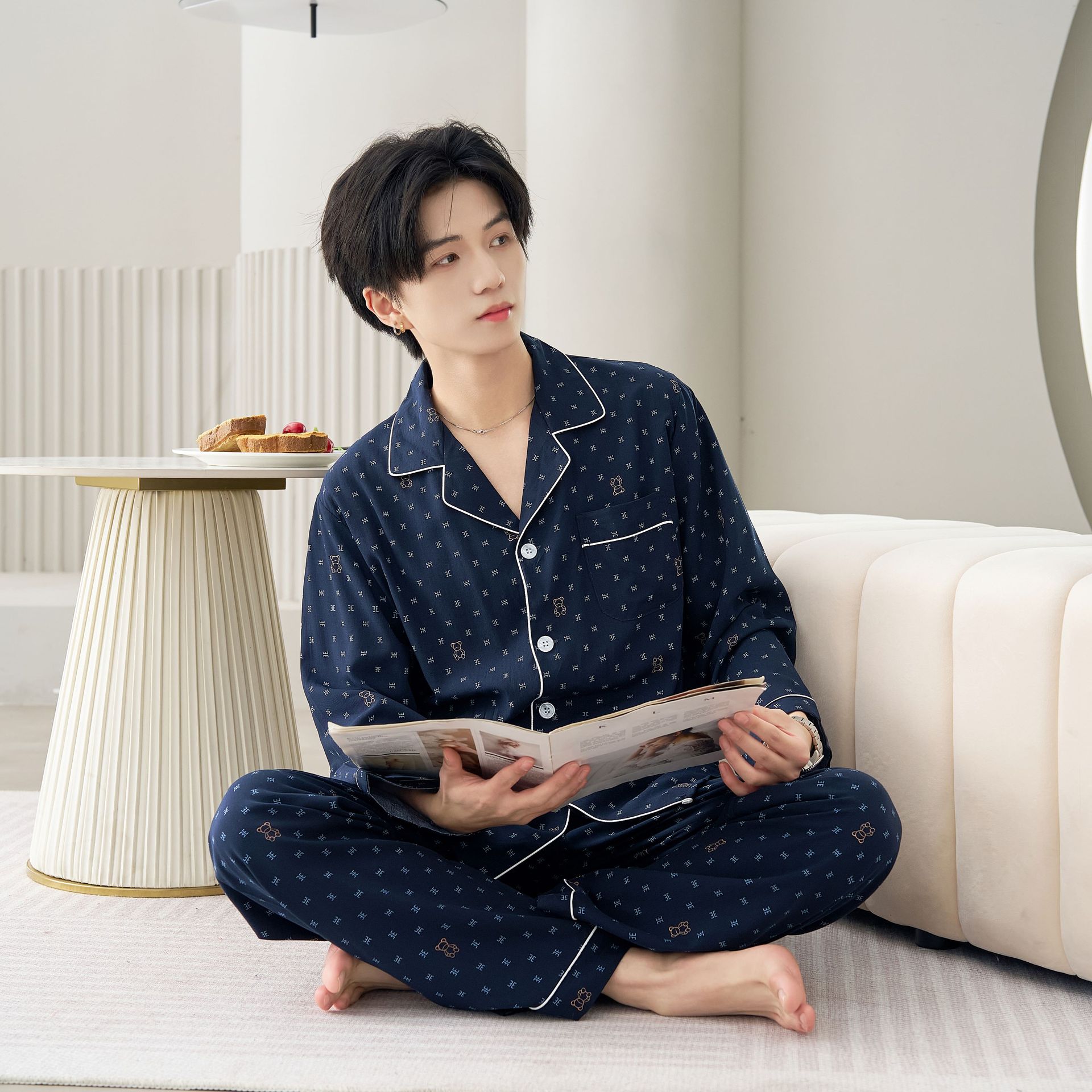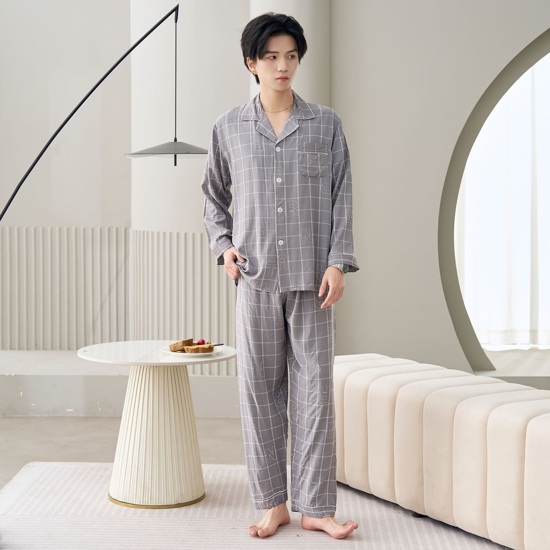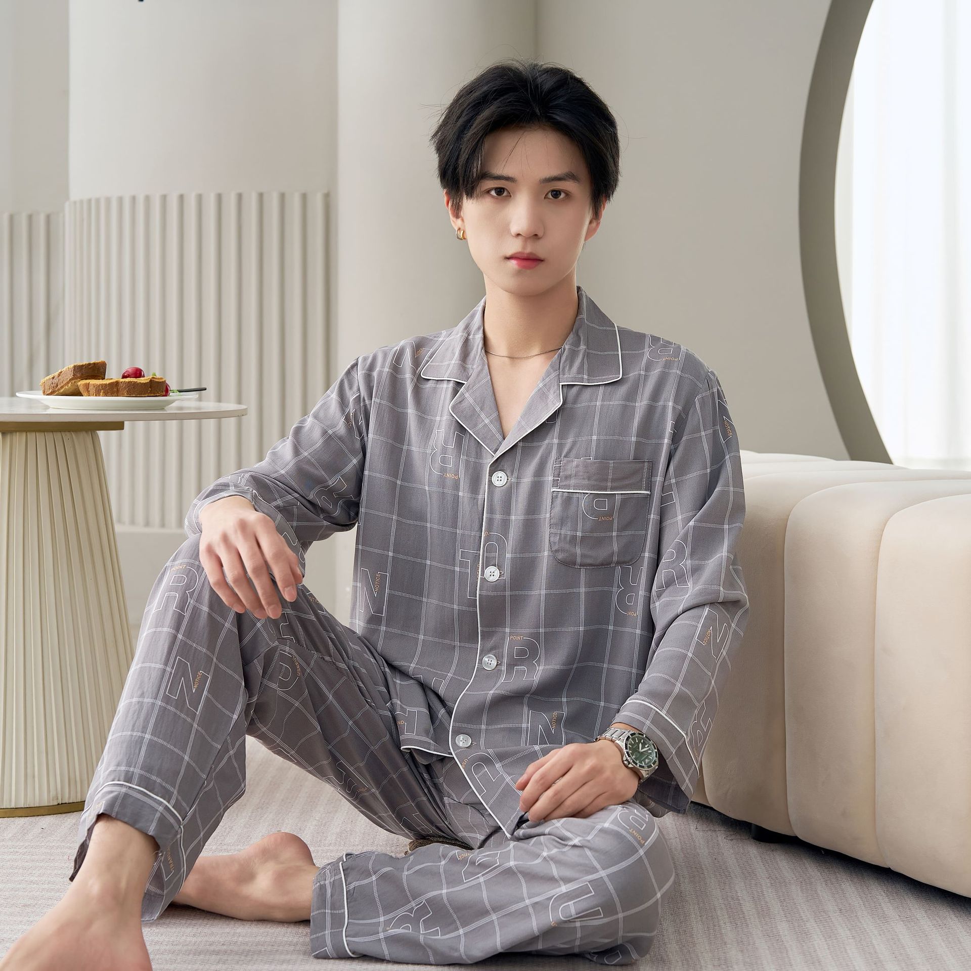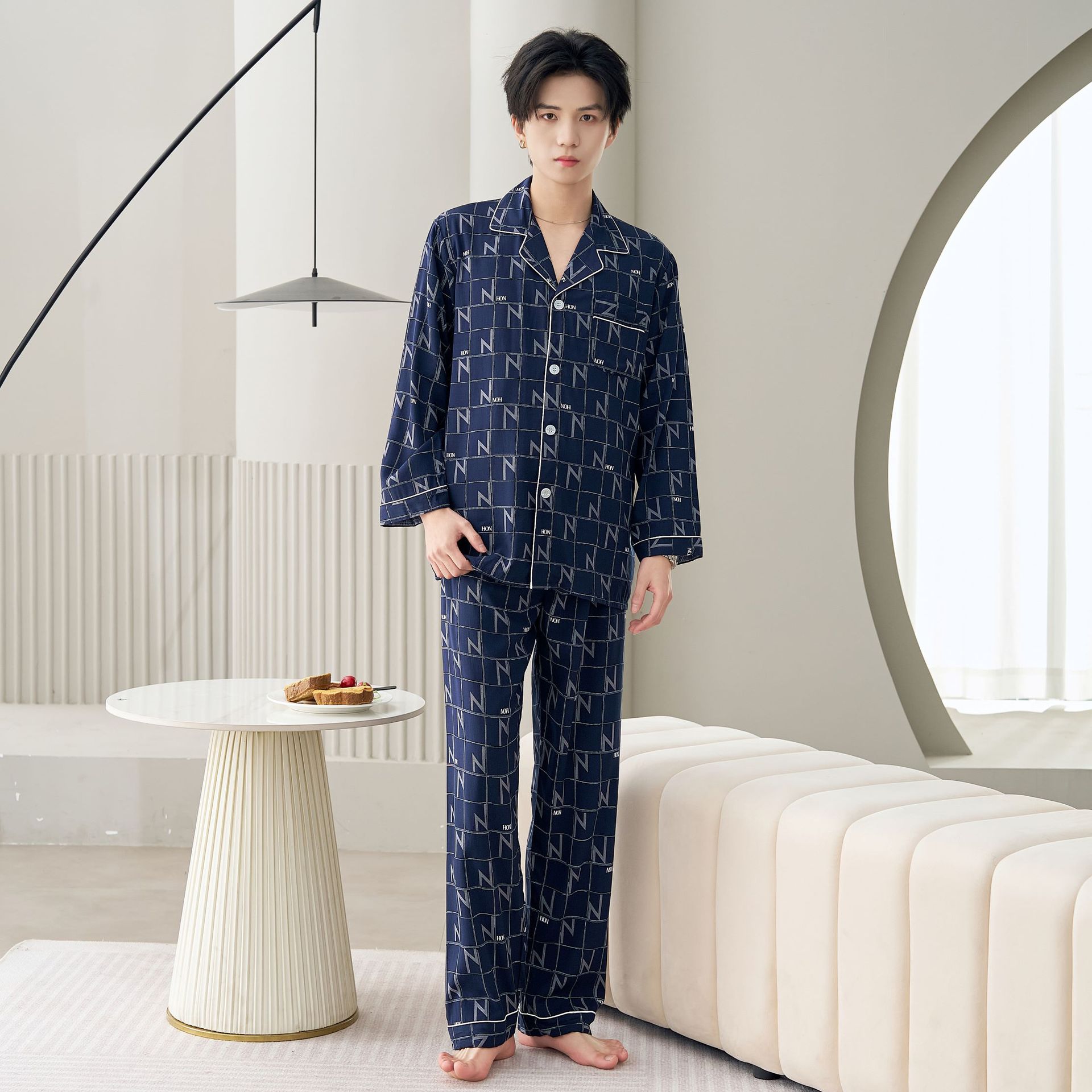 2025 새로운 재고 남성면 실크 봄 여름 가을 긴 소매 얇은 느슨한 잠옷 간단한 편안한 홈 옷스토어 가기