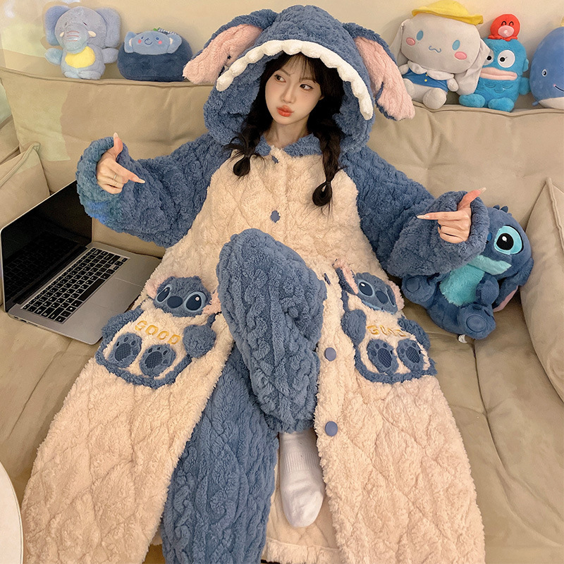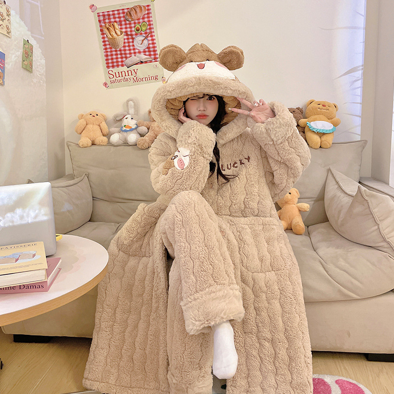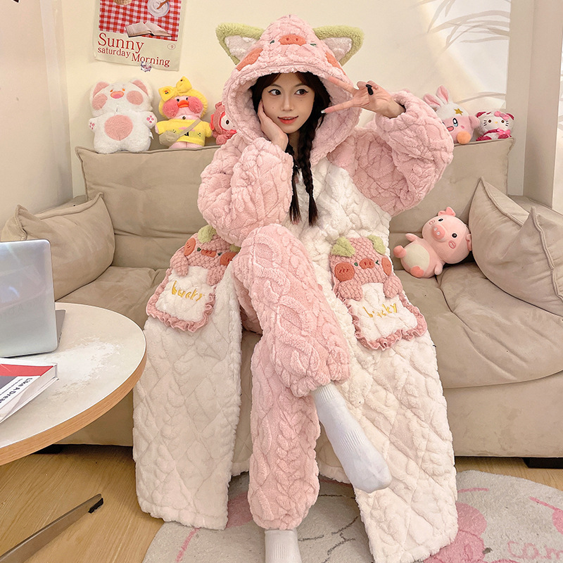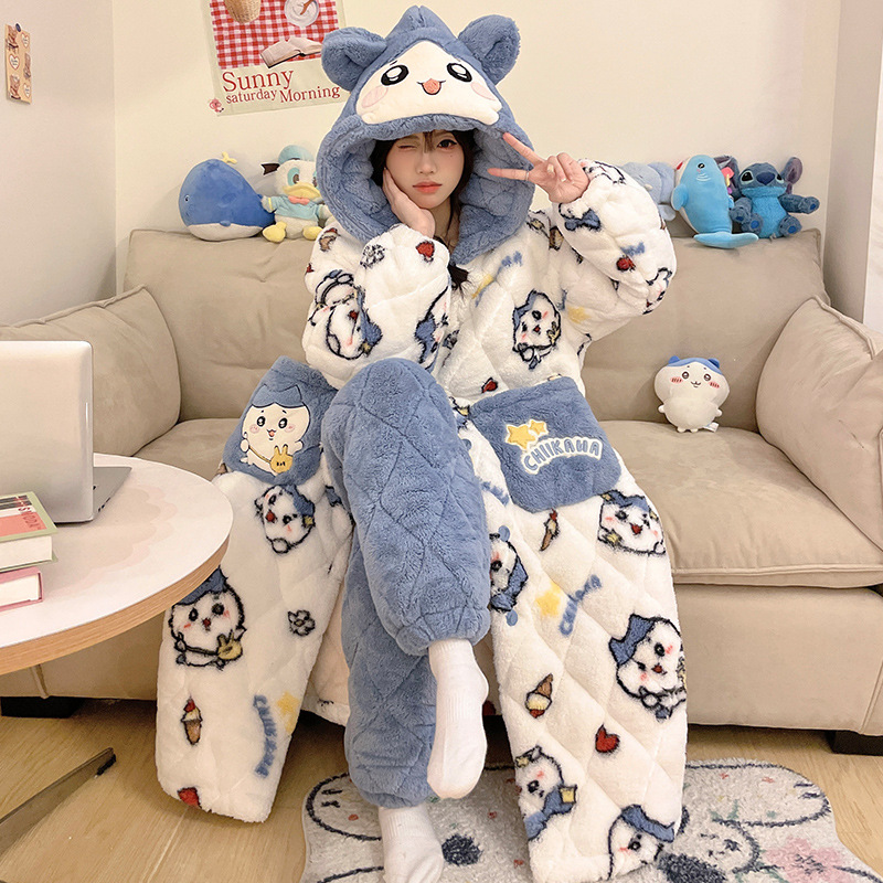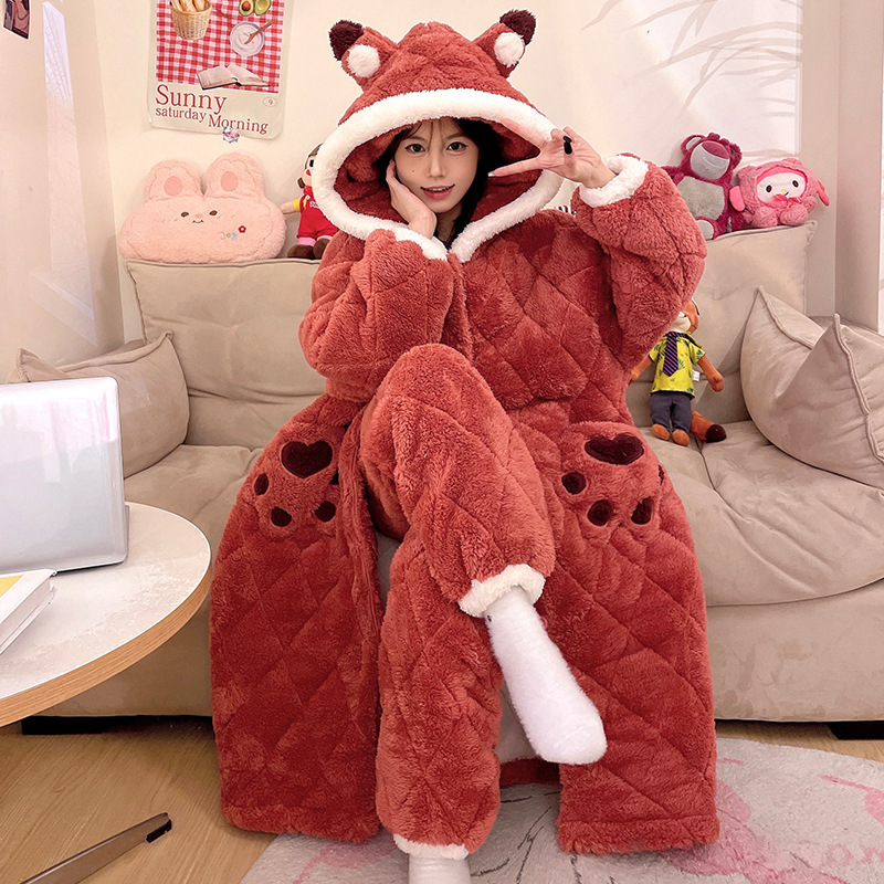 도파민 비버 3 층 퀼트 나이트 가운 여성용 산호 양털 겨울 후드 코튼 패딩 코트 두꺼운 홈 의류 세트스토어 가기