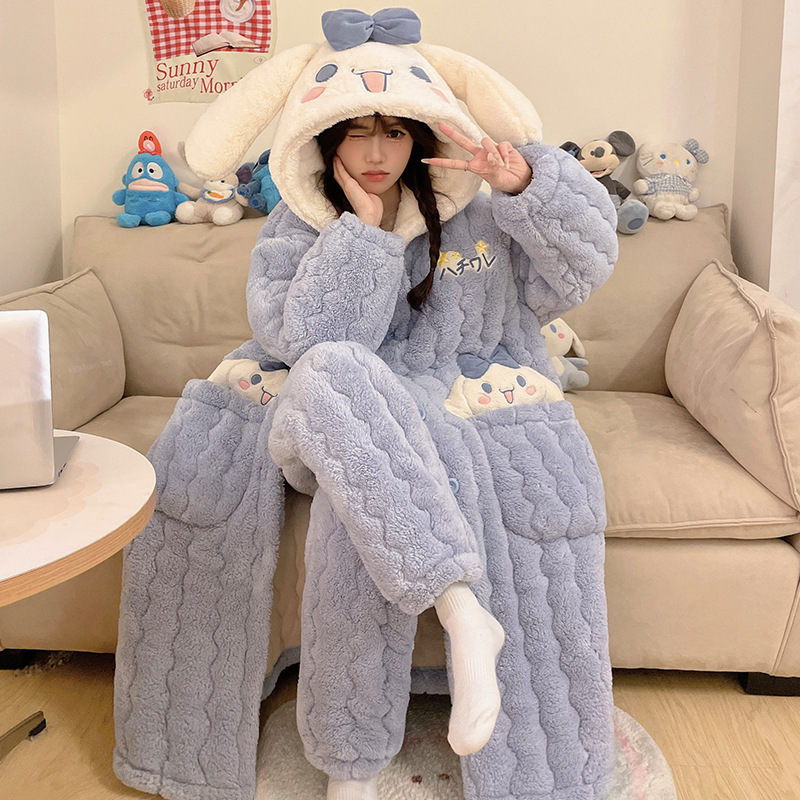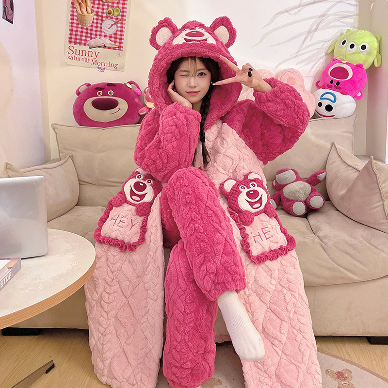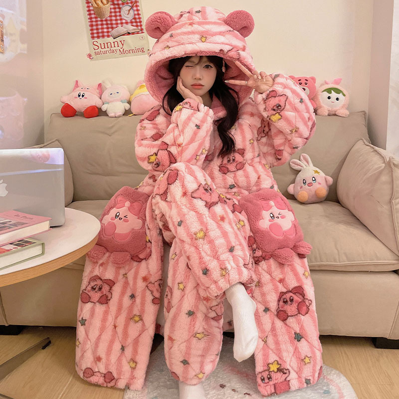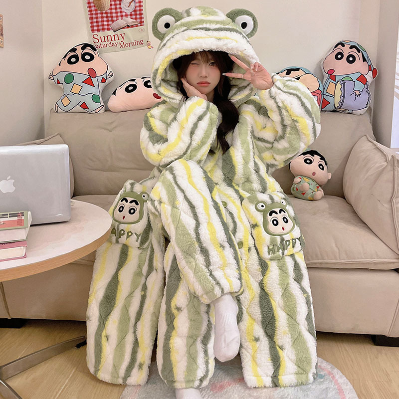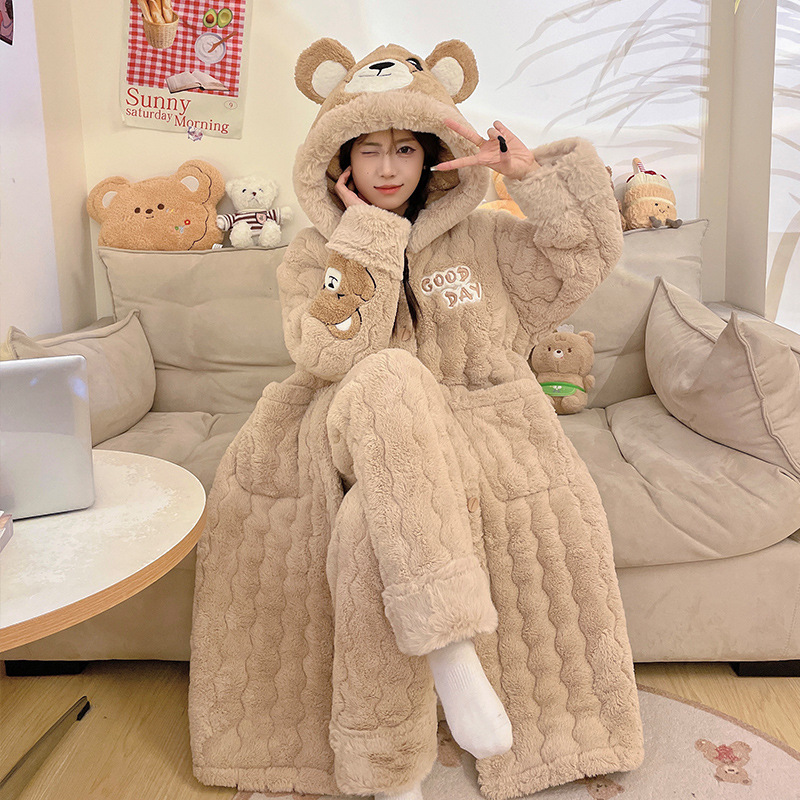 도파민 비버 3 층 퀼트 나이트 가운 여성용 산호 양털 겨울 후드 코튼 패딩 코트 두꺼운 홈 의류 세트스토어 가기