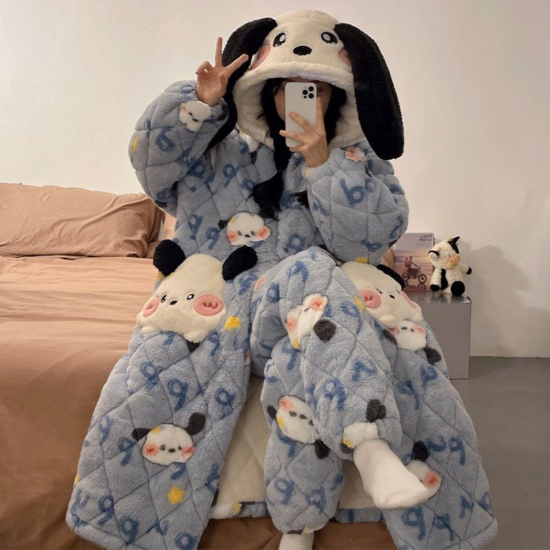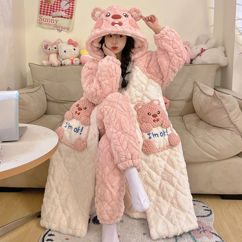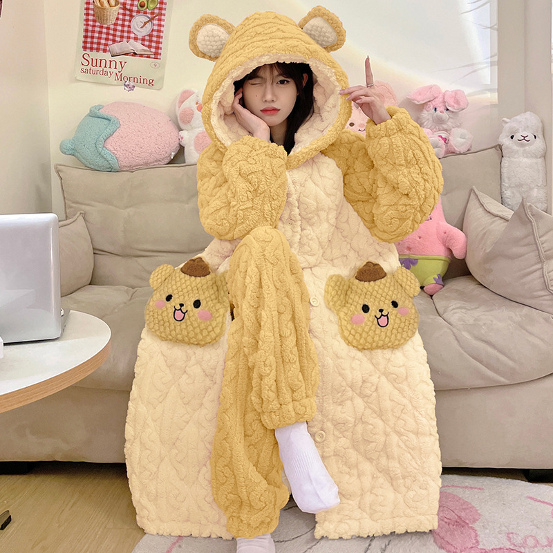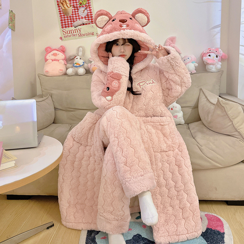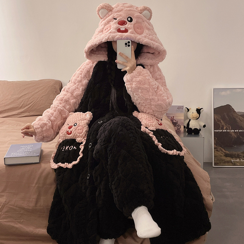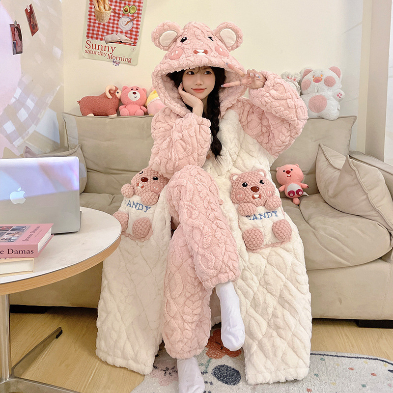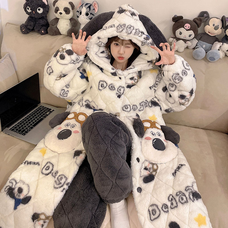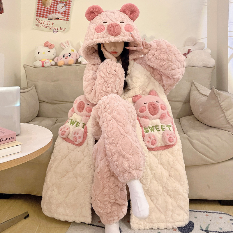도파민 비버 3 층 퀼트 나이트 가운 여성용 산호 양털 겨울 후드 코튼 패딩 코트 두꺼운 홈 의류 세트