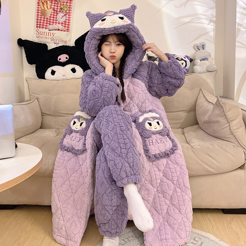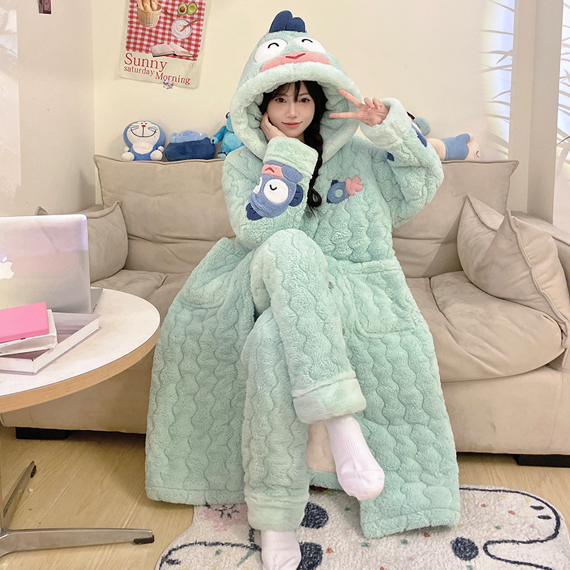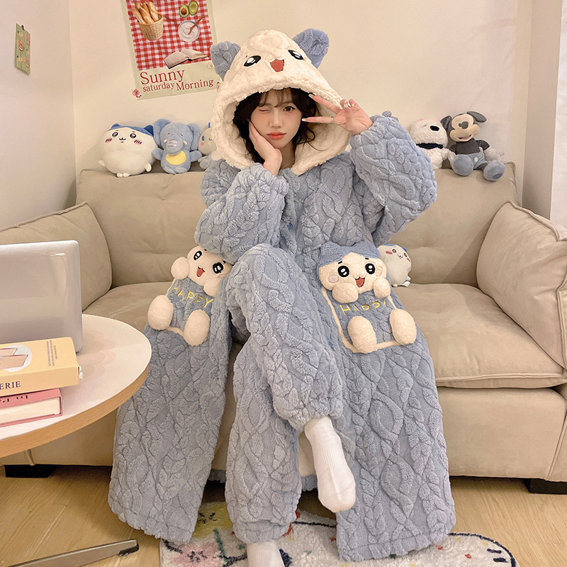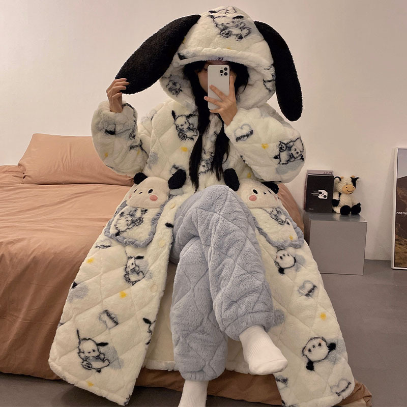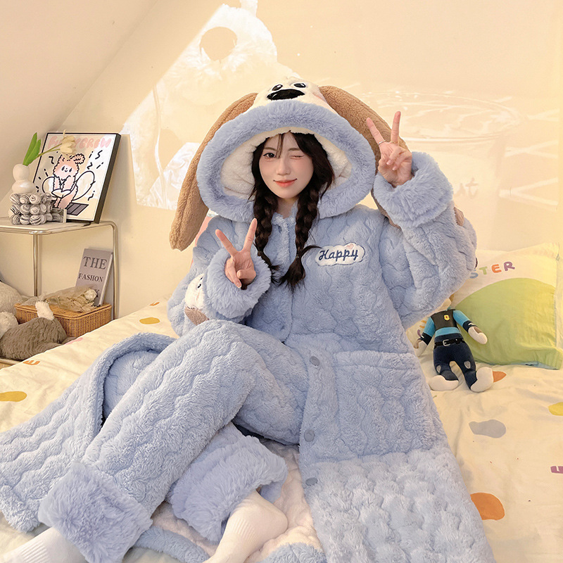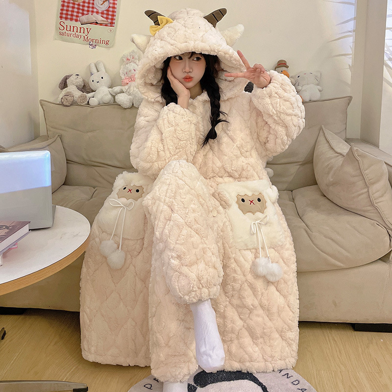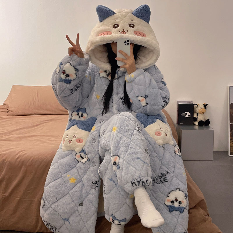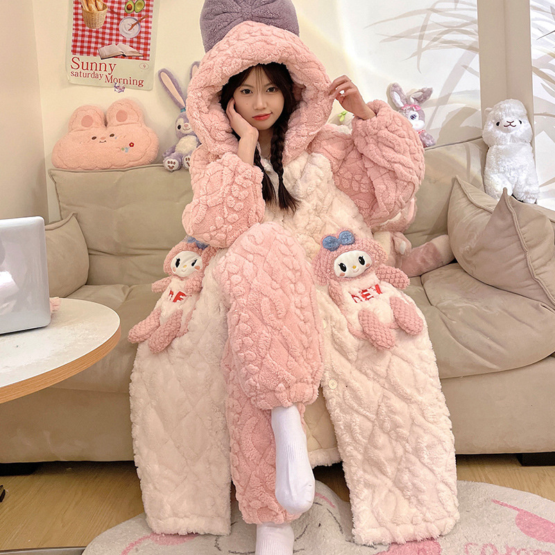 도파민 비버 3 층 퀼트 나이트 가운 여성용 산호 양털 겨울 후드 코튼 패딩 코트 두꺼운 홈 의류 세트