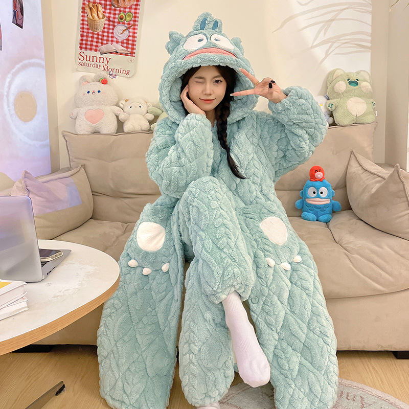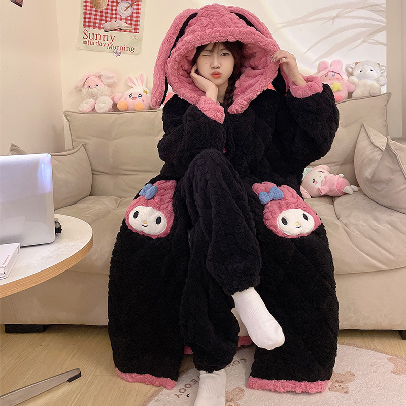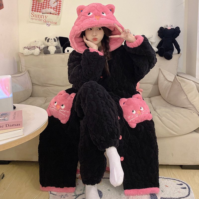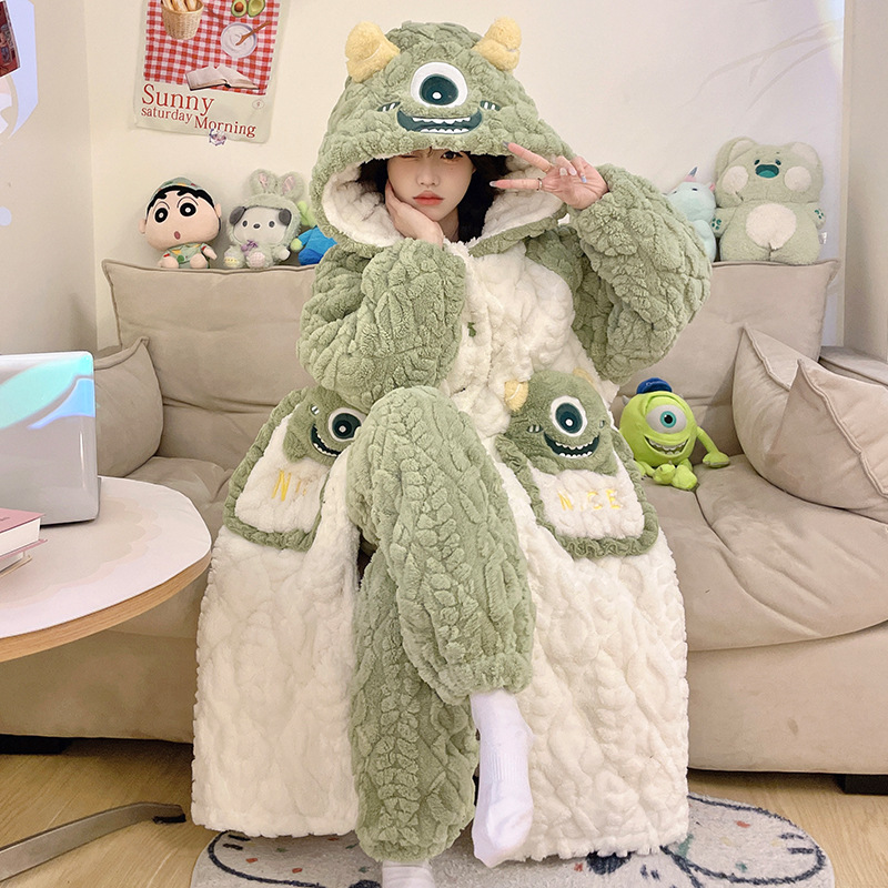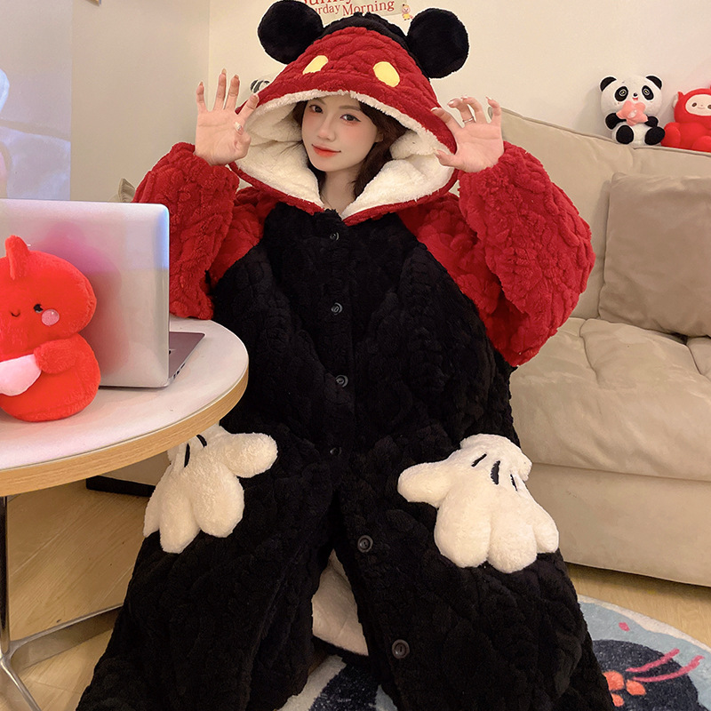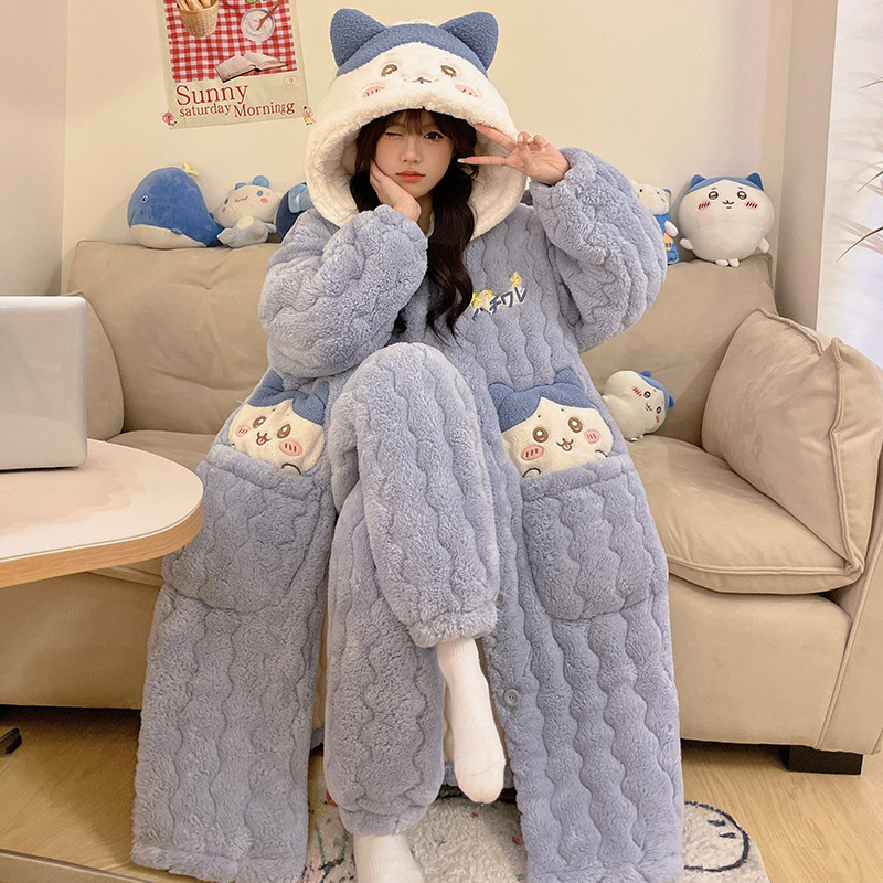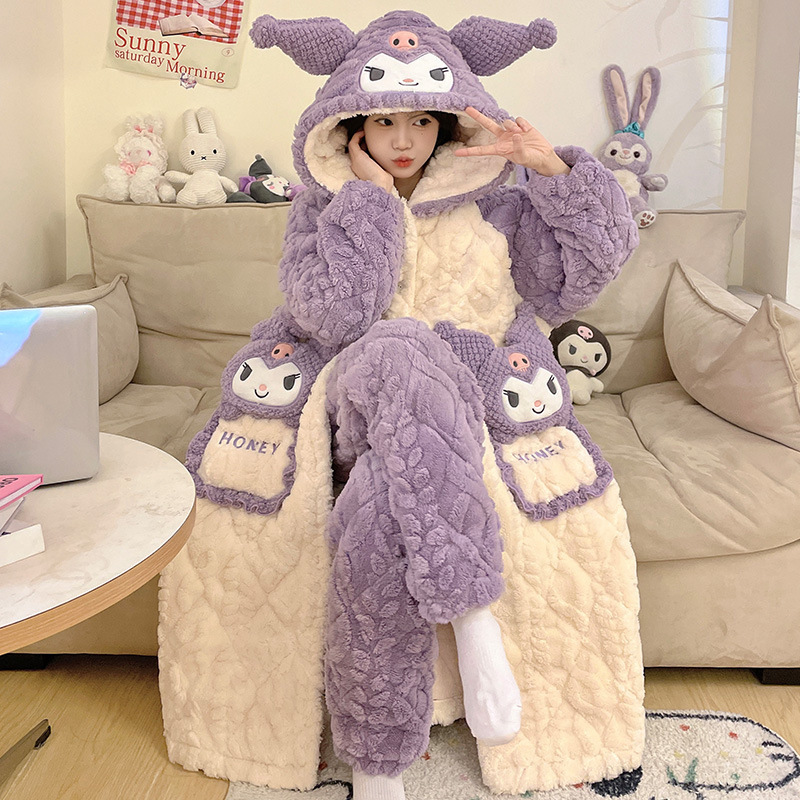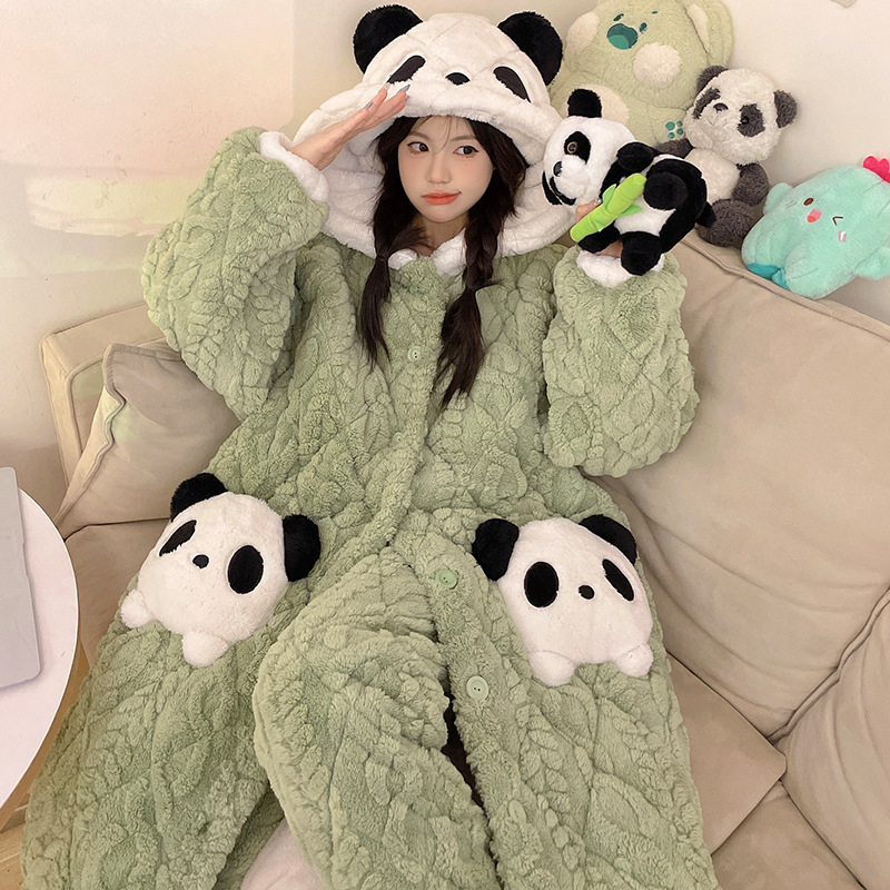 도파민 비버 3 층 퀼트 나이트 가운 여성용 산호 양털 겨울 후드 코튼 패딩 코트 두꺼운 홈 의류 세트