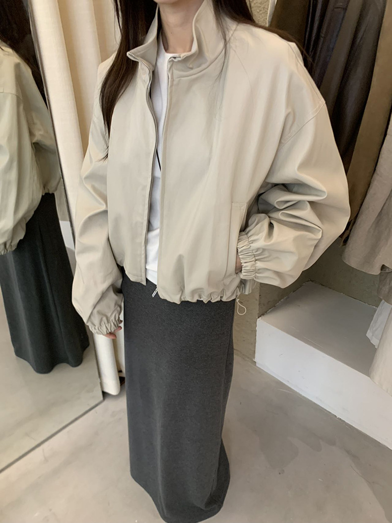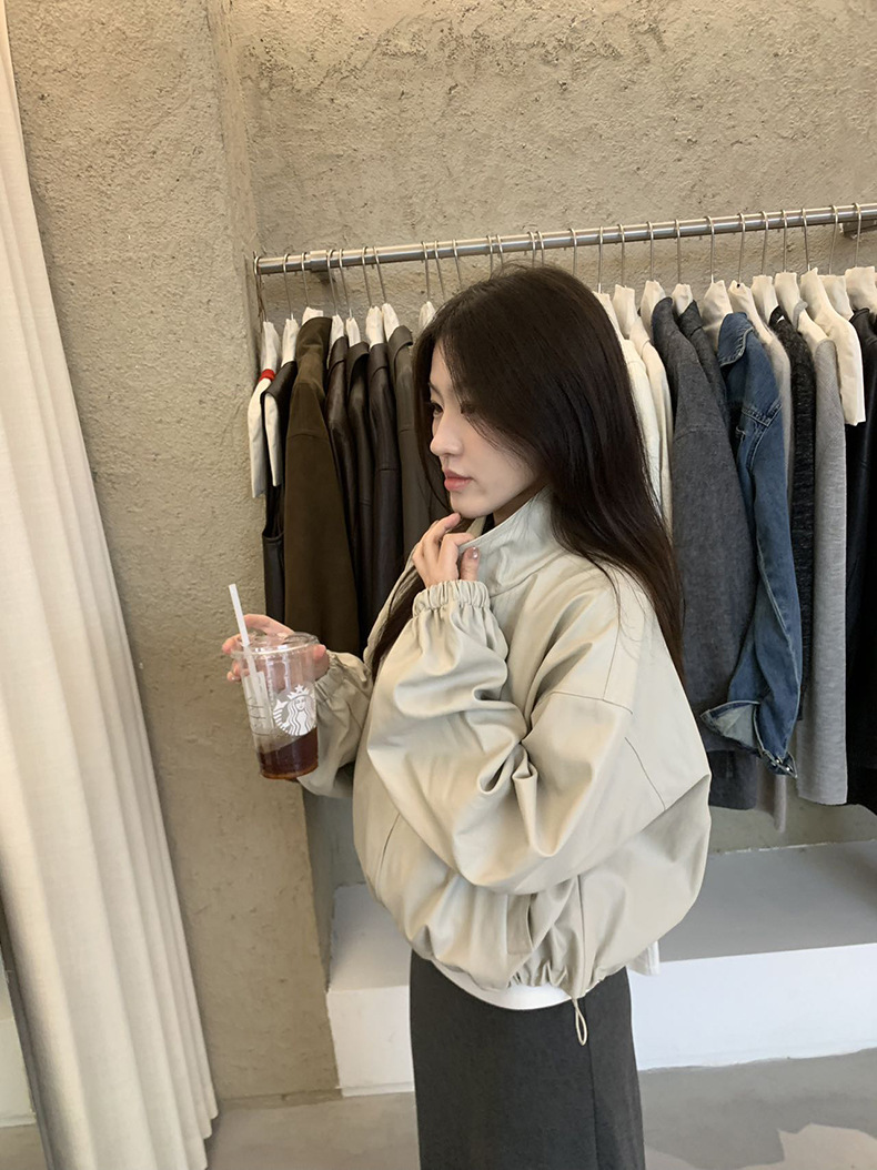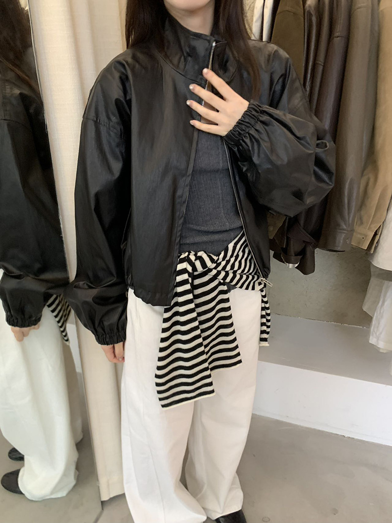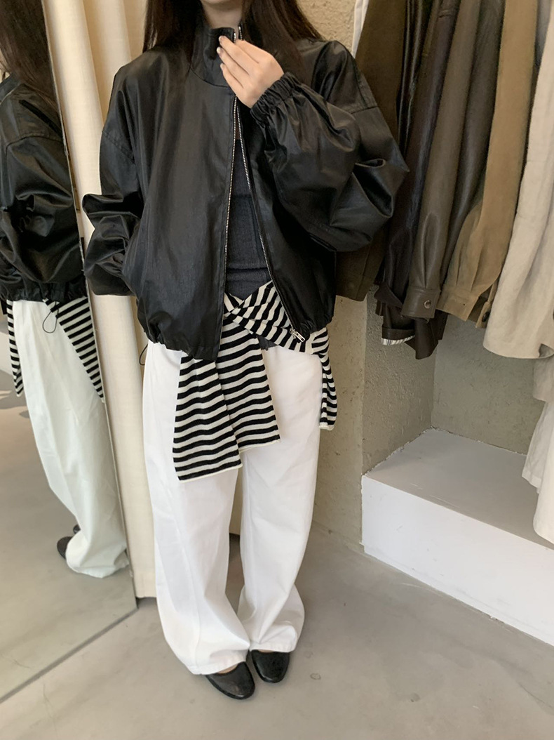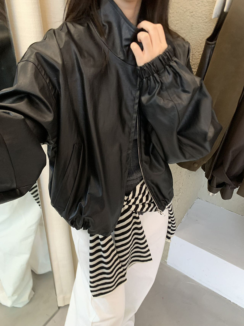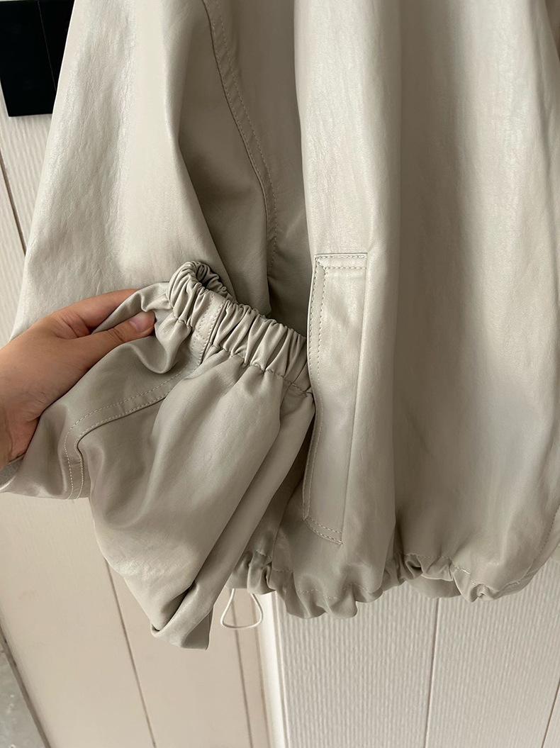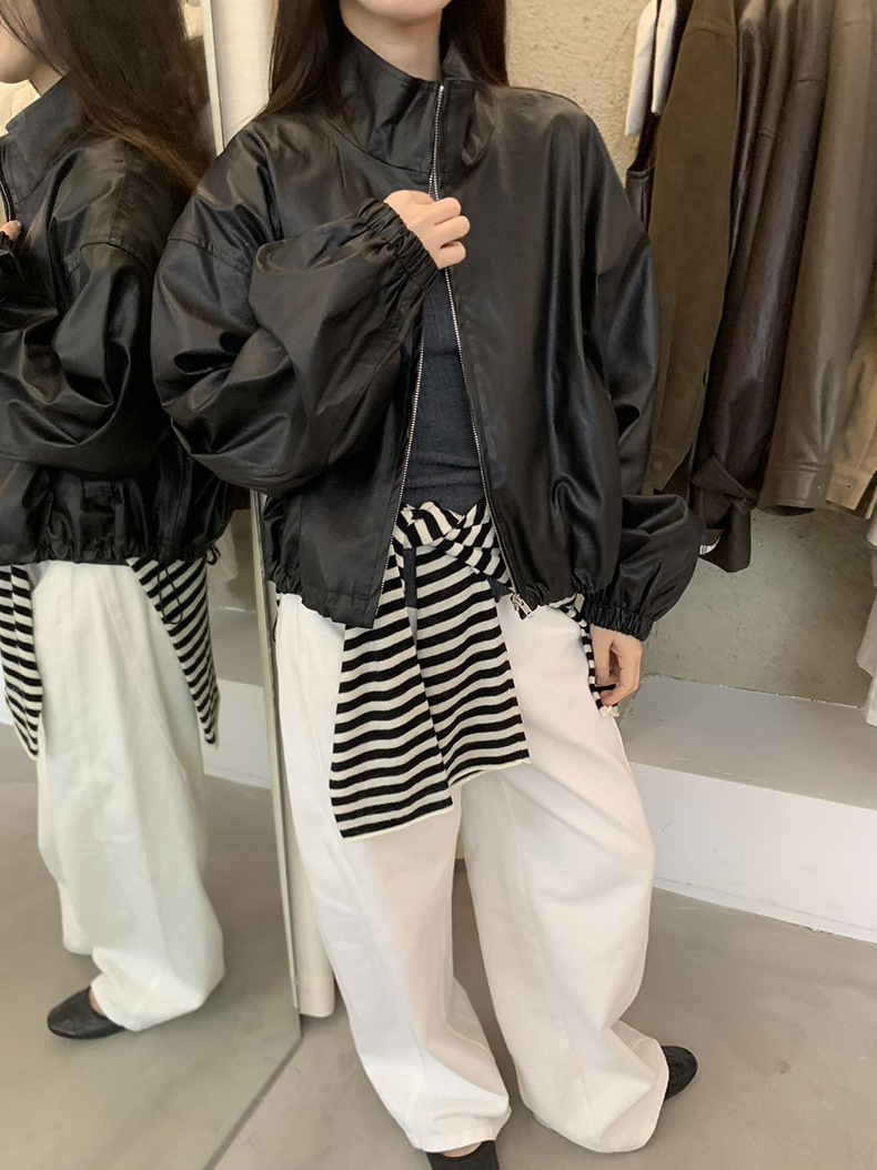 【 40% off 반품/교환 불가】캐주얼 스타일의 스탠드 칼라 지퍼 가죽 자켓, 솔리드 컬러 스탠드 칼라 루즈핏 드로스트링 여성용 아우터 WC06스토어 가기