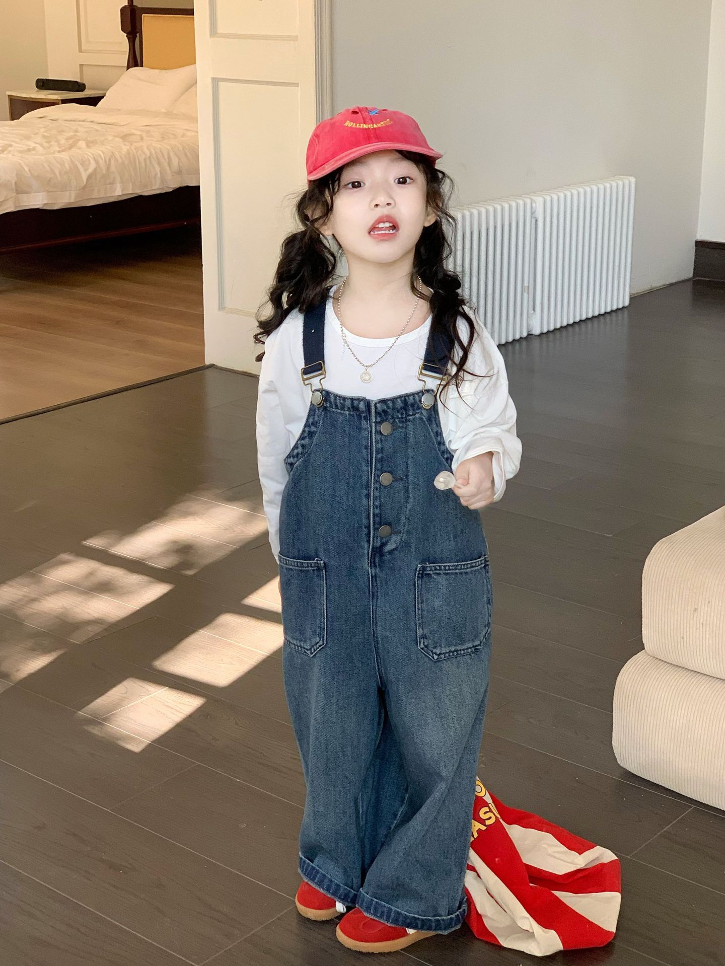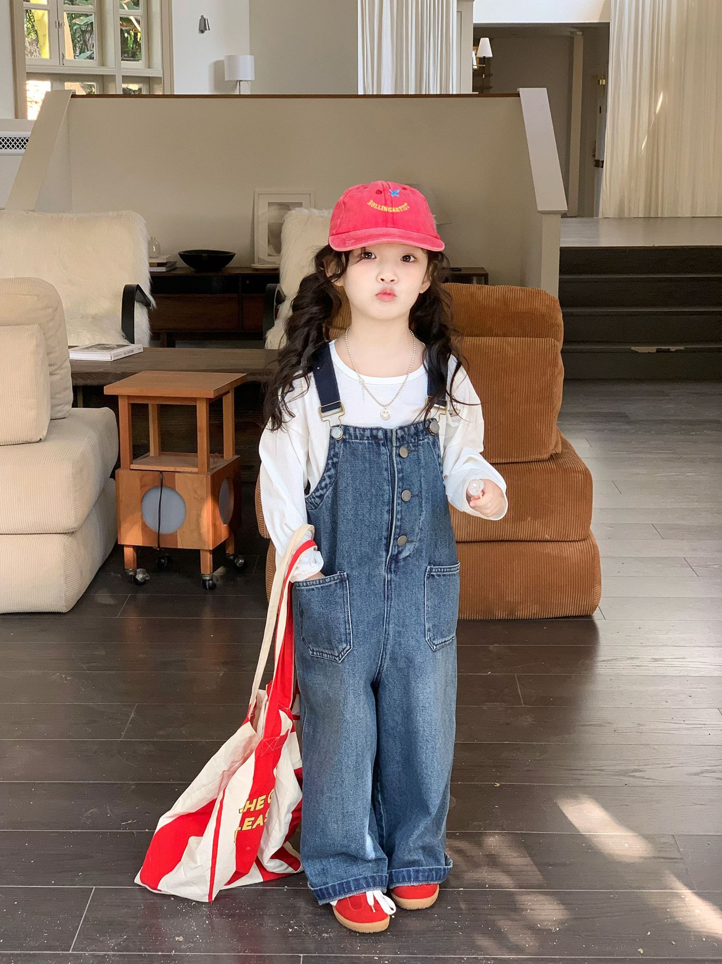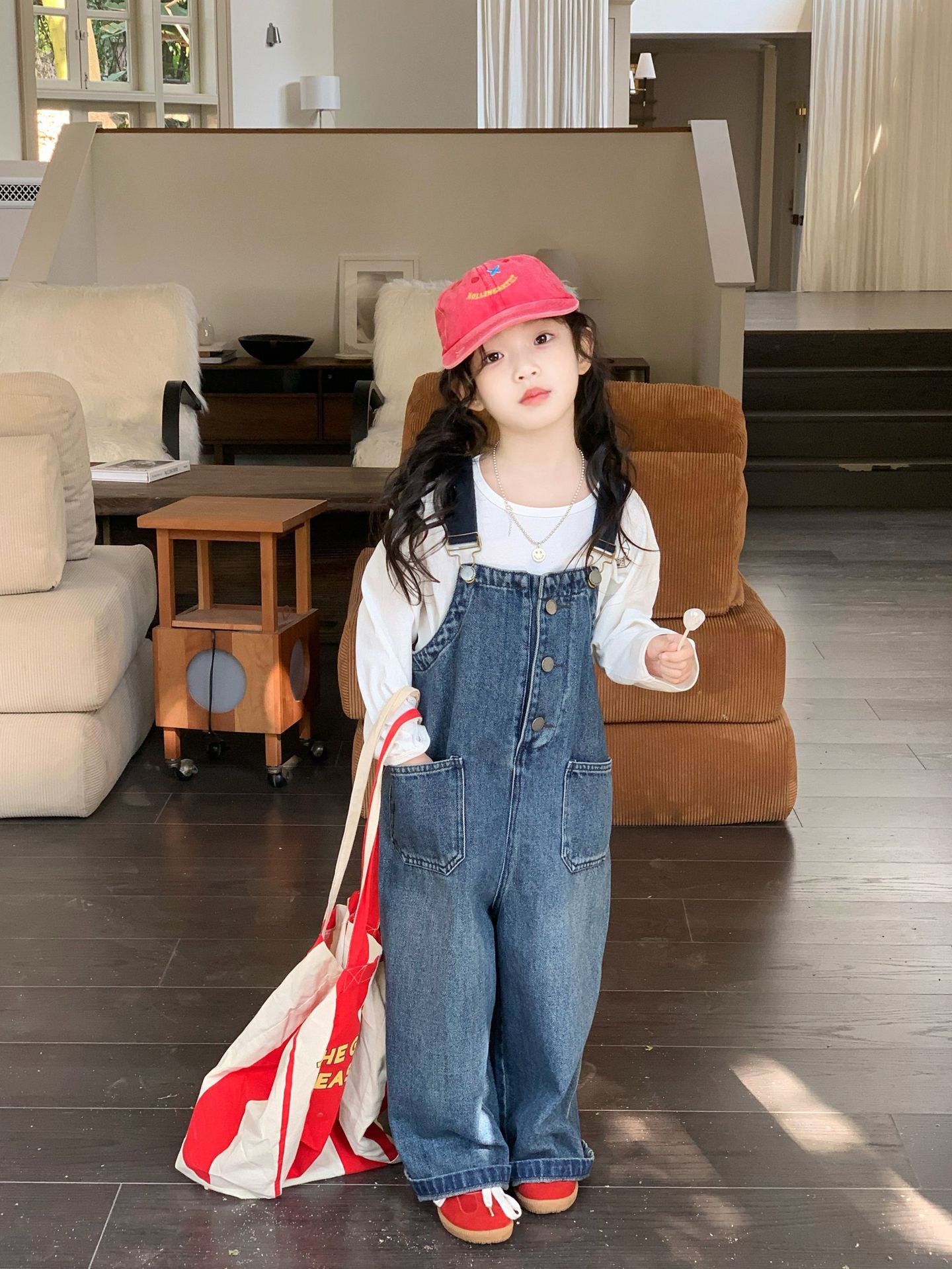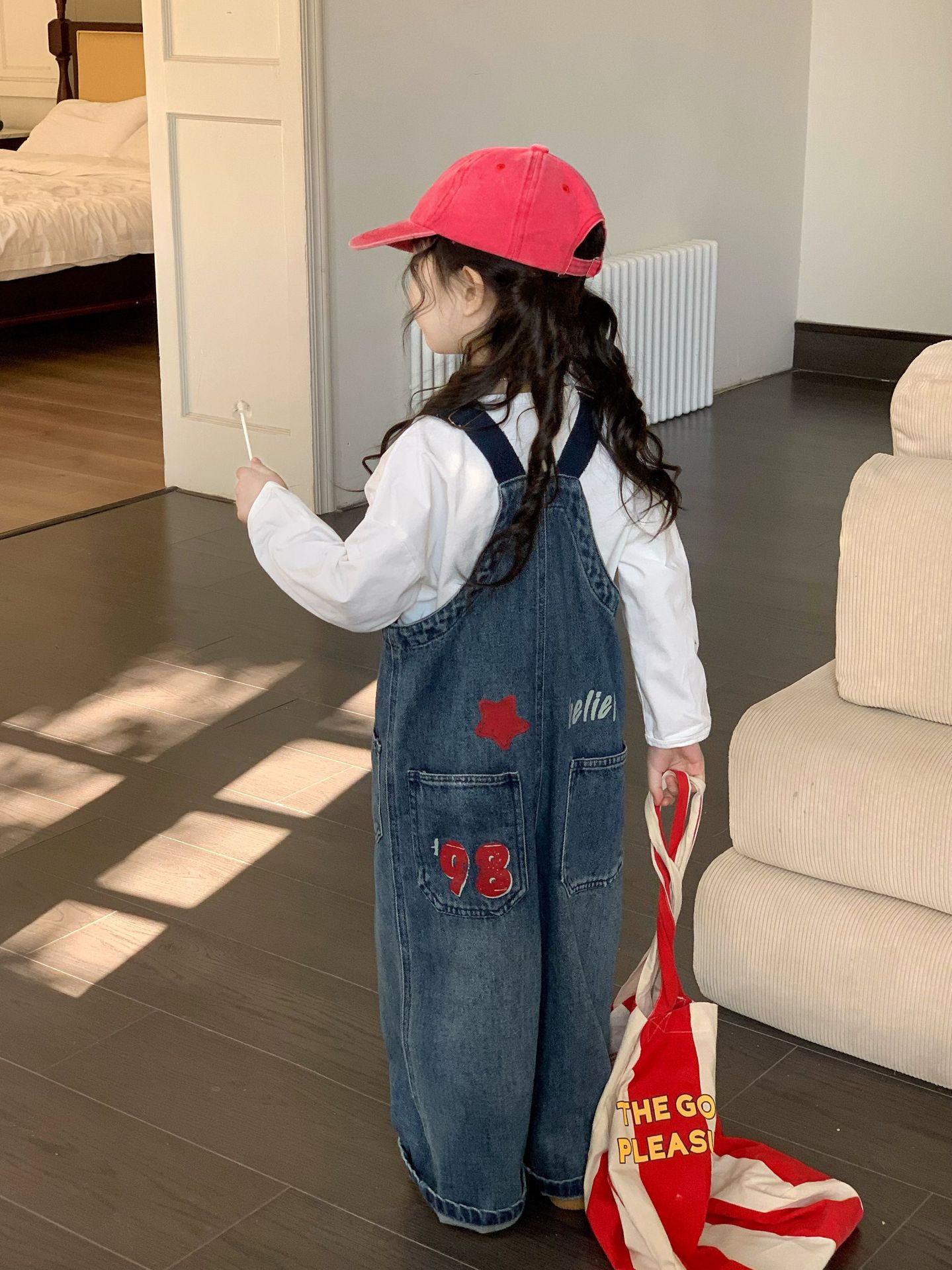 한국 스타일의 봄 청바지 소녀 아기 유행 백 디자인 느슨한 포켓 멜빵 바지 어린이 바지스토어 가기