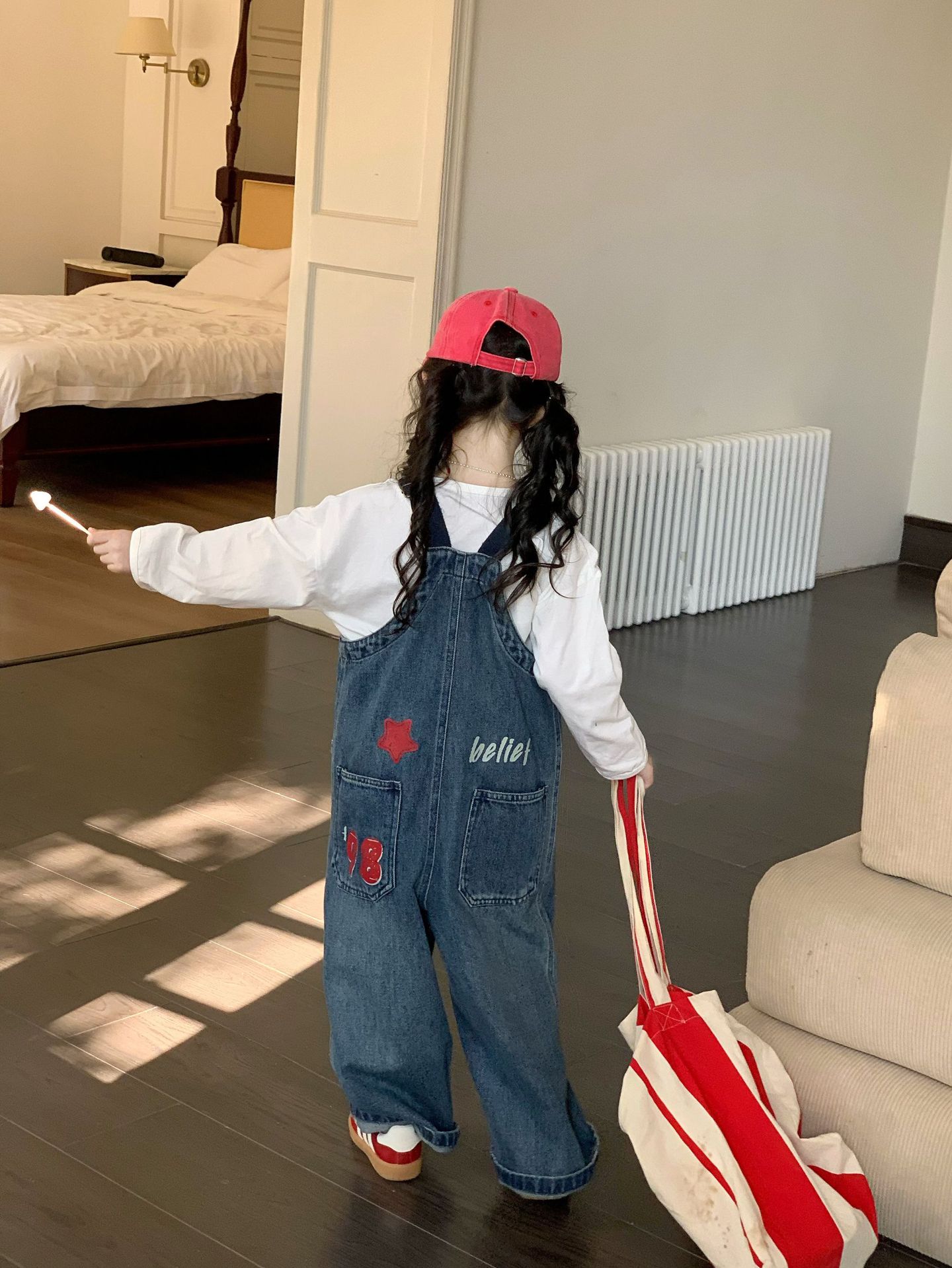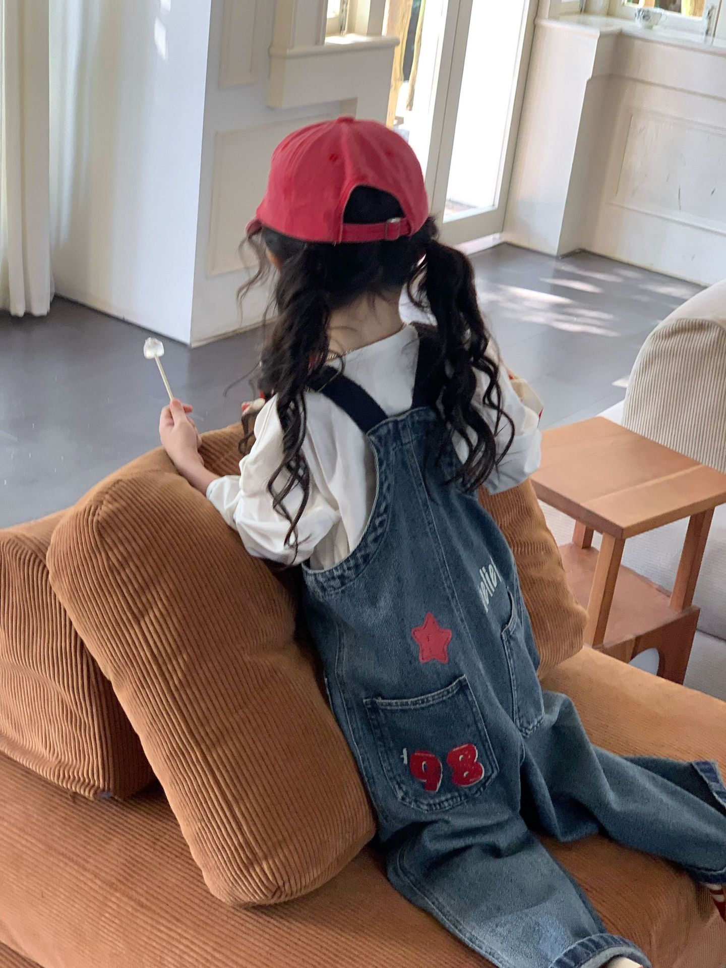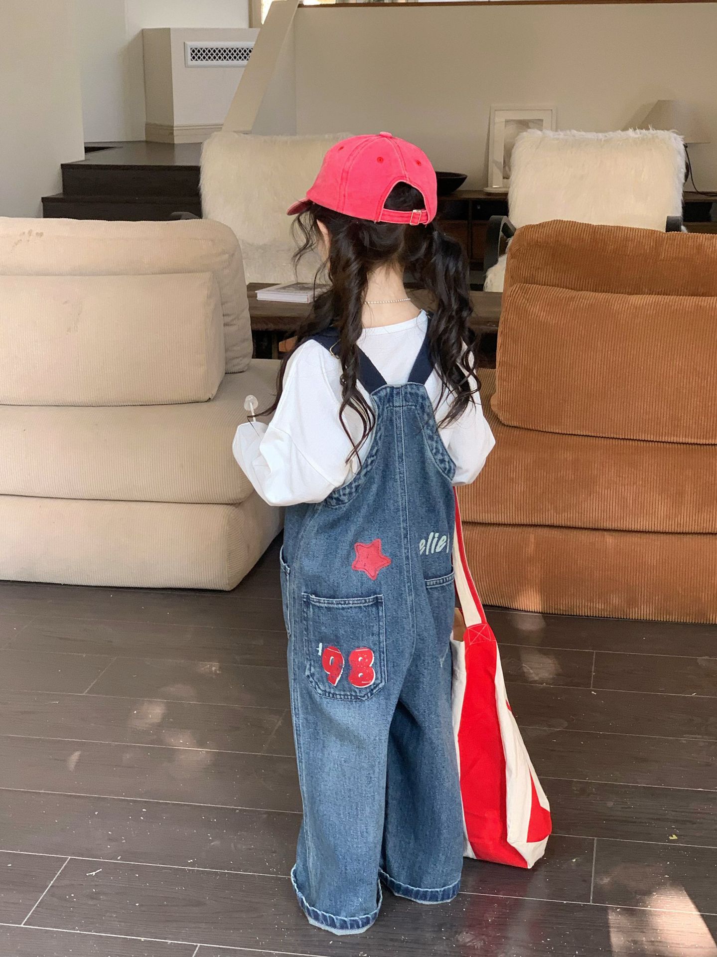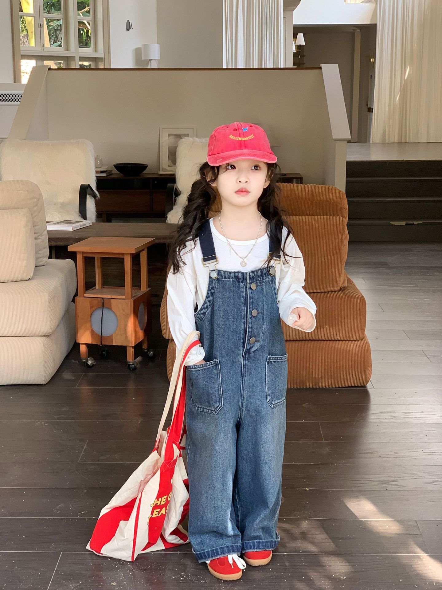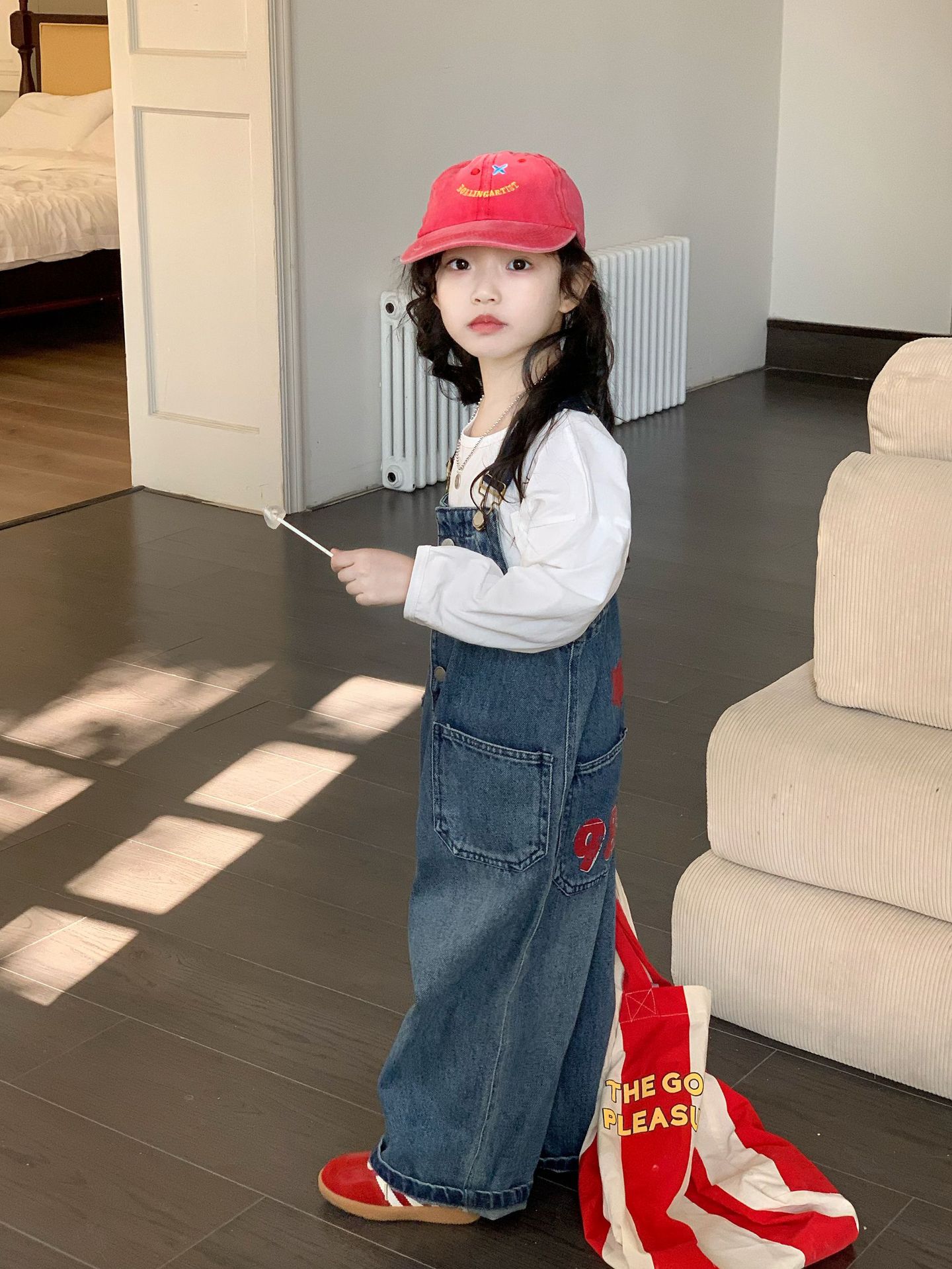 한국 스타일의 봄 청바지 소녀 아기 유행 백 디자인 느슨한 포켓 멜빵 바지 어린이 바지스토어 가기