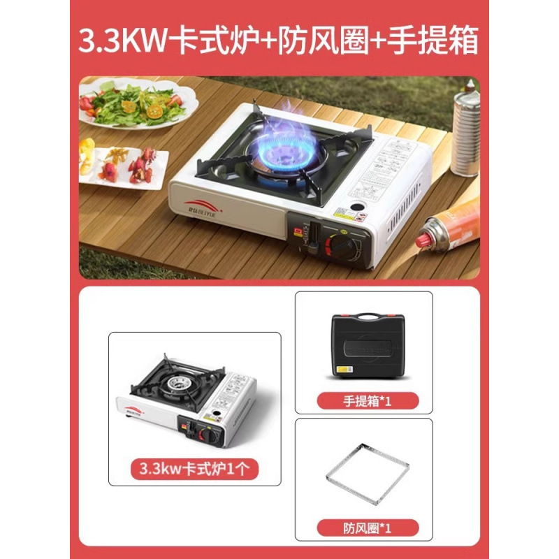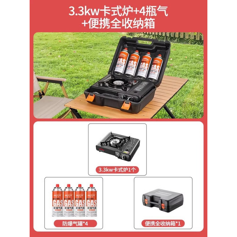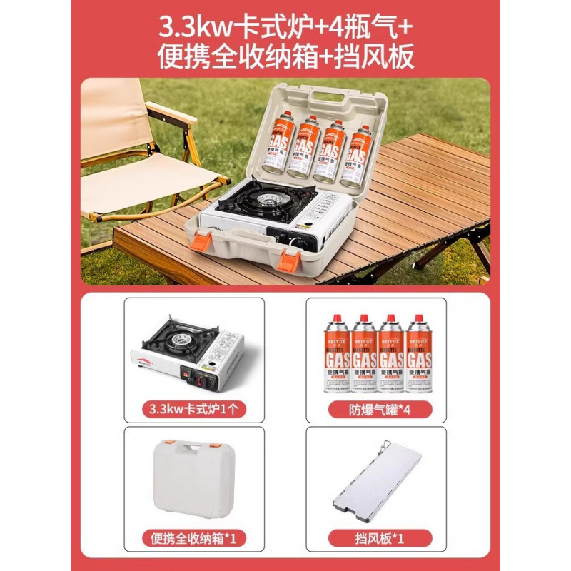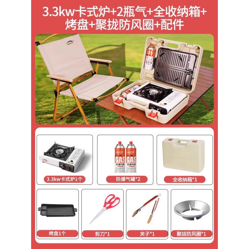 • 업그레이드된 카세트 스토브 + 가스 4병 + 휴대용 전체 보관함 + 나무 손잡이 바베큐 플레이트 + 앞 유리 + 액세서리