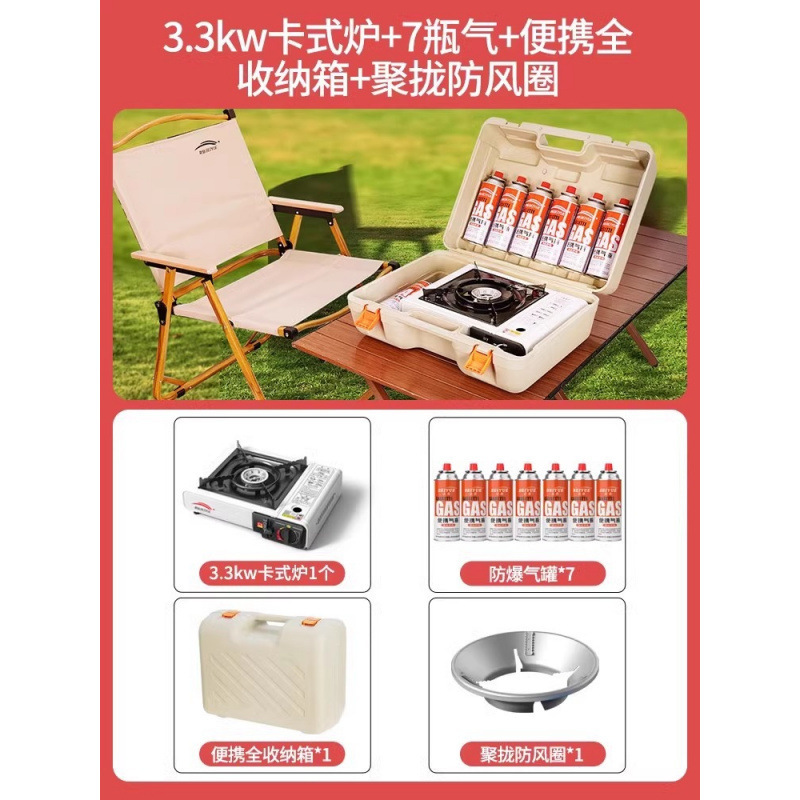 • 업그레이드된 카세트 스토브 + 가스 7병 + 휴대용 전체 보관함 + 나무 손잡이 바베큐 플레이트 + 앞 유리 + 액세서리