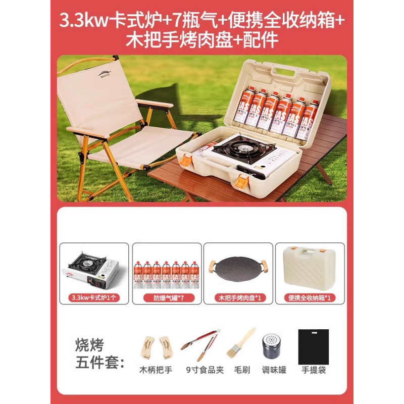 • 업그레이드된 카세트 스토브 + 가스 7병 + 휴대용 전체 보관함 + 나무 손잡이 바베큐 플레이트 + 액세서리
