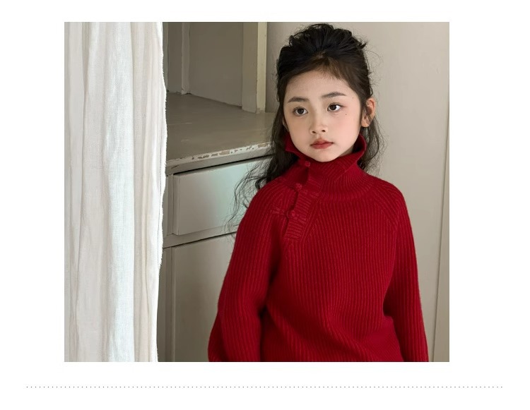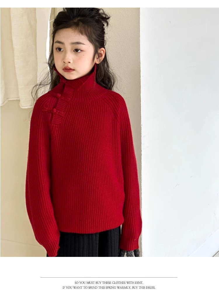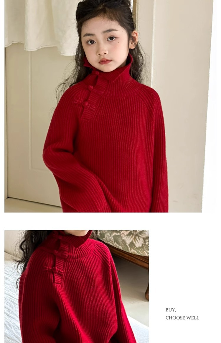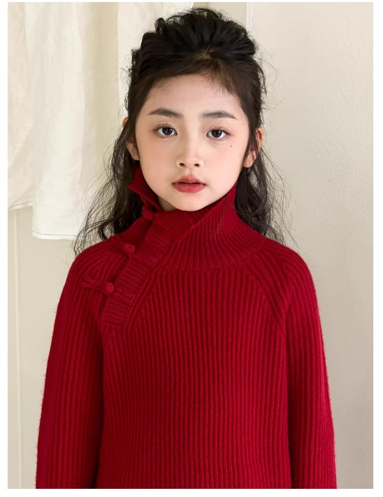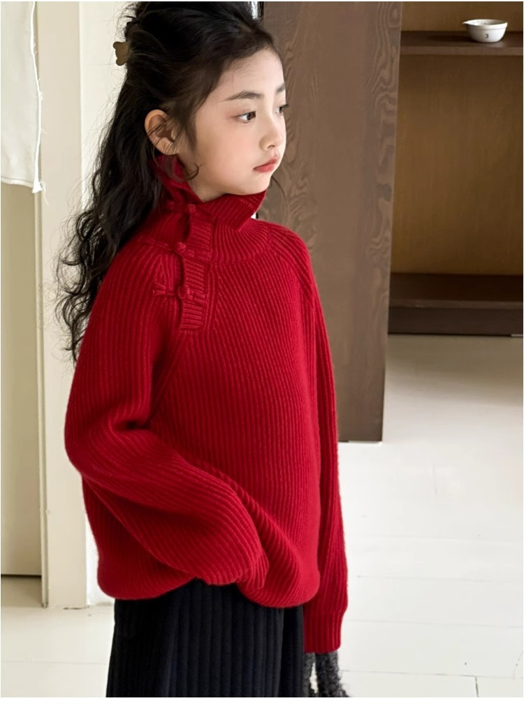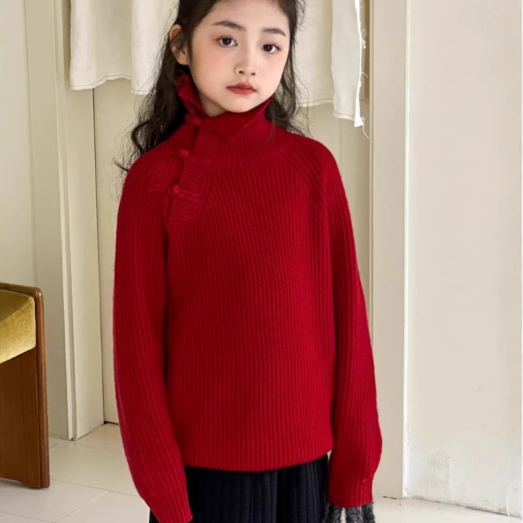 소녀 레드 스웨터 2025 새로운 겨울 옷 국가 스타일 새로운 중국 스타일 버클 년 옷 어린이 하프 하이 칼라 니트 탑스토어 가기