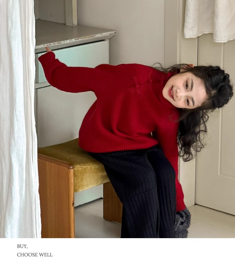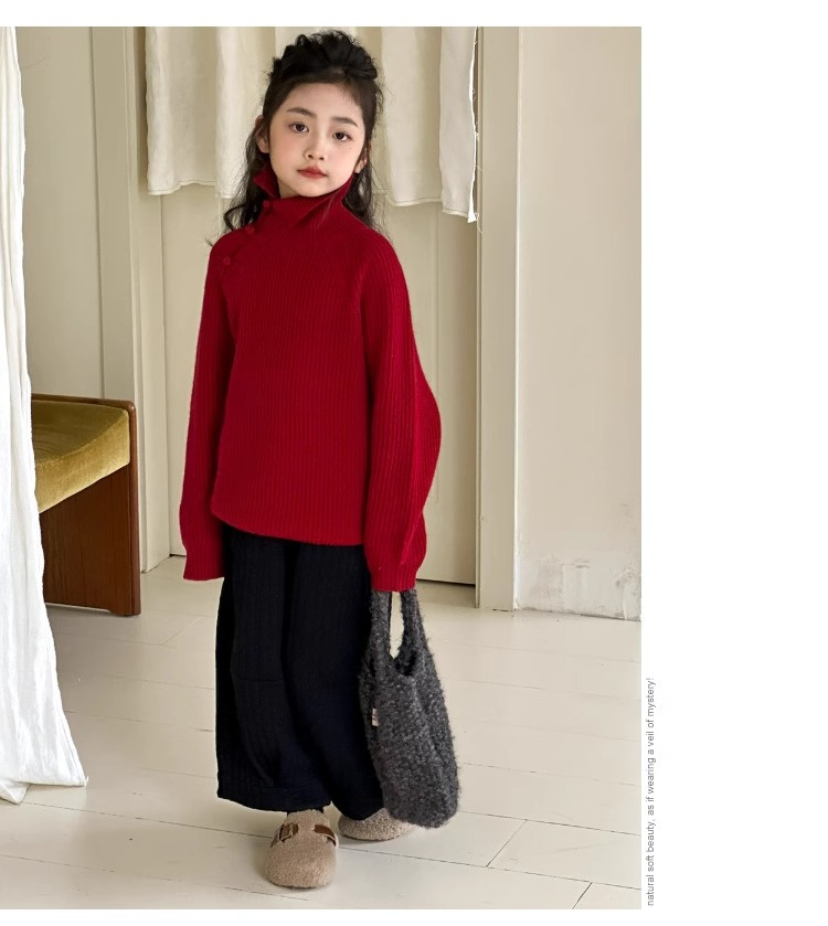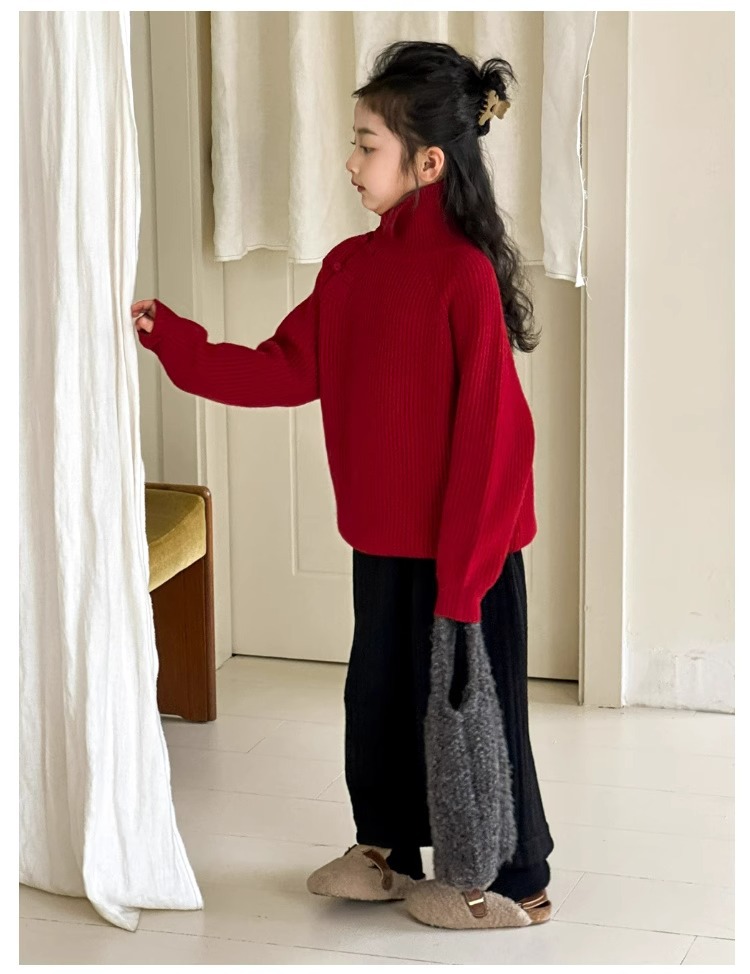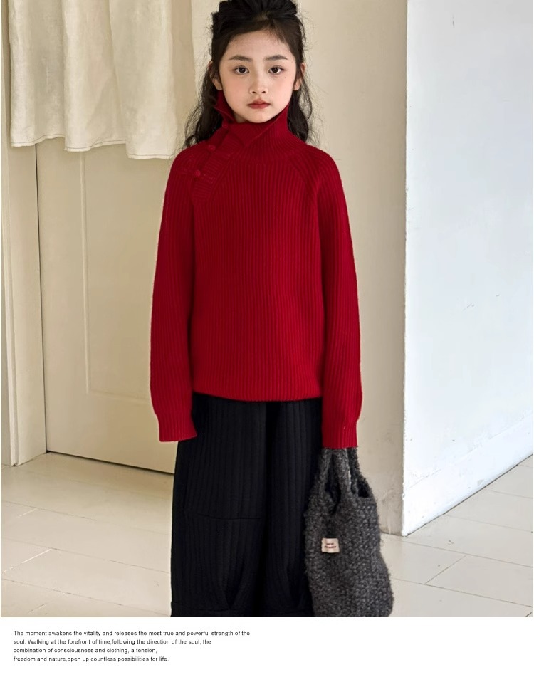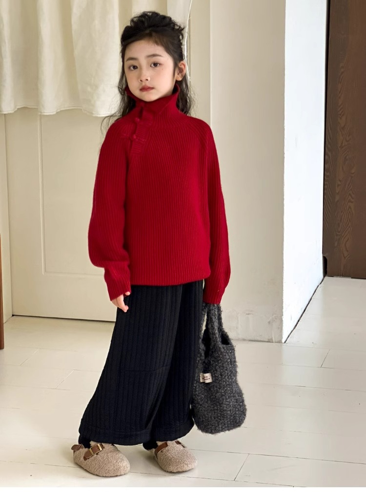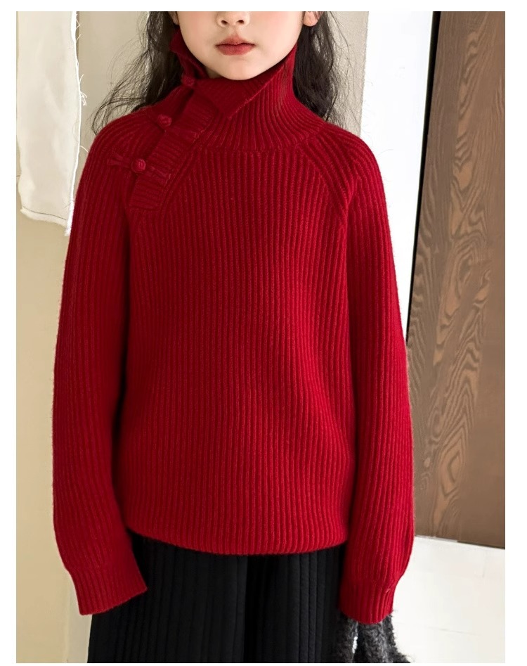소녀 레드 스웨터 2025 새로운 겨울 옷 국가 스타일 새로운 중국 스타일 버클 년 옷 어린이 하프 하이 칼라 니트 탑스토어 가기