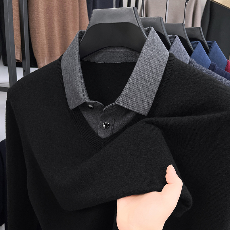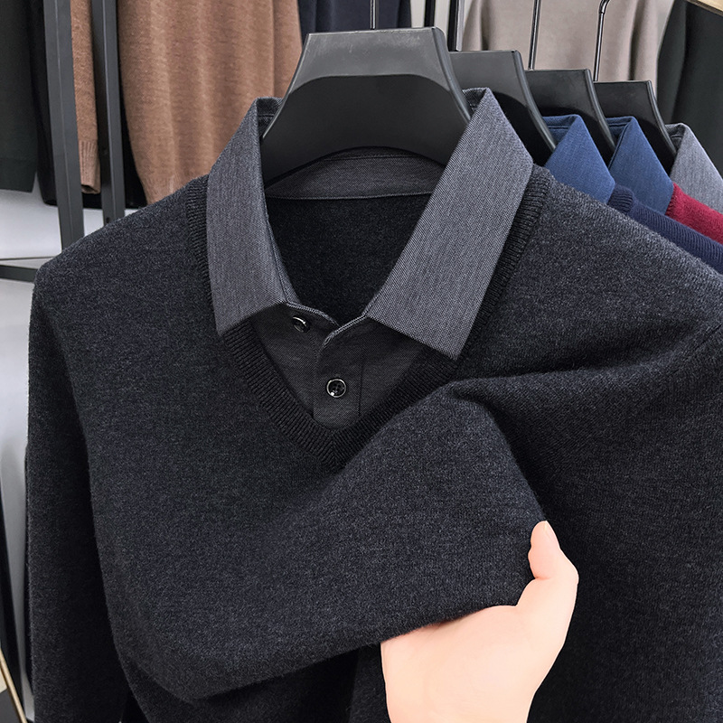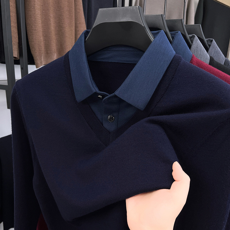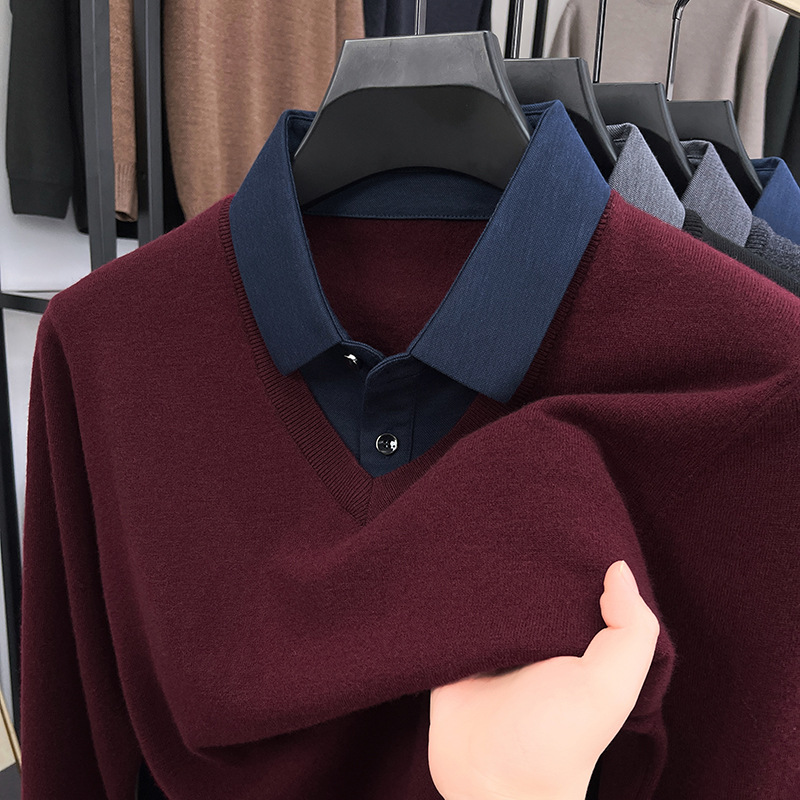 가짜 투피스 퓨어 스웨터 남성용 옷깃 버건디 따뜻한 니트웨어 가을과 겨울 젊고 중년 아빠를위한 탑스토어 가기