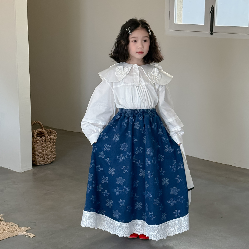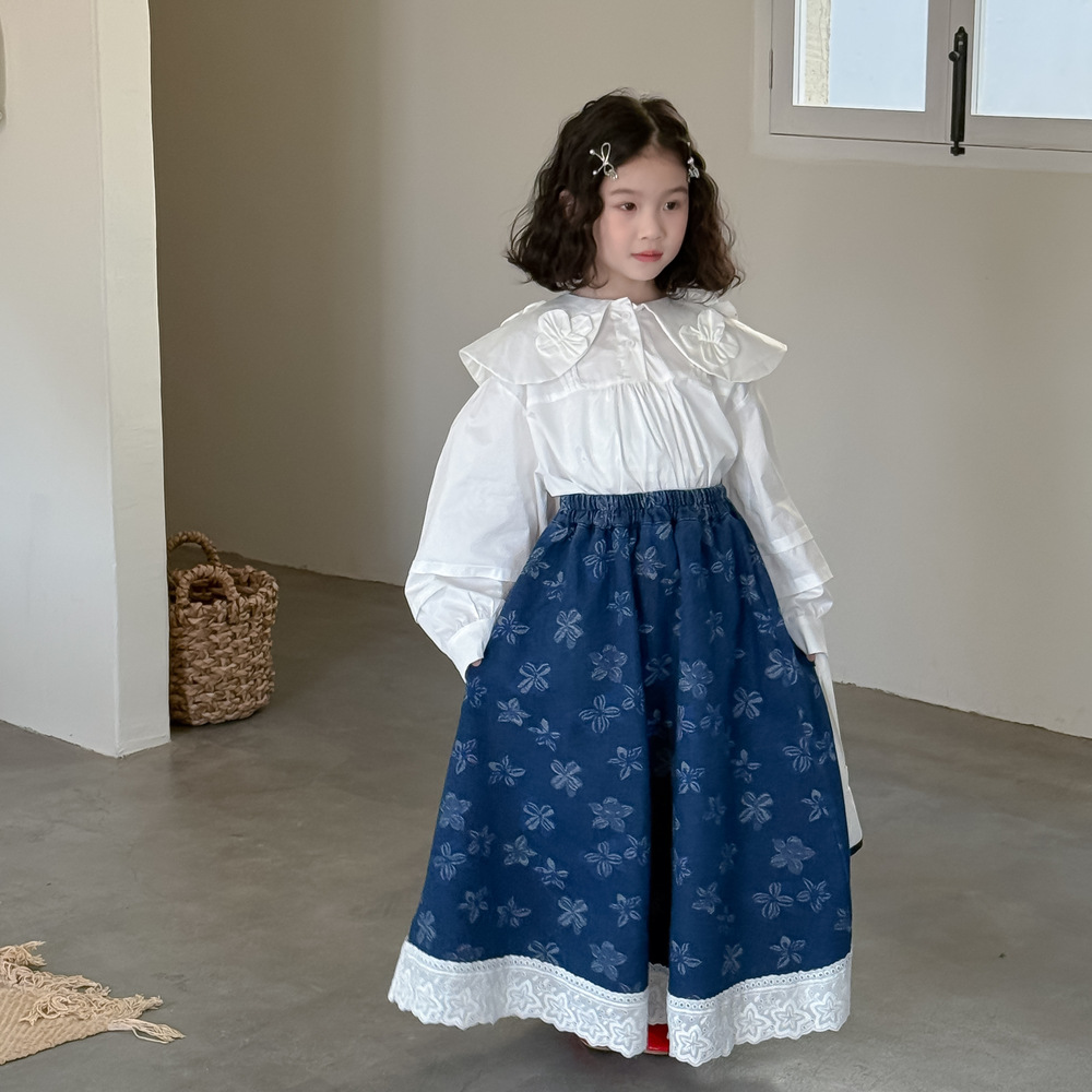 어린이 치마 2025 봄 소녀 한국식 전장 꽃 치마 어린이 캐주얼 느슨한 레이스 데님 치마