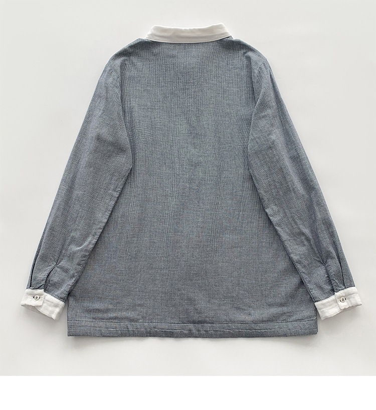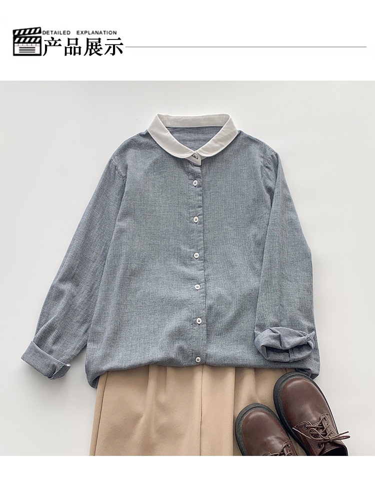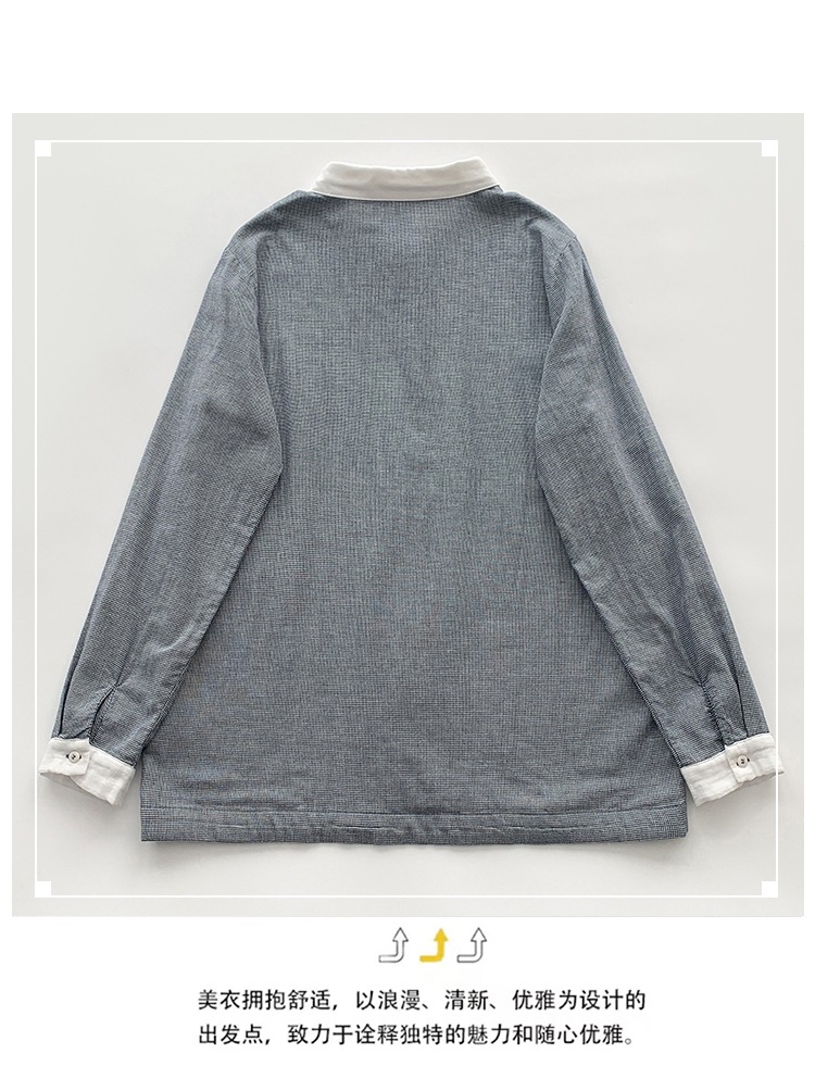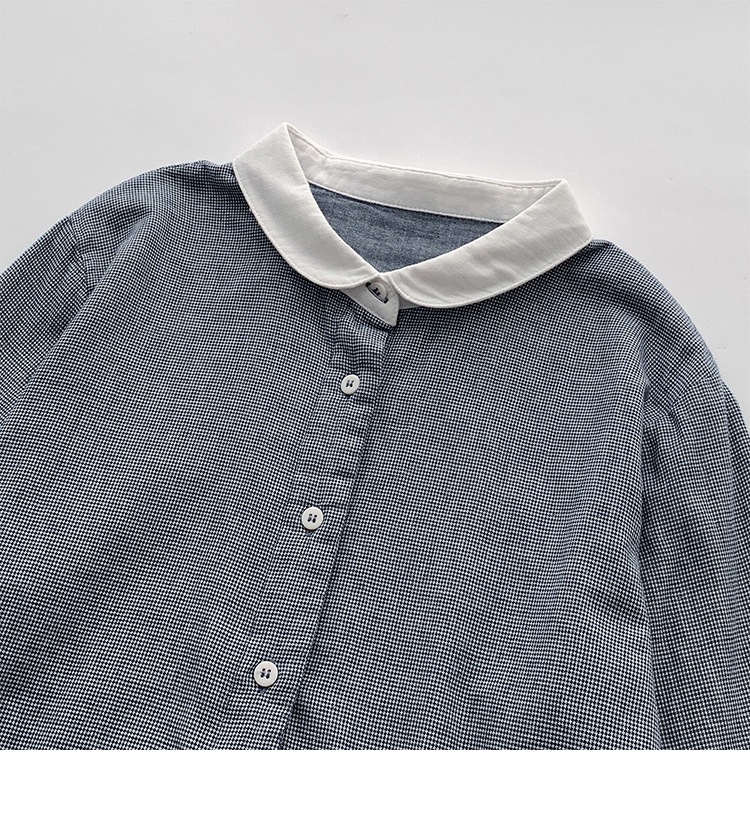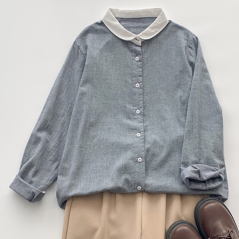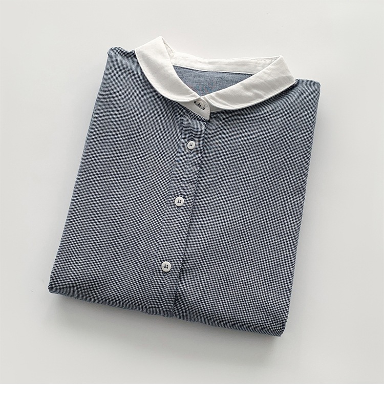2025 리얼 샷 재고 스티칭 칼라 코튼 격자 셔츠 봄 새로운 예술적 더블 레이어 원사 화이트 칼라 셔츠 여성 의류스토어 가기