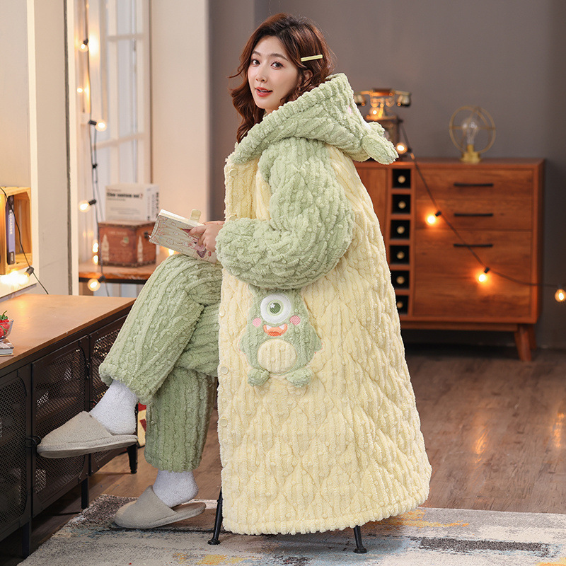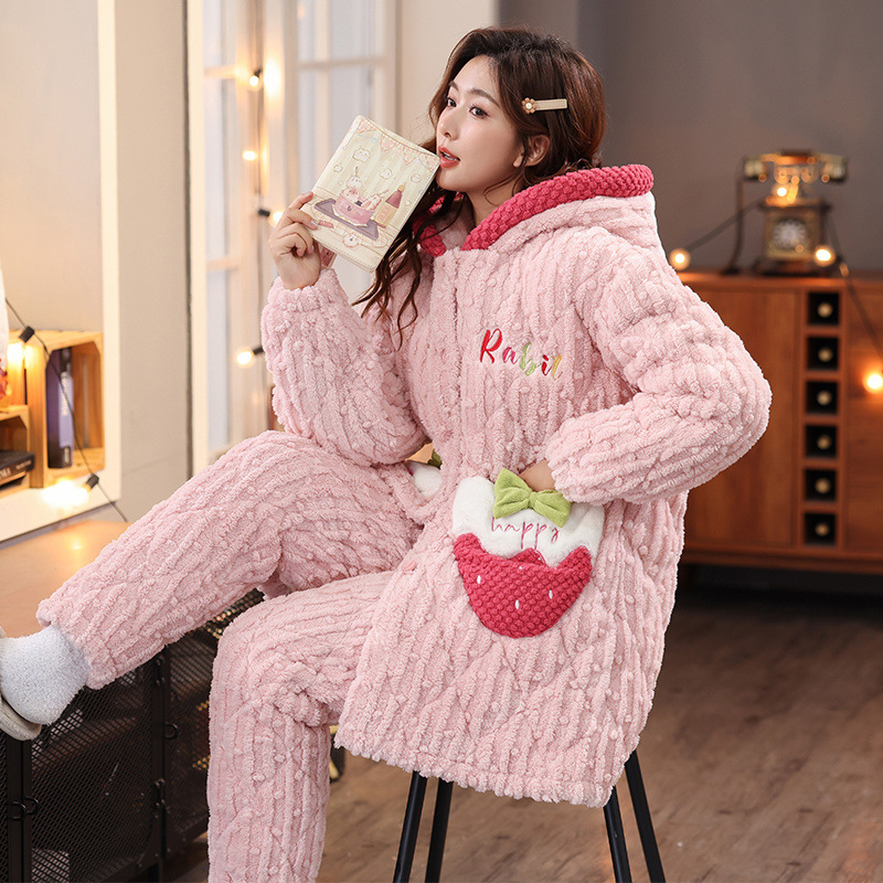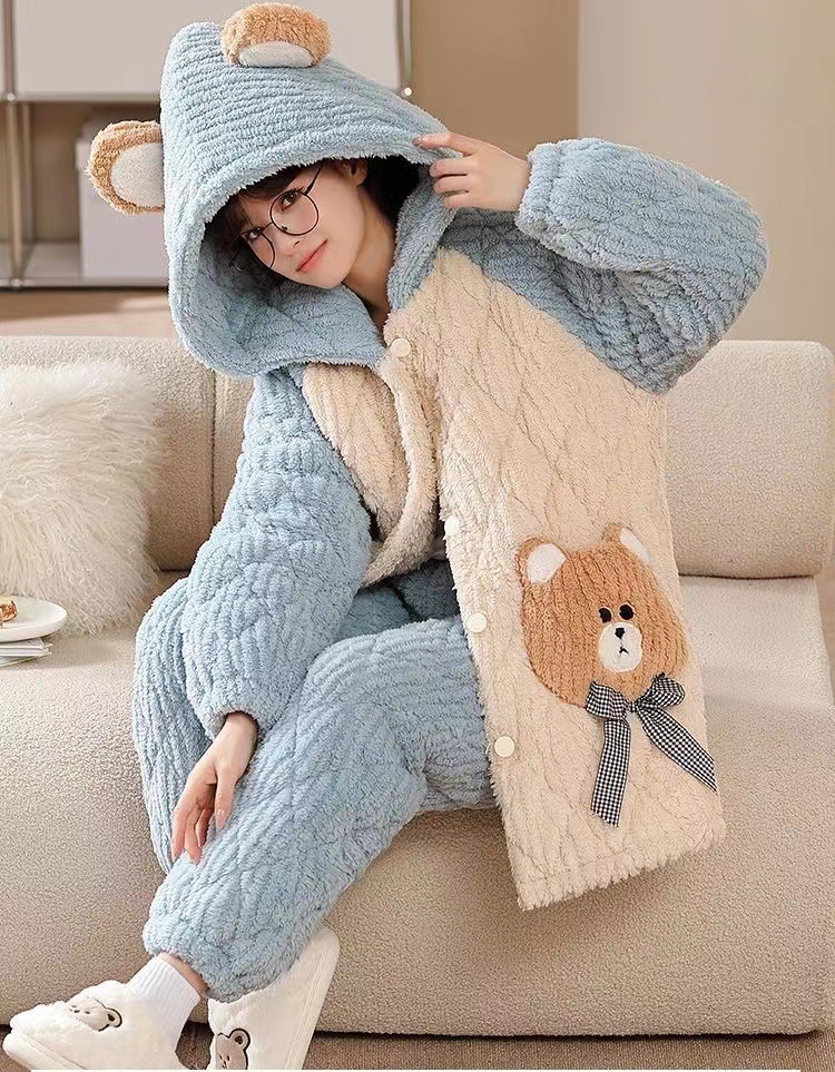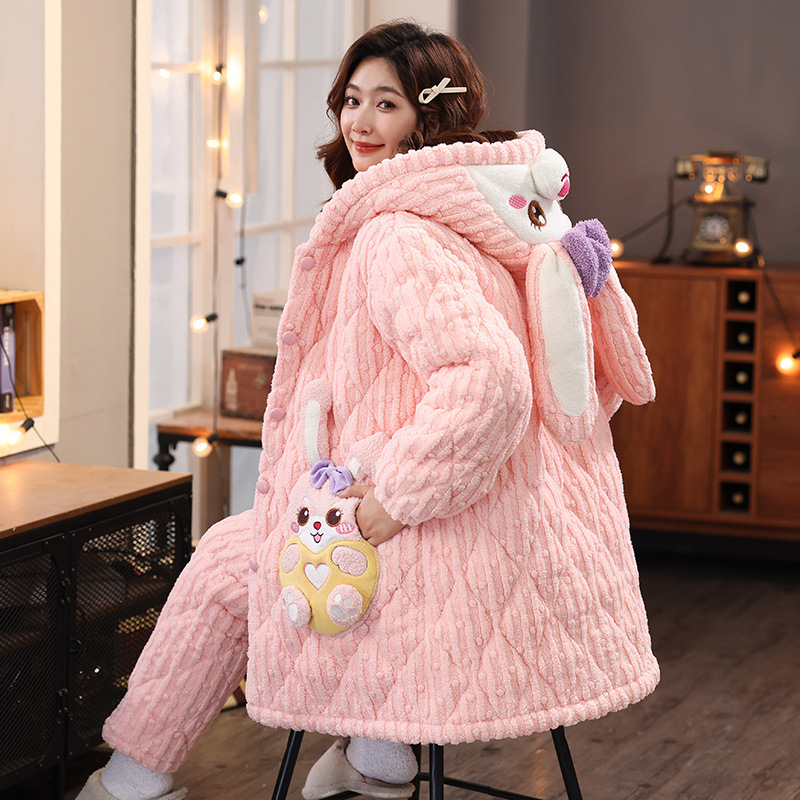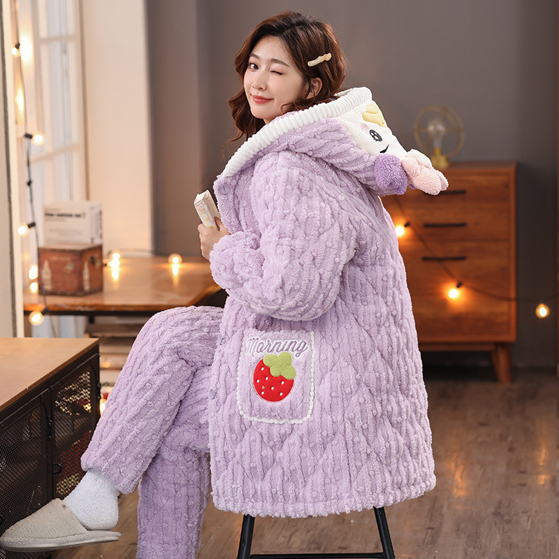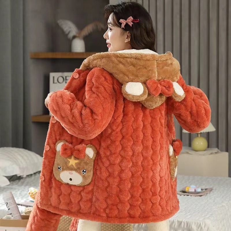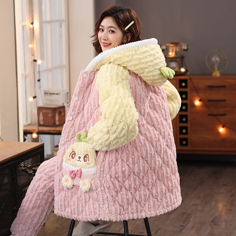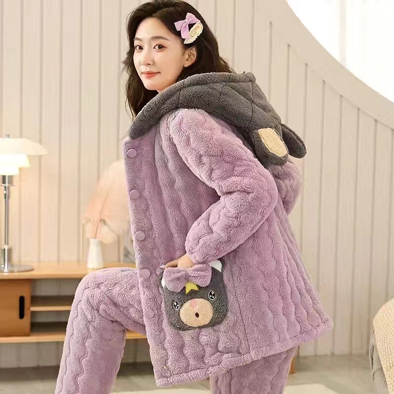 잠옷 여성의 겨울 산호 양털 3 층 퀼트 귀여운 만화 기모 두꺼운 플란넬 잠옷 홈 세트
