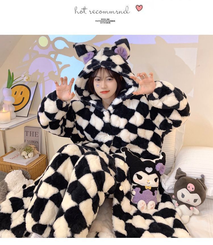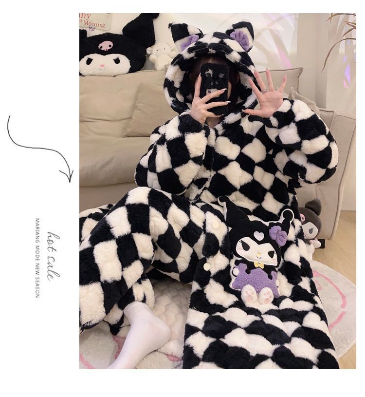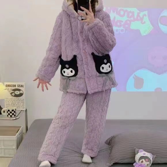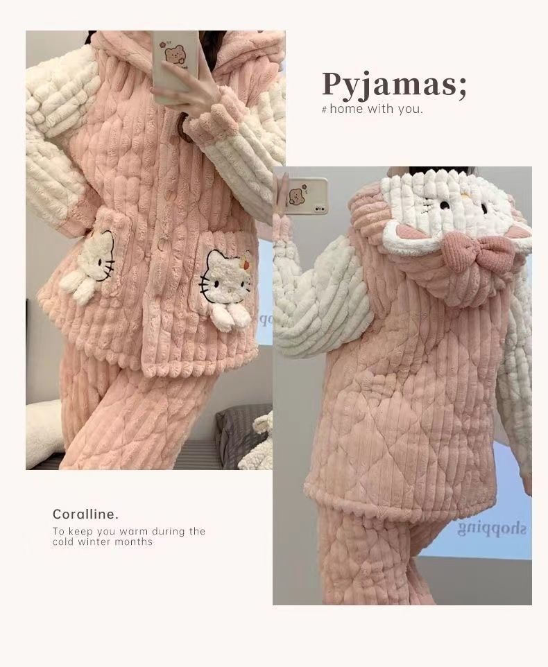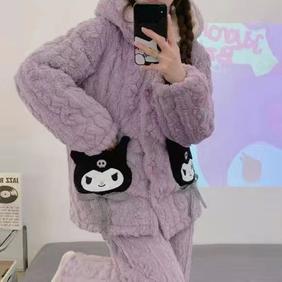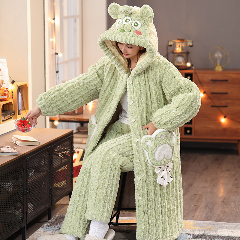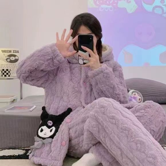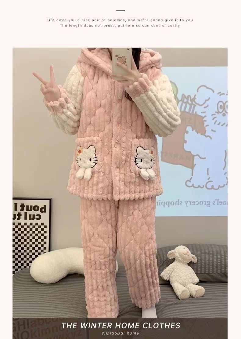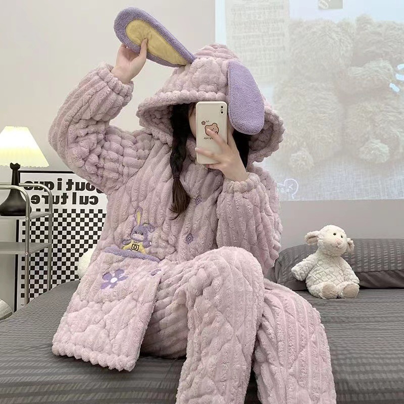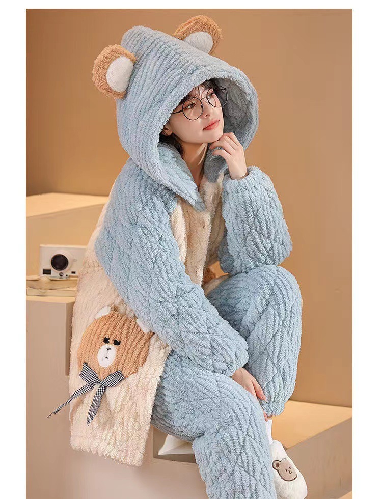 잠옷 여성의 겨울 산호 양털 3 층 퀼트 귀여운 만화 기모 두꺼운 플란넬 잠옷 홈 세트