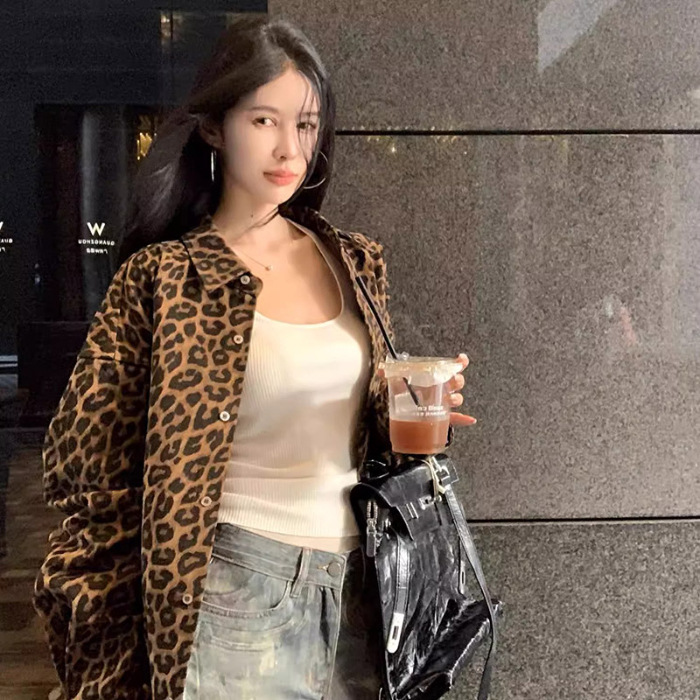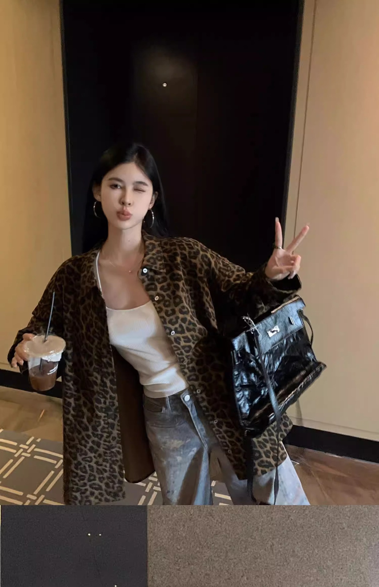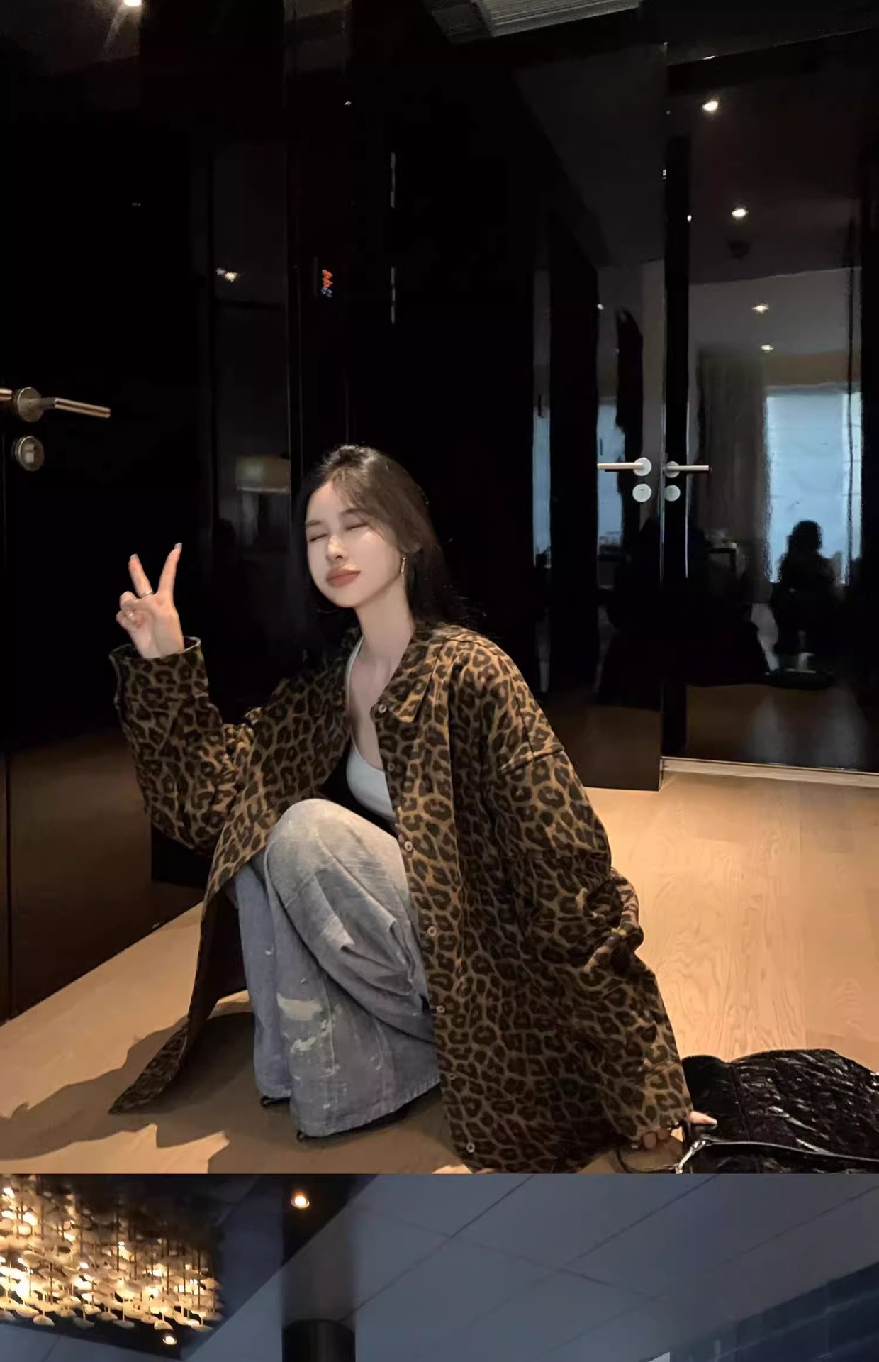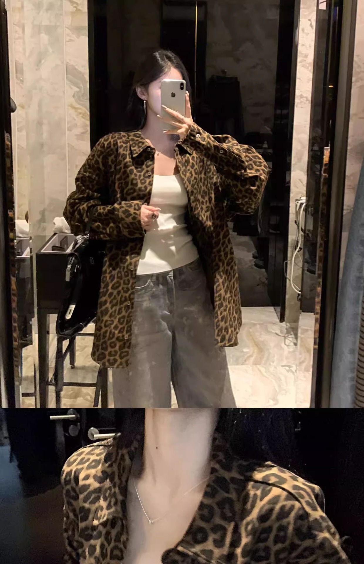 봄과 가을 여성의 유행 미국 표범 폴로 칼라 셔츠 코트 여성의 가을 디자인 느슨한 중간 길이 게으른 탑스토어 가기