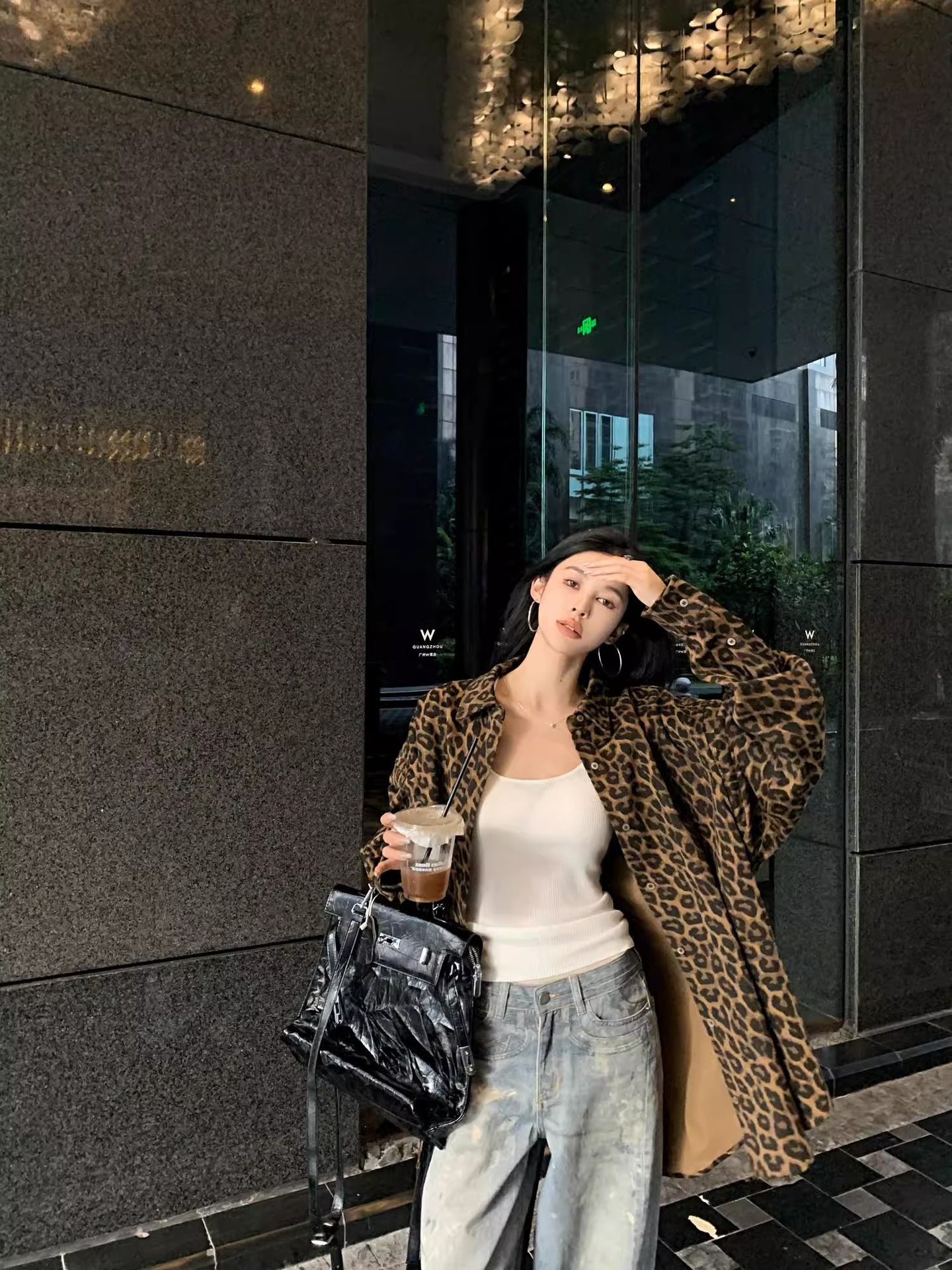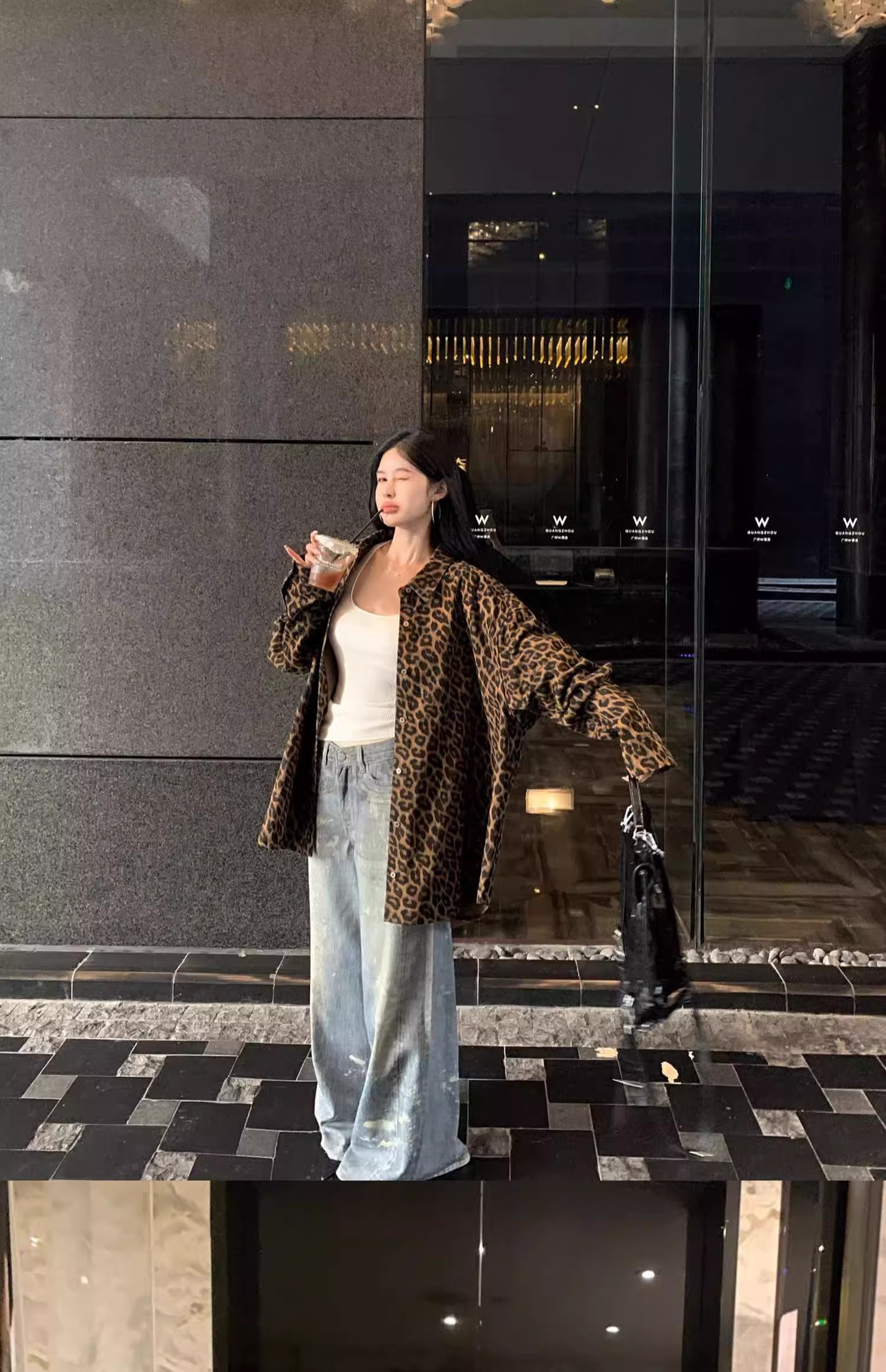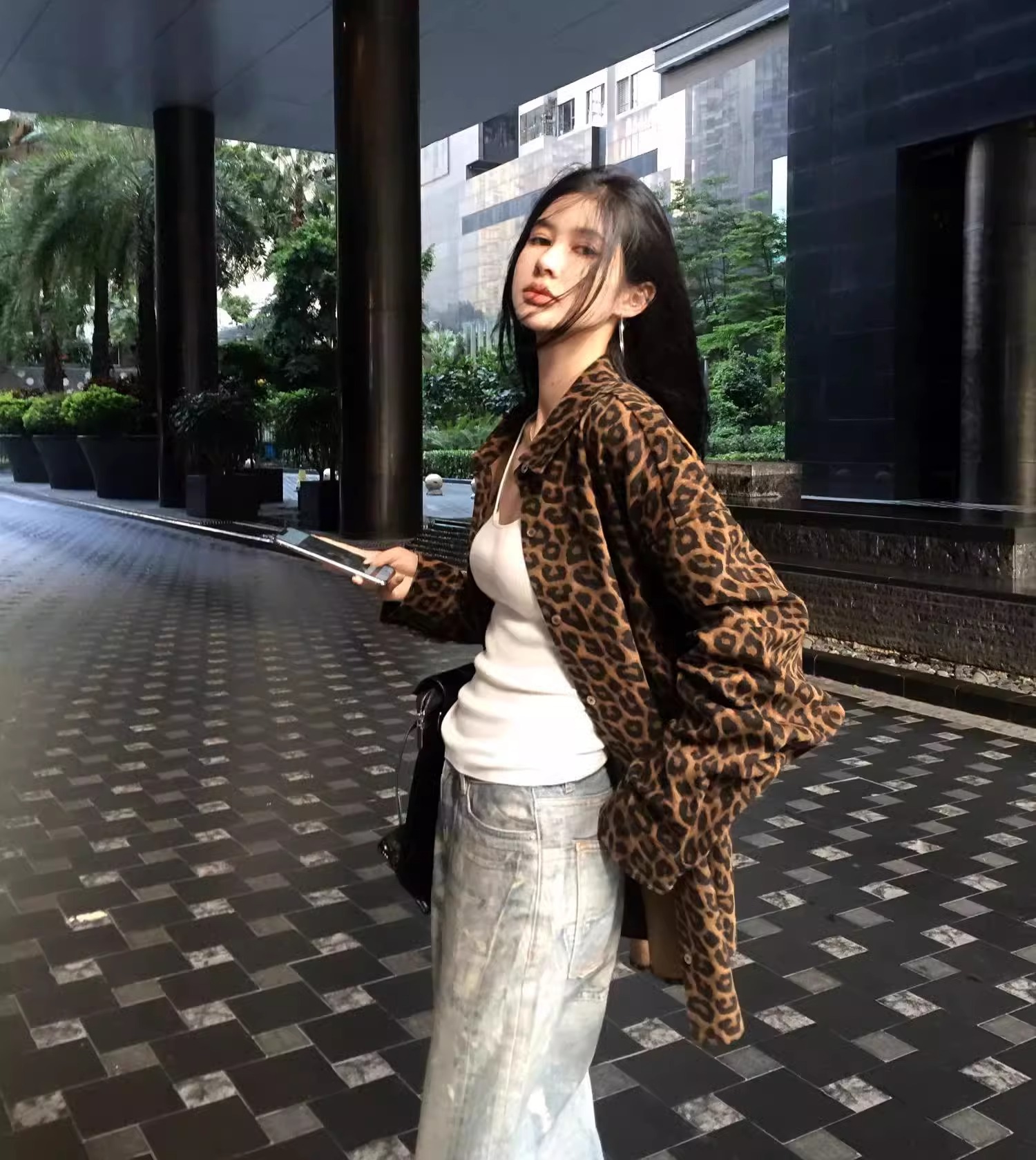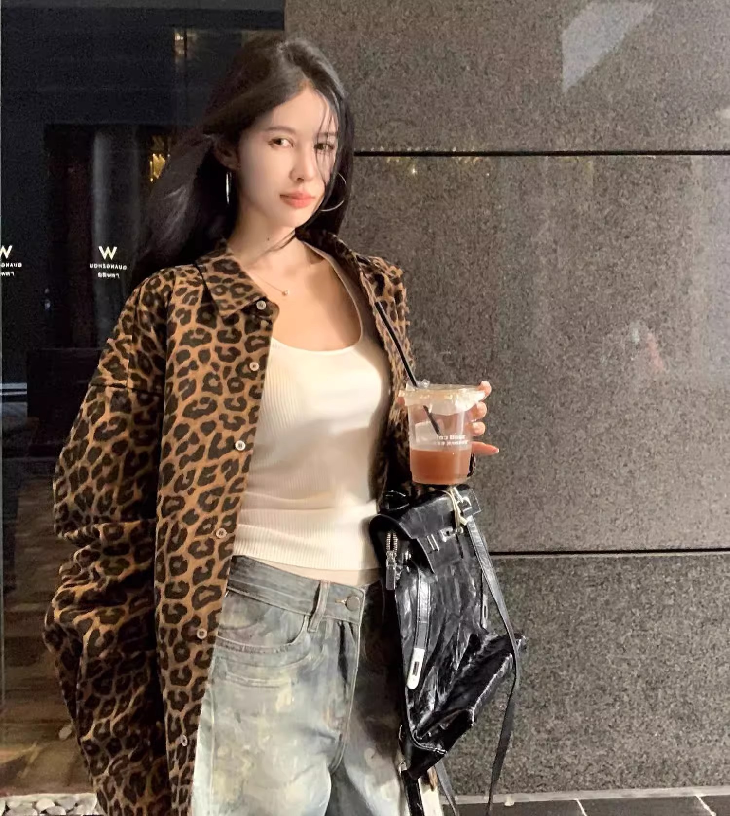 봄과 가을 여성의 유행 미국 표범 폴로 칼라 셔츠 코트 여성의 가을 디자인 느슨한 중간 길이 게으른 탑스토어 가기