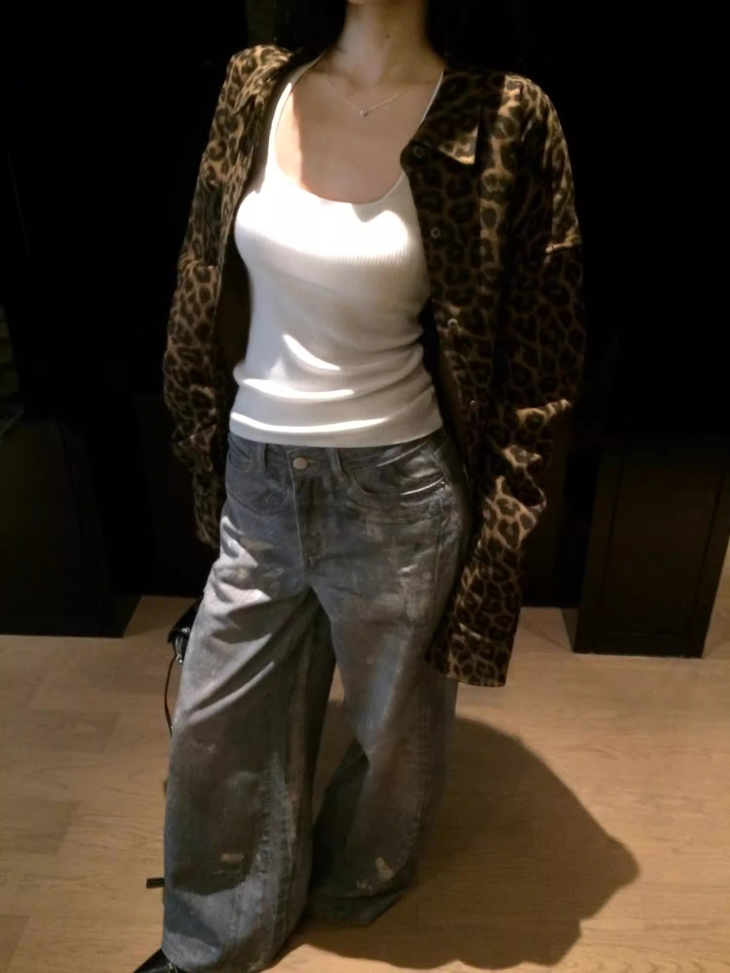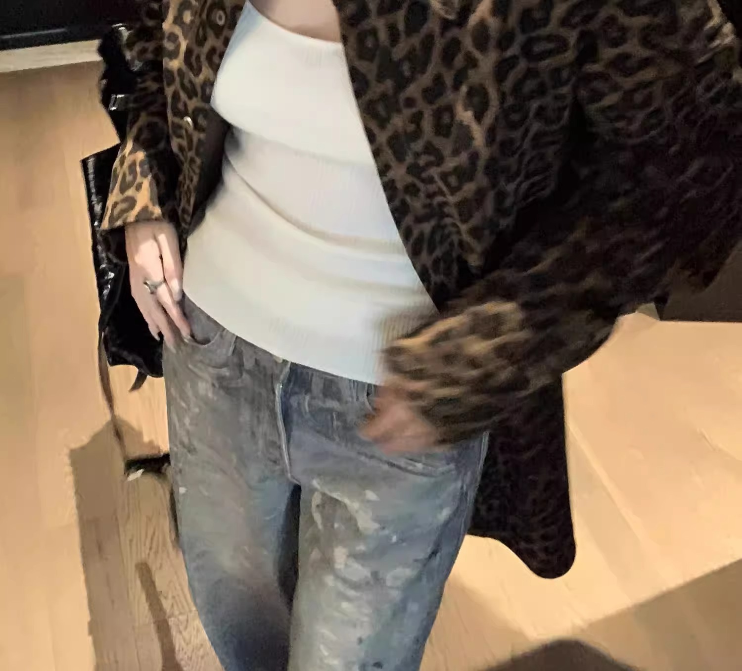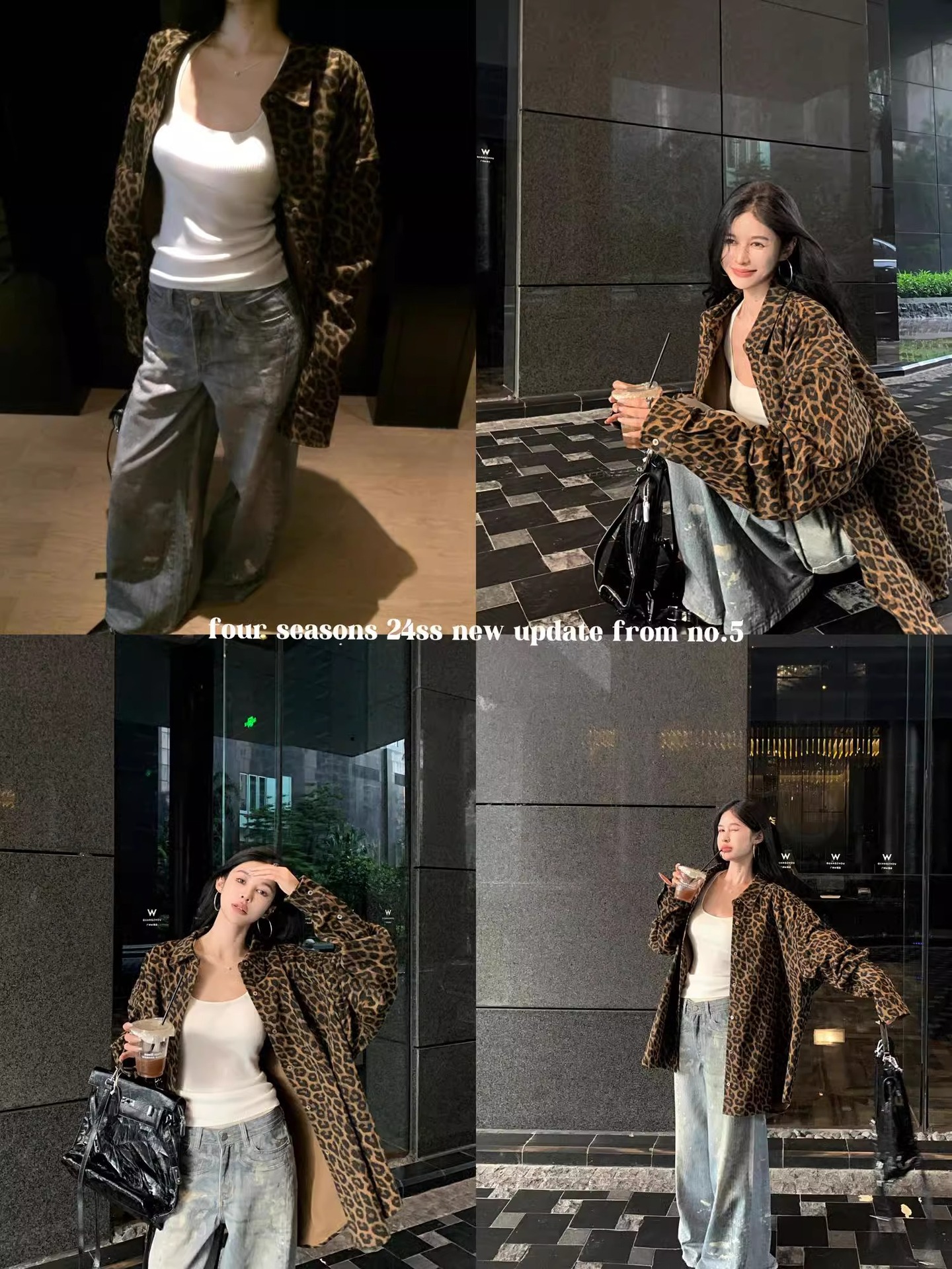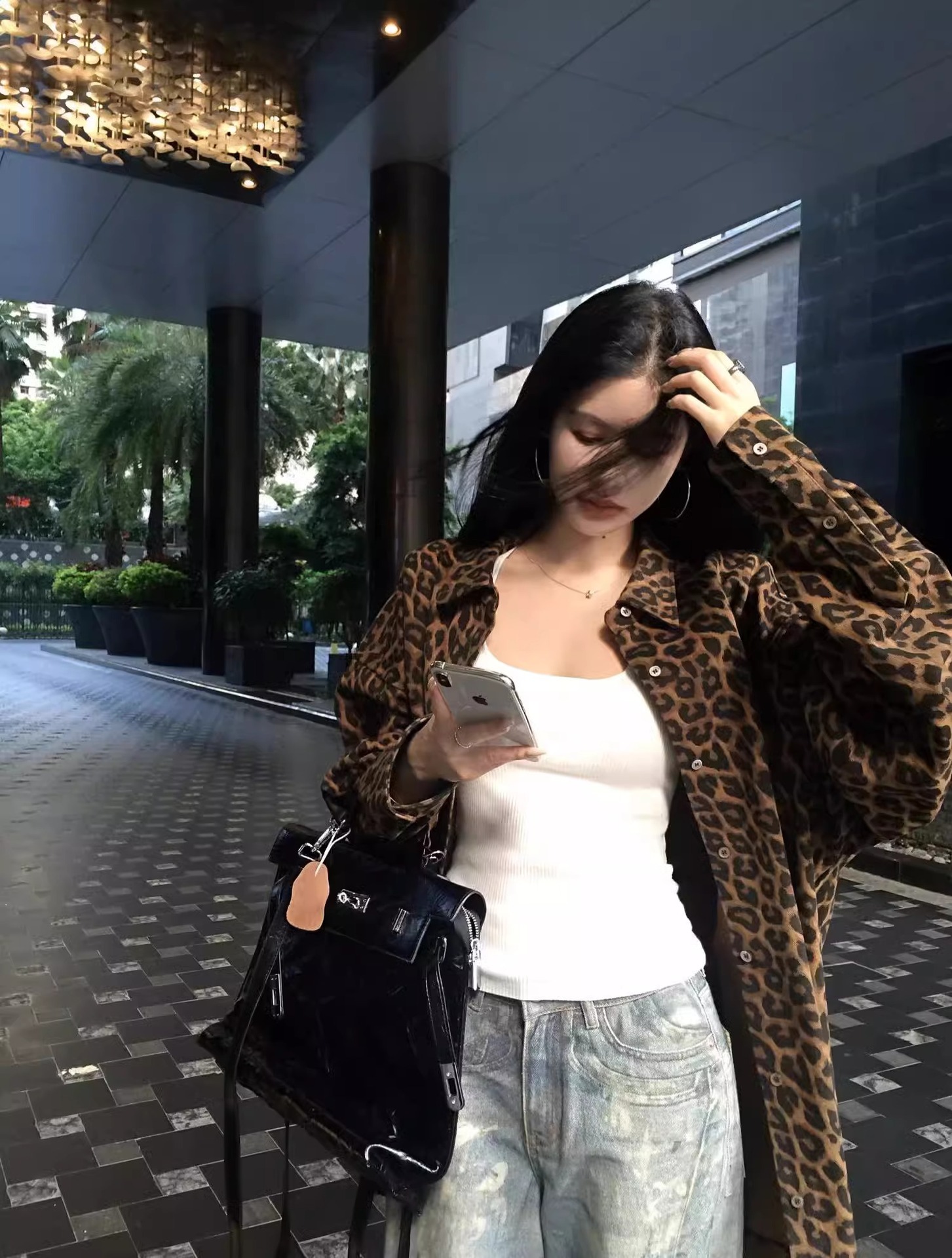 봄과 가을 여성의 유행 미국 표범 폴로 칼라 셔츠 코트 여성의 가을 디자인 느슨한 중간 길이 게으른 탑스토어 가기
