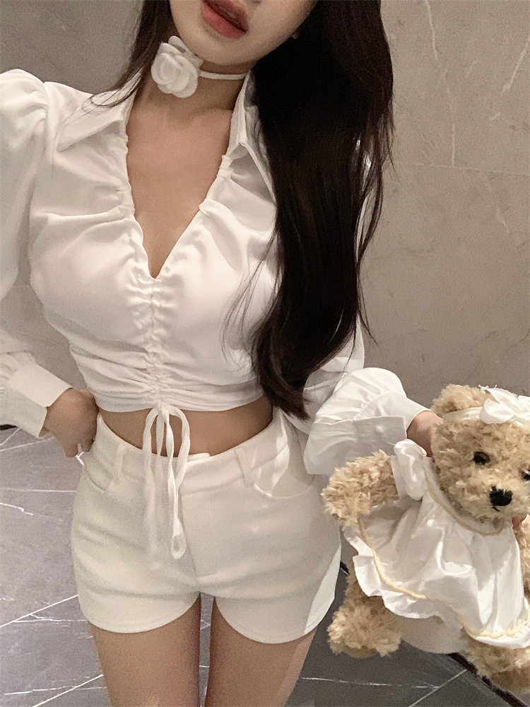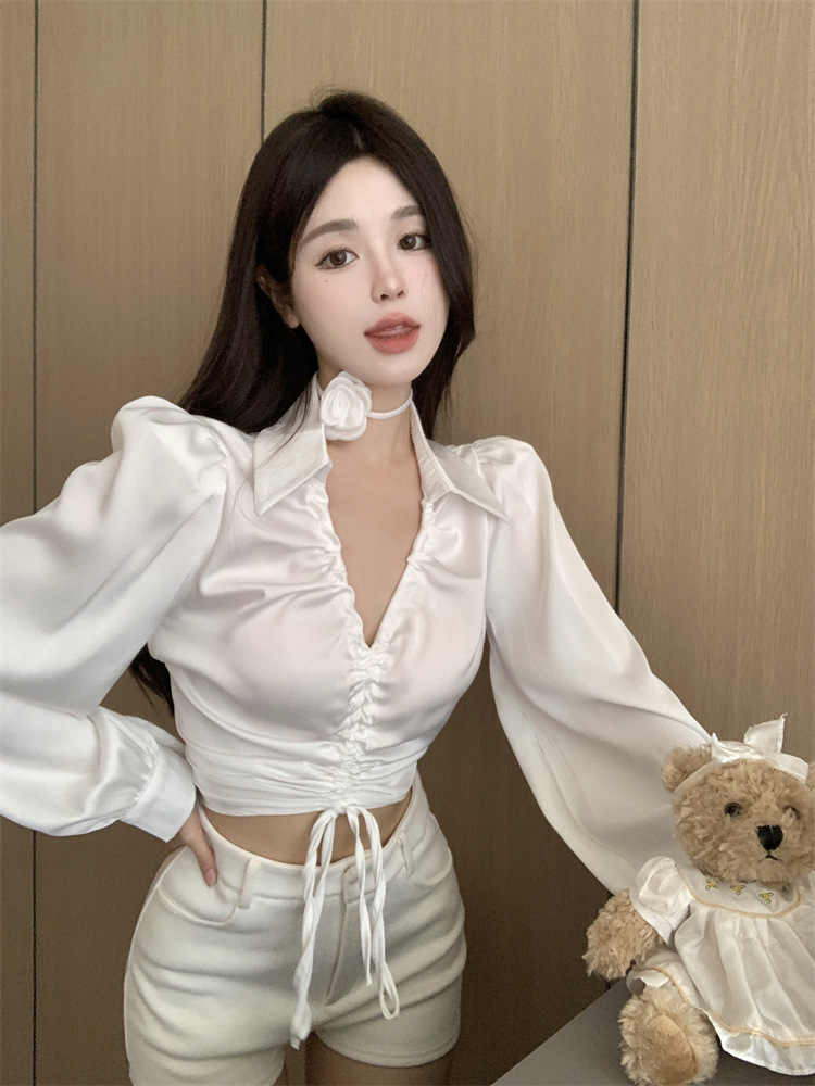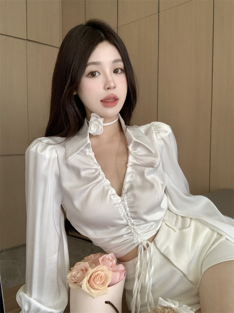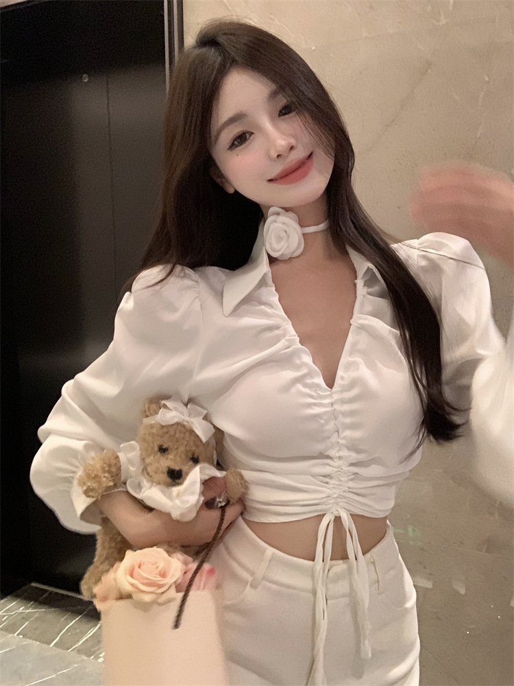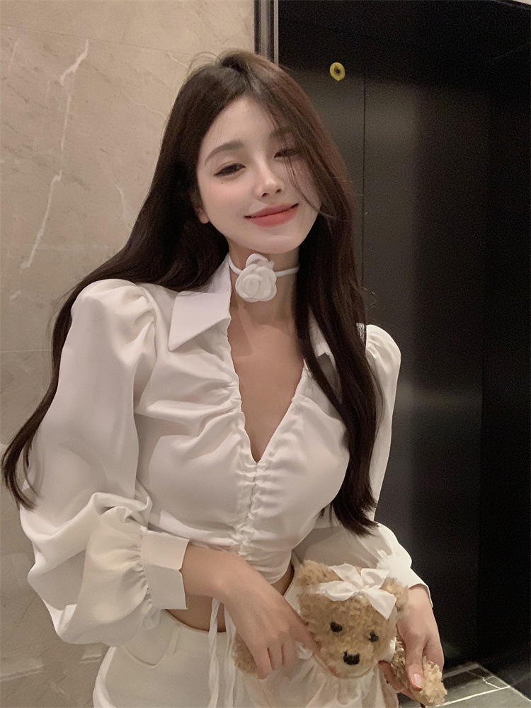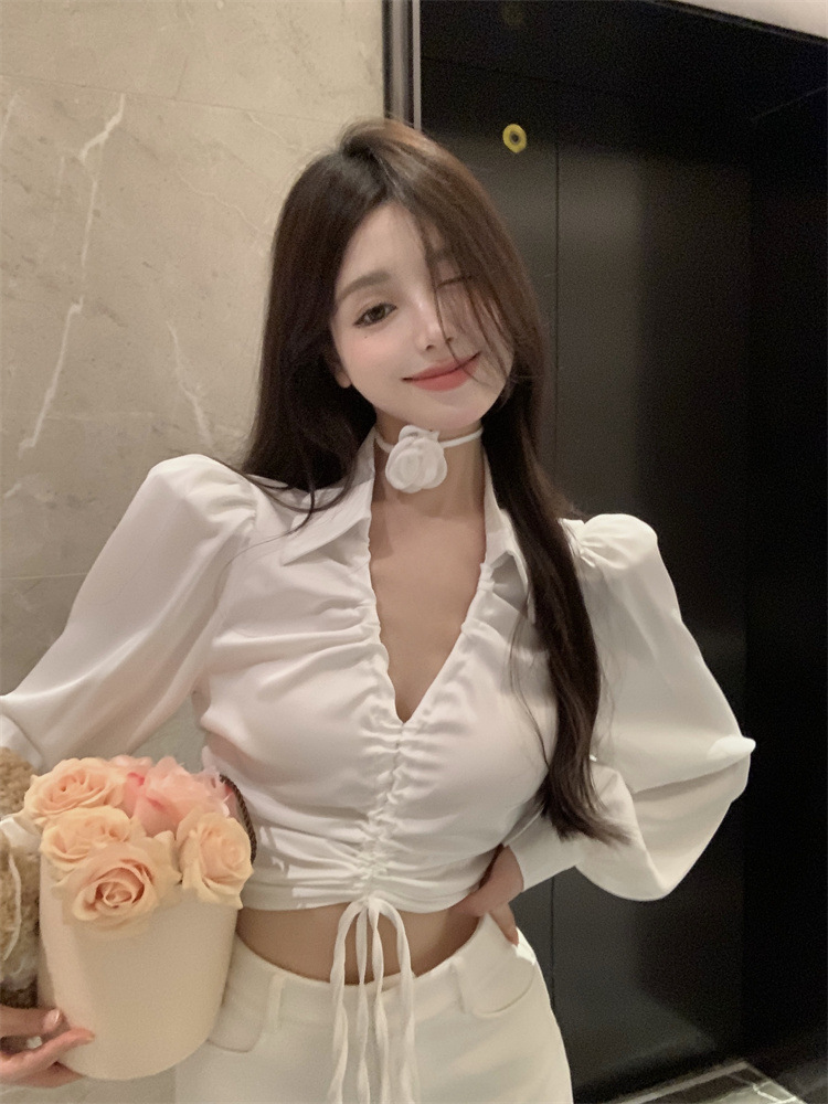 흰색 대형 오픈 딥 V 넥 핫 소녀 드로우 스트링 셔츠 여성용 봄과 가을 프랑스 V 넥 우아한 긴 소매 셔츠