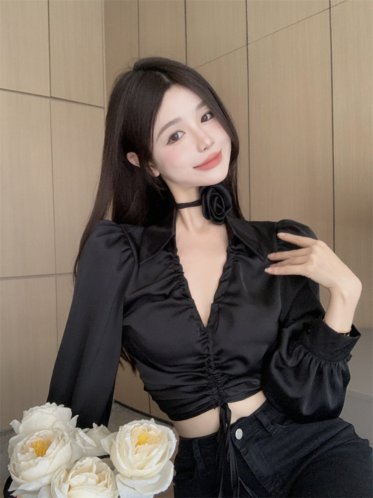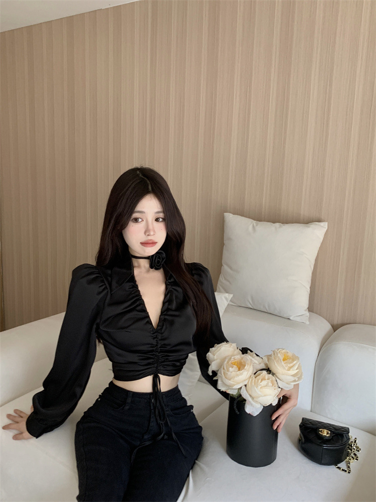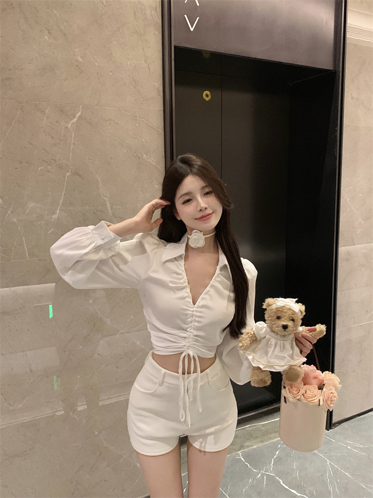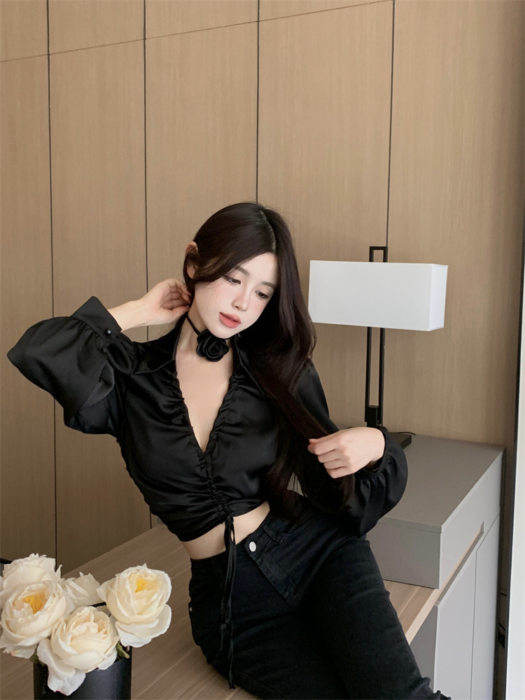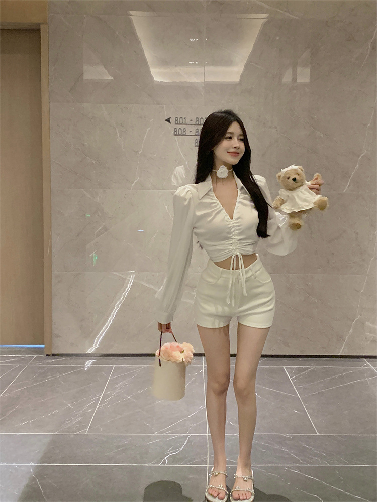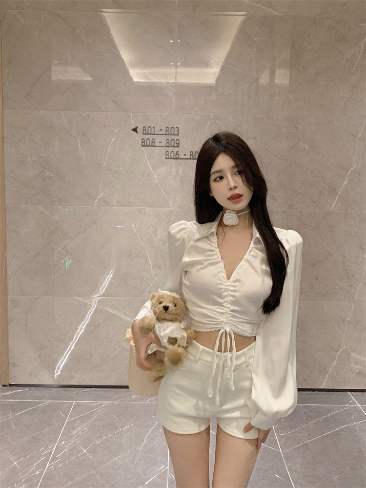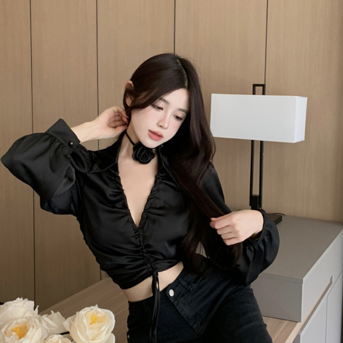 흰색 대형 오픈 딥 V 넥 핫 소녀 드로우 스트링 셔츠 여성용 봄과 가을 프랑스 V 넥 우아한 긴 소매 셔츠