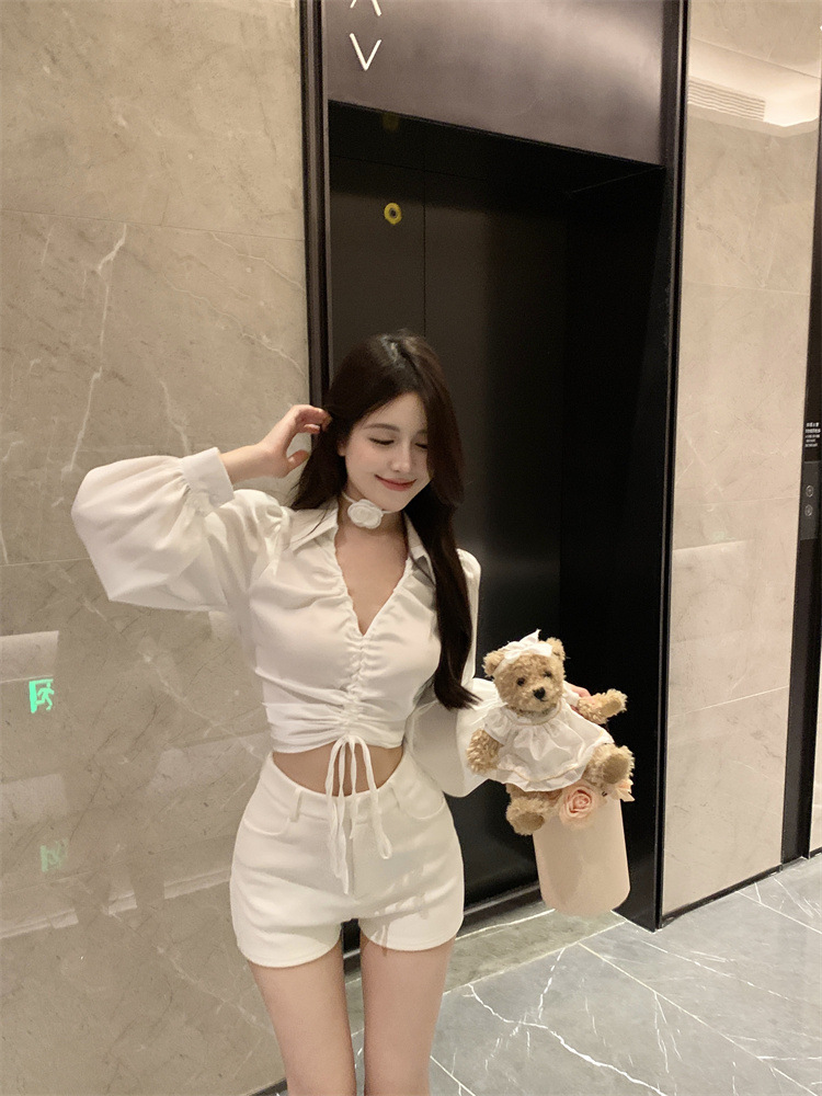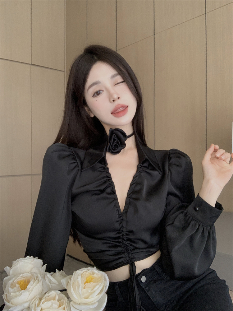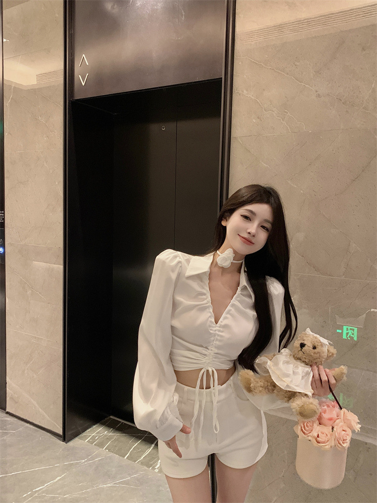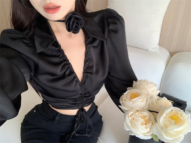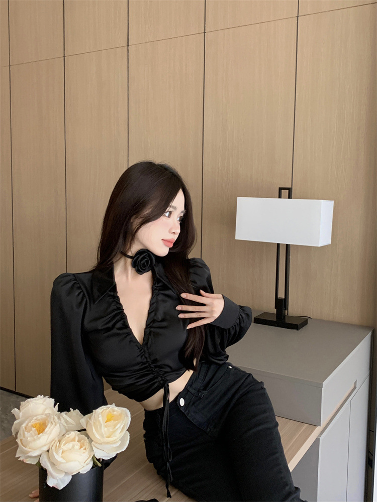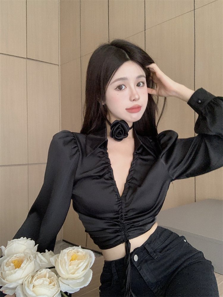 흰색 대형 오픈 딥 V 넥 핫 소녀 드로우 스트링 셔츠 여성용 봄과 가을 프랑스 V 넥 우아한 긴 소매 셔츠