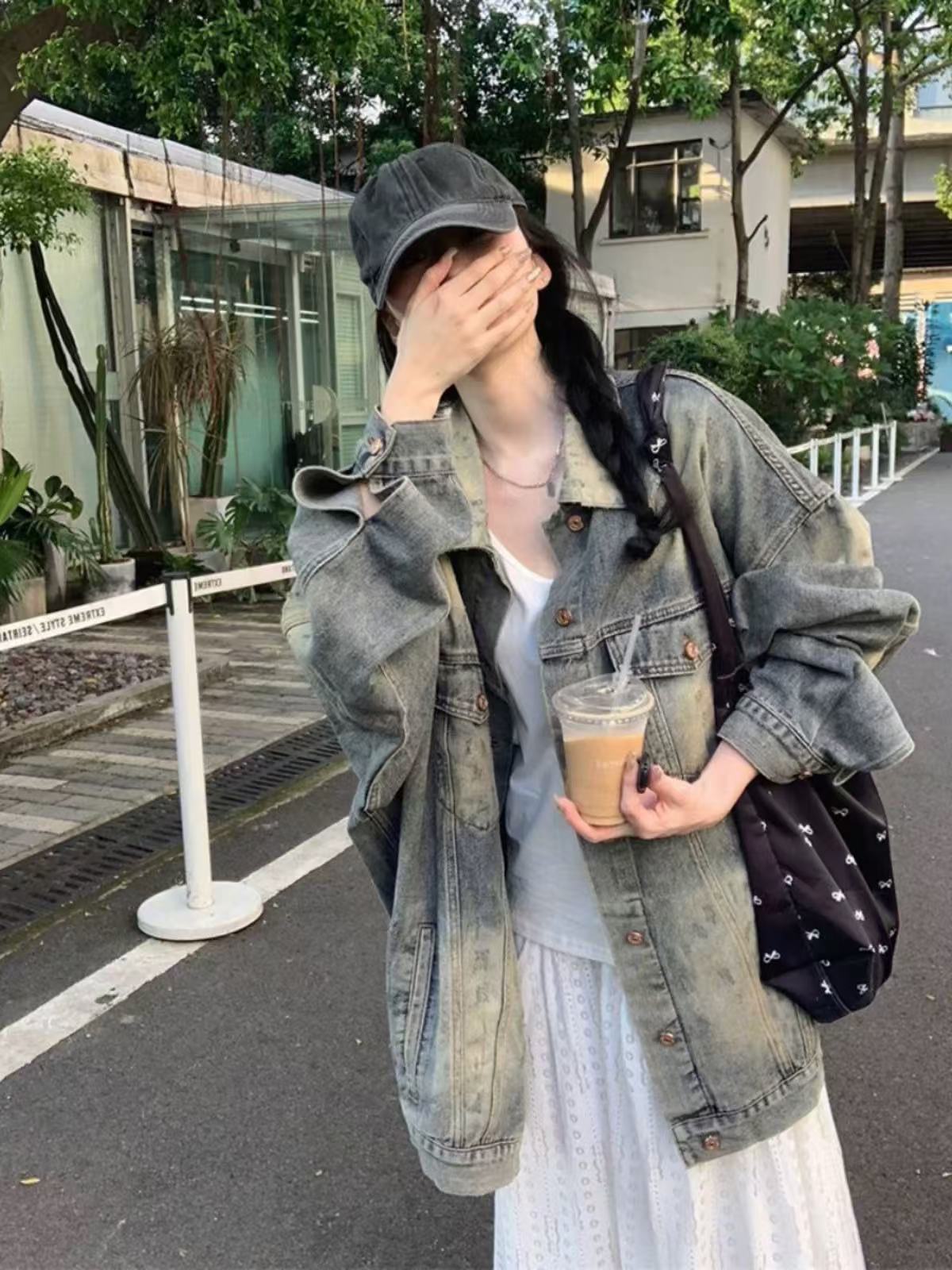 하이 스트리트 아메리칸 스타일 빈티지 올드 데님 코트 여성용 봄과 가을 루즈 오버 사이즈 미드 길이 재킷 탑스토어 가기