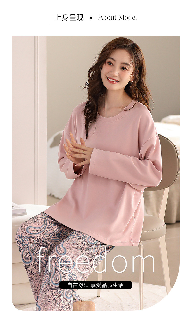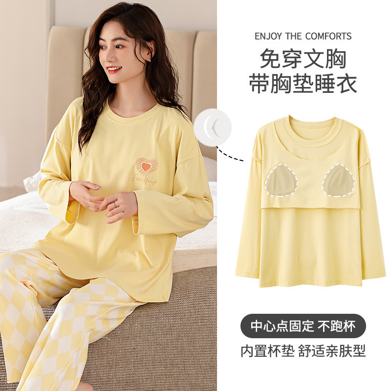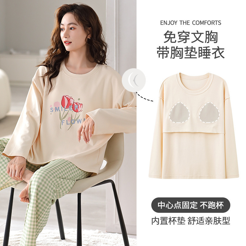 가슴 패드가 달린 잠옷 여성 봄과 가을 긴 소매 코튼 둥근 목 느슨한 편안한 캐주얼 의류 홈 세트