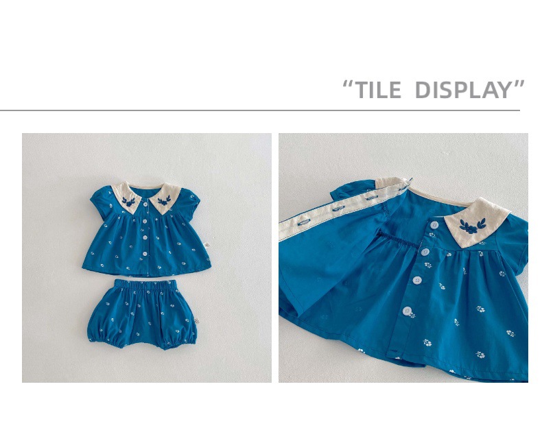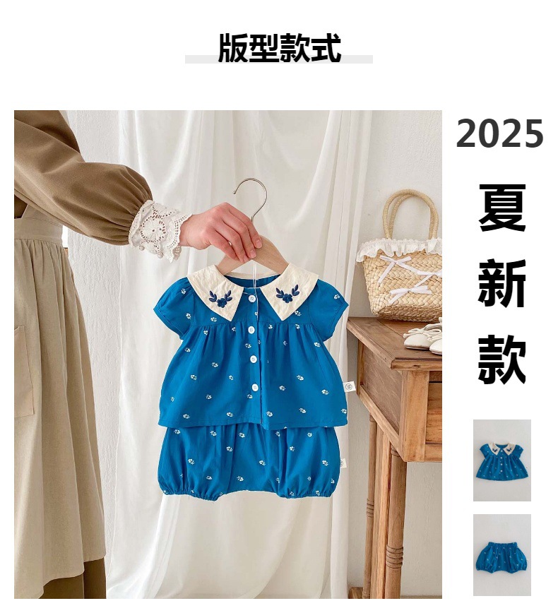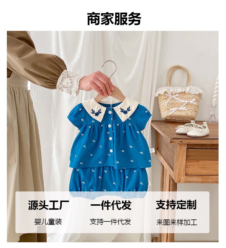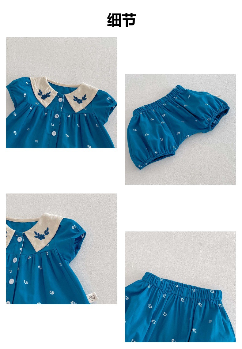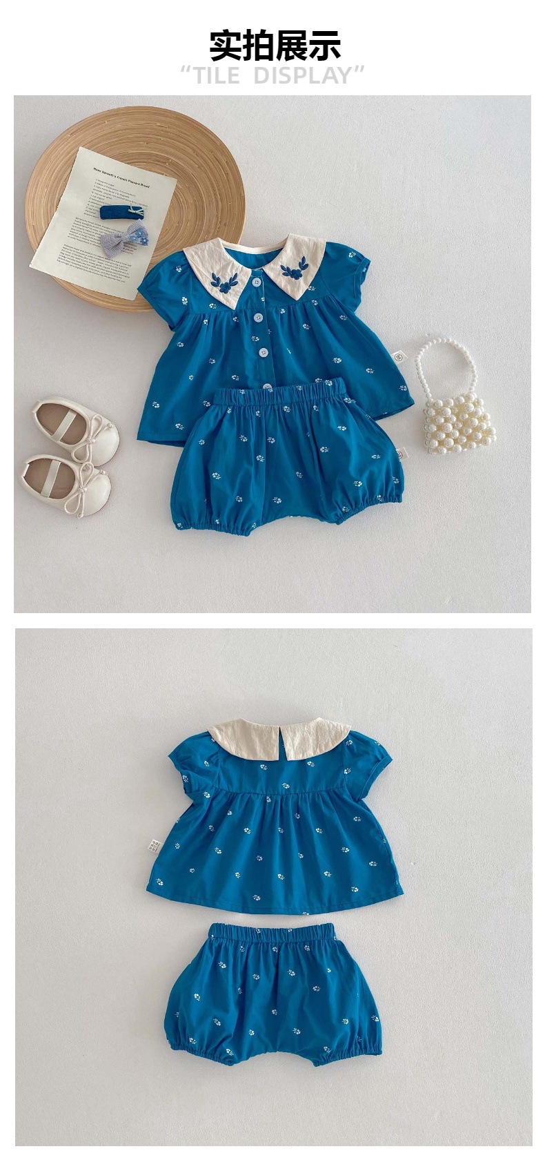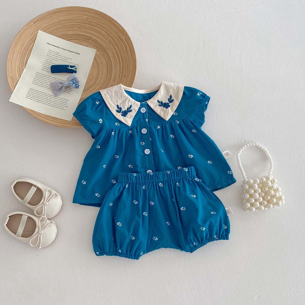 한국 스타일 여름 새로운 꽃 자수 인형 칼라 짧은 소매 세트 아기 소녀 아기 거품 짧은 소매 외출 옷
