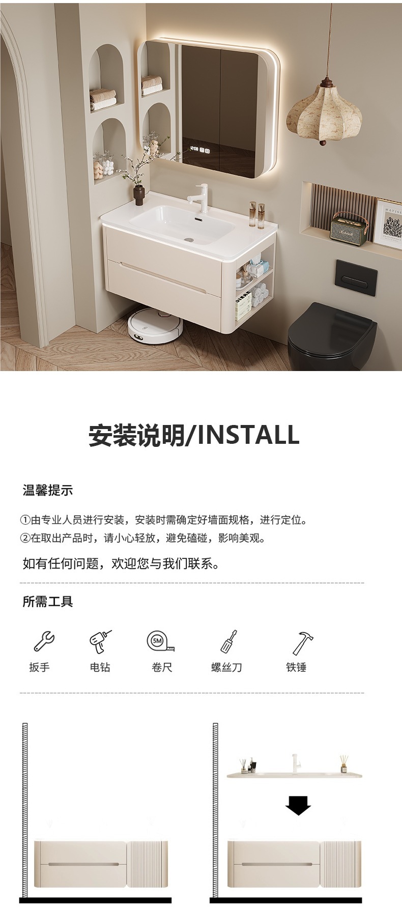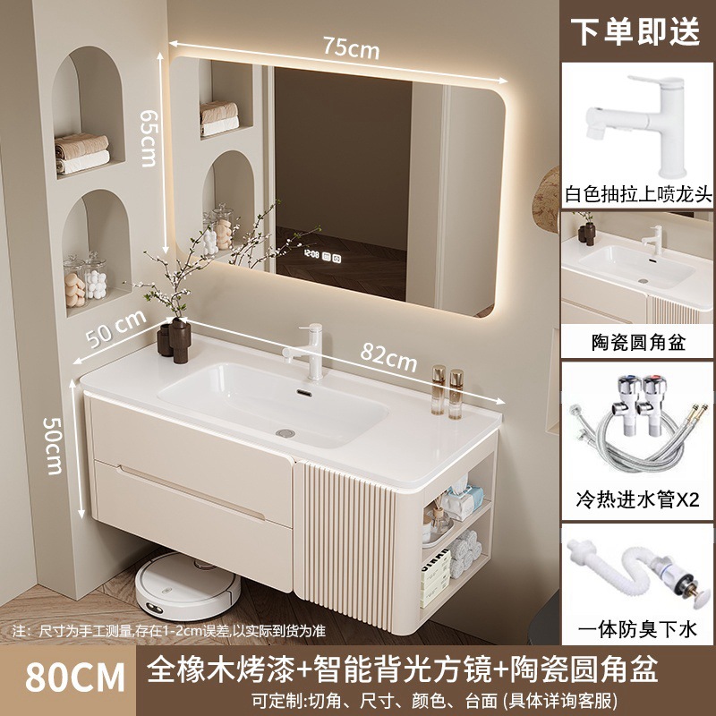 • 80CM 아크 풀 미러 상하 조명 거울 캐비닛 + 세라믹 일체형 세면대 무료 설치 + 기본 오른쪽 캐비닛, 왼쪽 연결 필요
