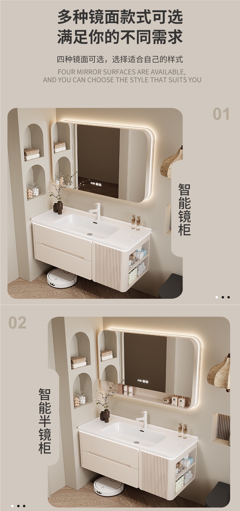 • 60CM 개방형 스마트 수납 거울 캐비닛 + 세라믹 일체형 세면대 무료 설치 + 기본 오른쪽 캐비닛, 왼쪽 연결 필요