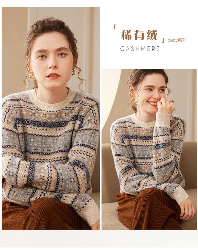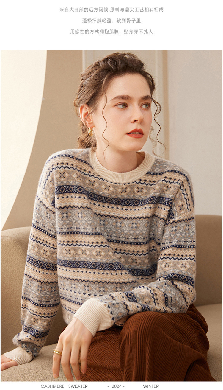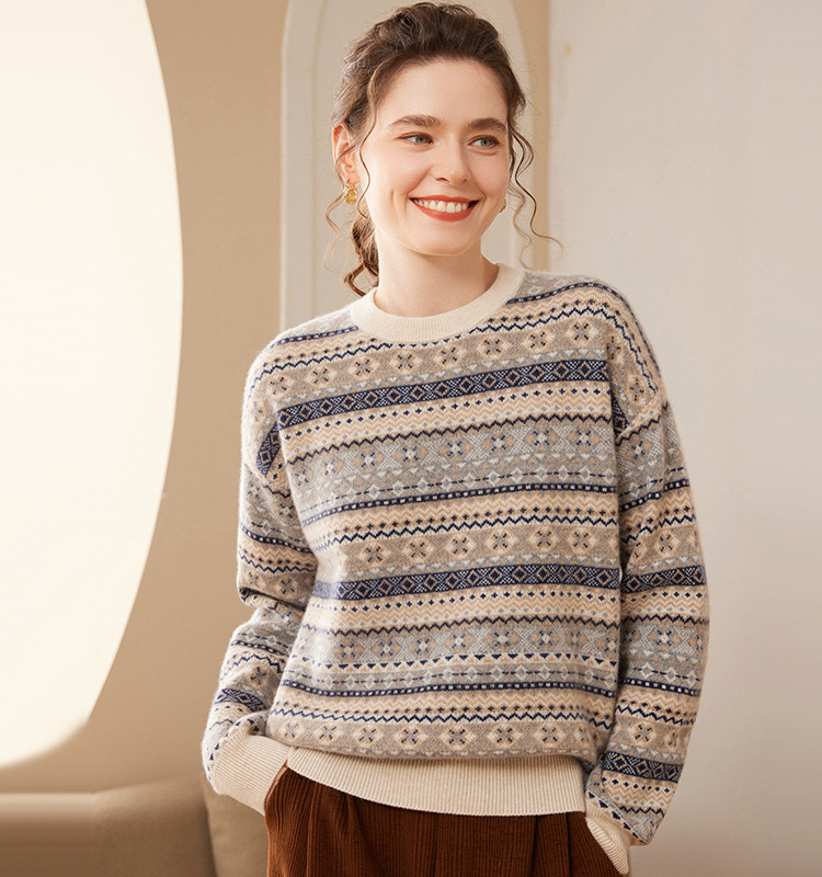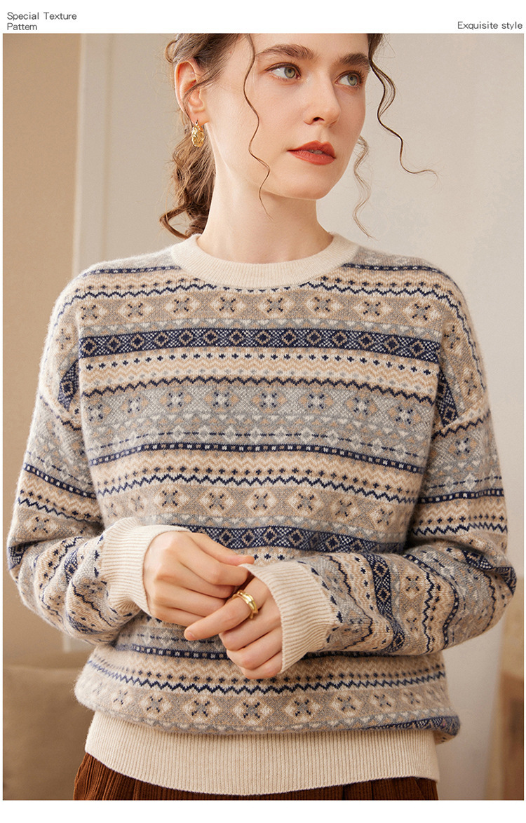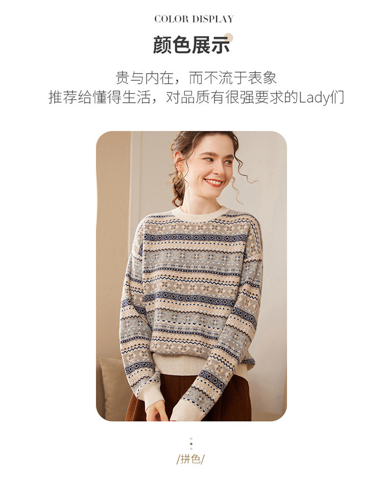 가을과 겨울 새로운 라운드 넥 마운틴 캐시미어 스웨터 여성용 빈티지 컬러 블록 자카드 두꺼운 스웨터 느슨한 캐시미어베이스 셔츠스토어 가기