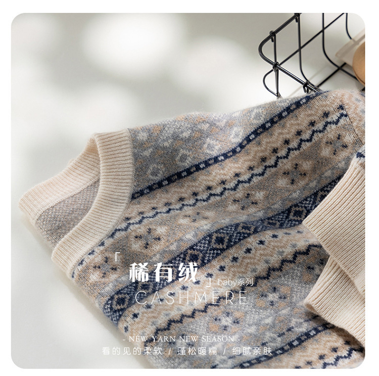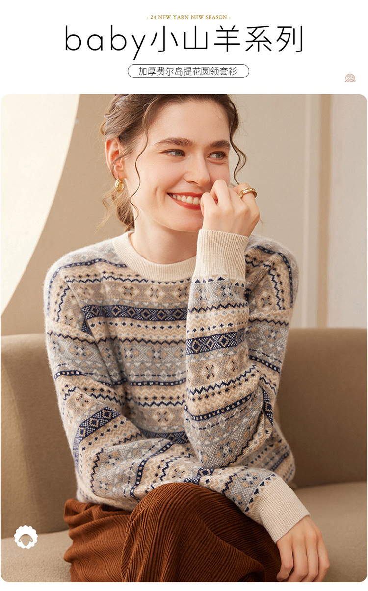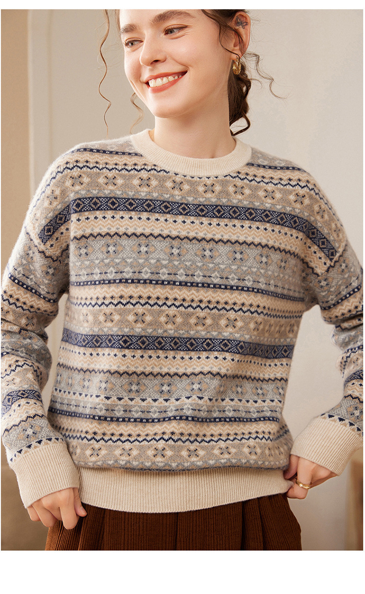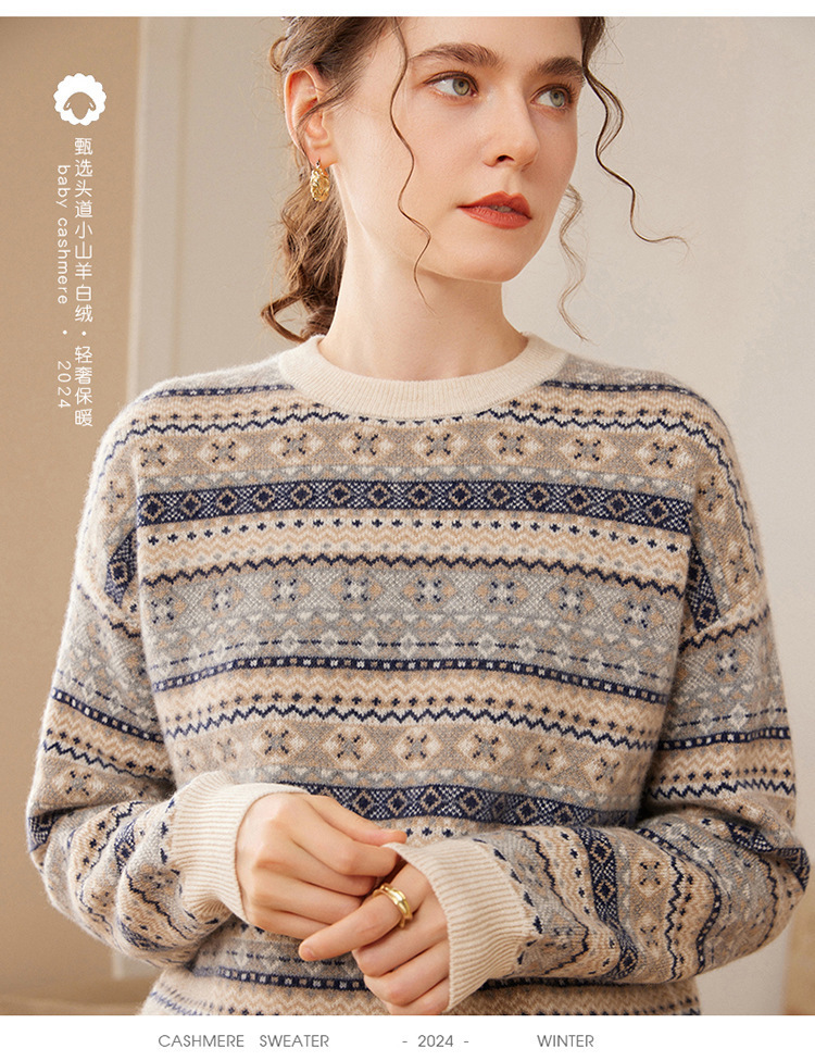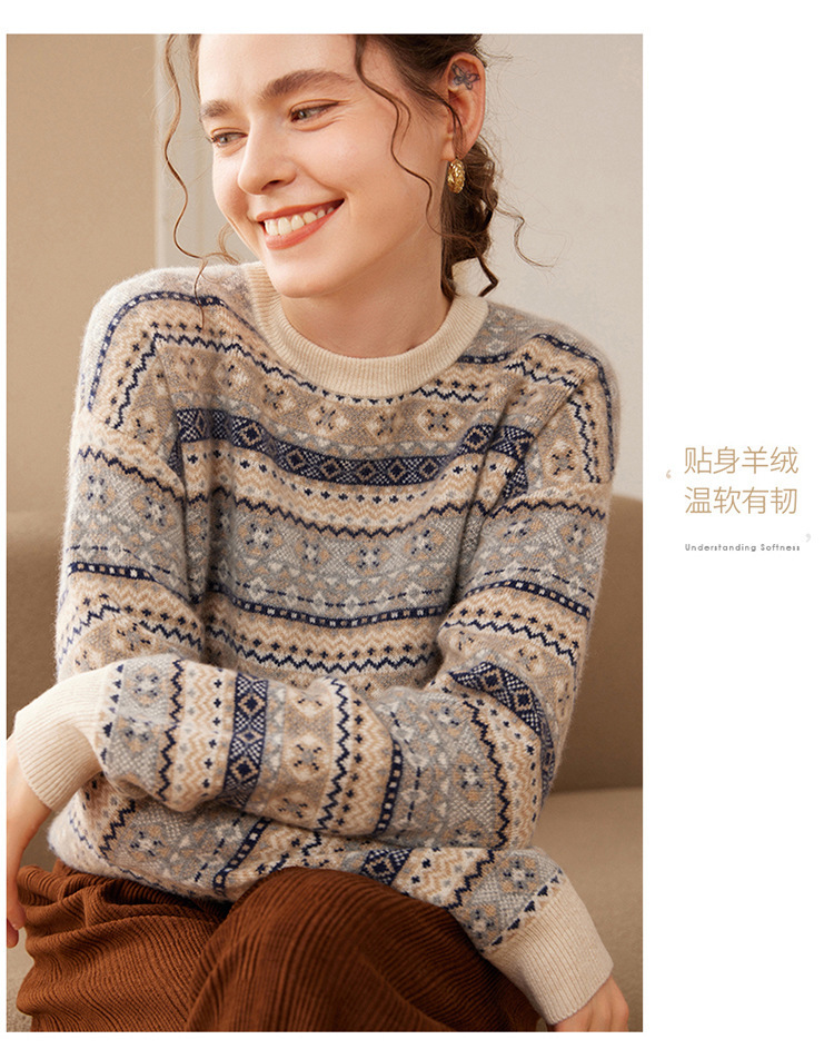 가을과 겨울 새로운 라운드 넥 마운틴 캐시미어 스웨터 여성용 빈티지 컬러 블록 자카드 두꺼운 스웨터 느슨한 캐시미어베이스 셔츠스토어 가기