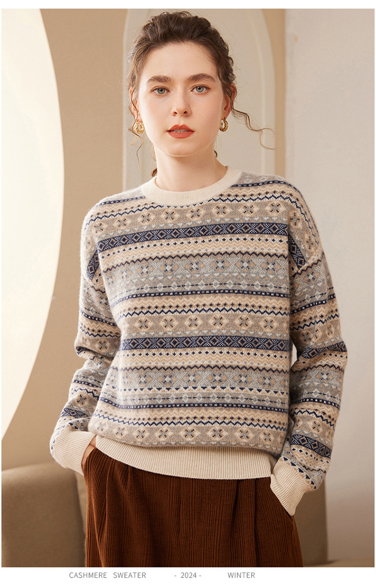 가을과 겨울 새로운 라운드 넥 마운틴 캐시미어 스웨터 여성용 빈티지 컬러 블록 자카드 두꺼운 스웨터 느슨한 캐시미어베이스 셔츠