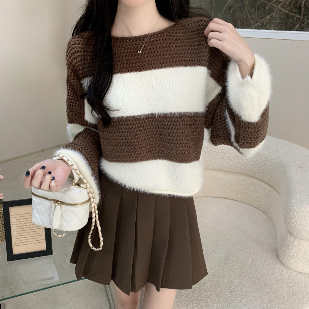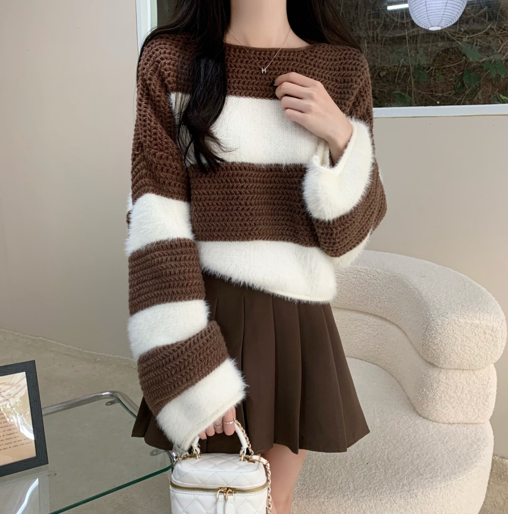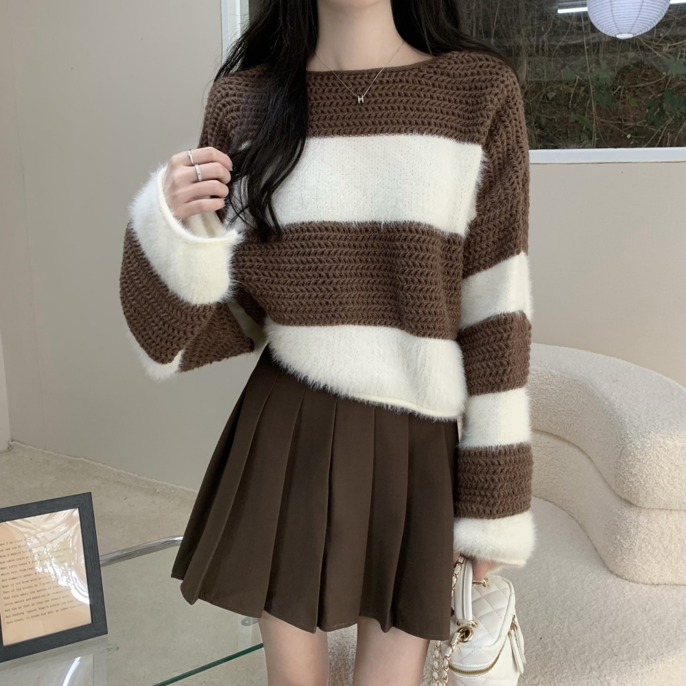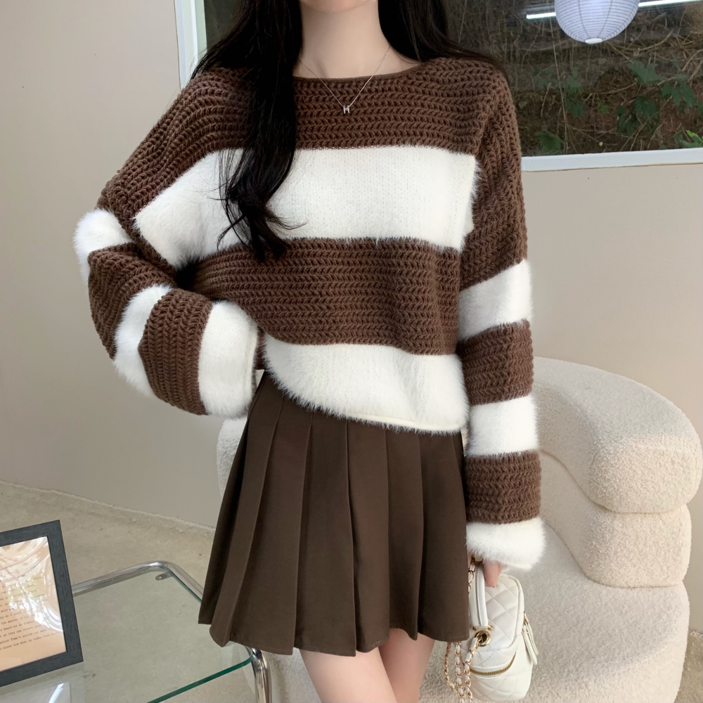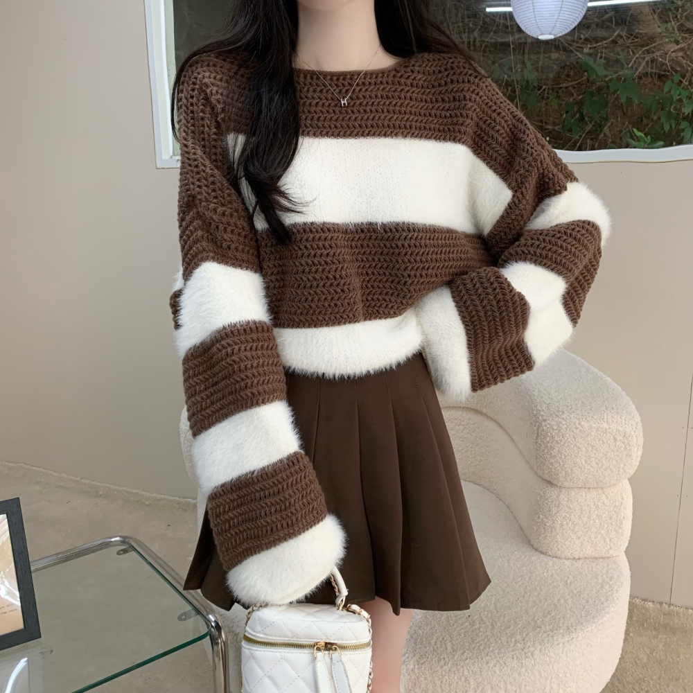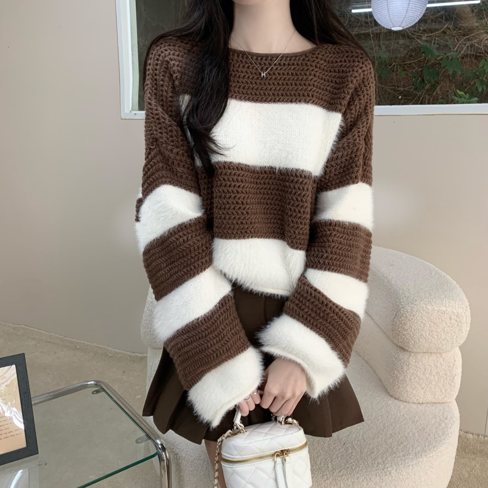 두꺼운 짧은 Maillard 다크 브라운 줄무늬 밍크 스웨터 여성의 가을과 겨울 느슨한 게으른 니트 탑