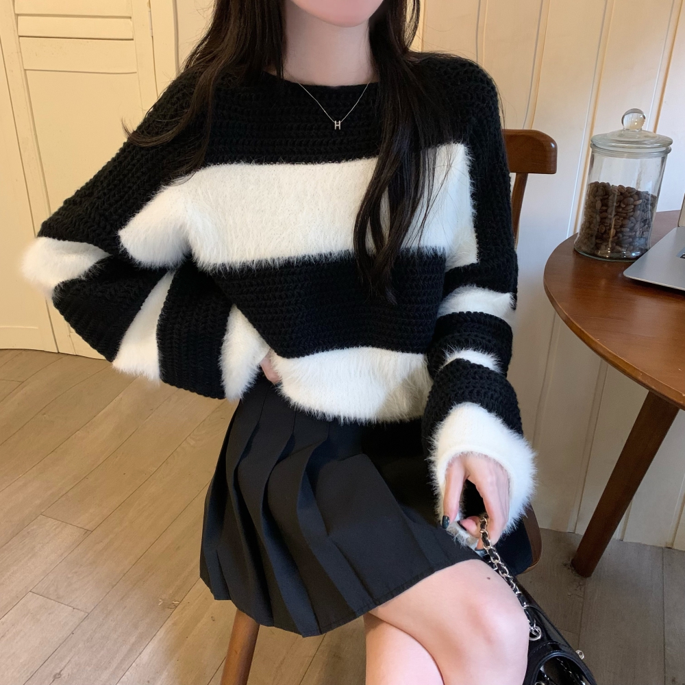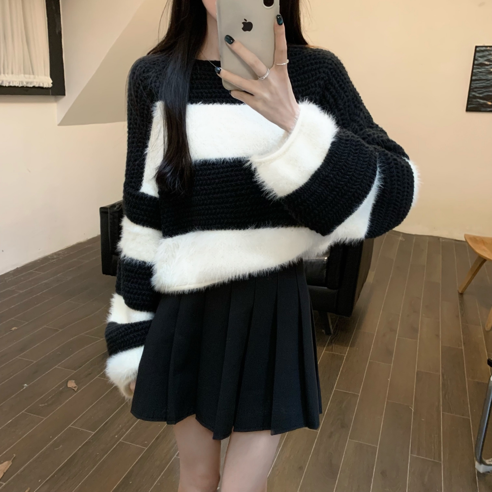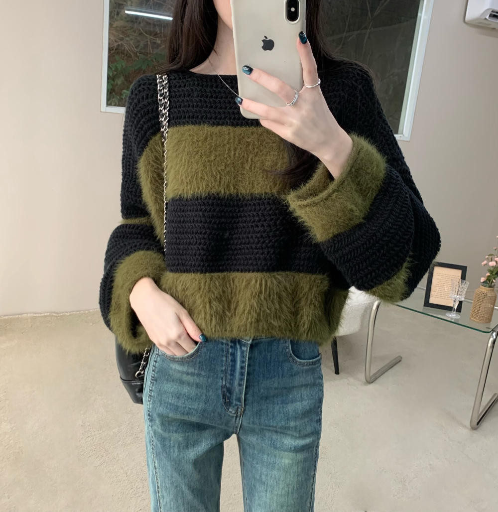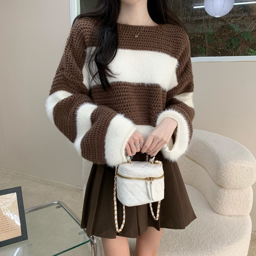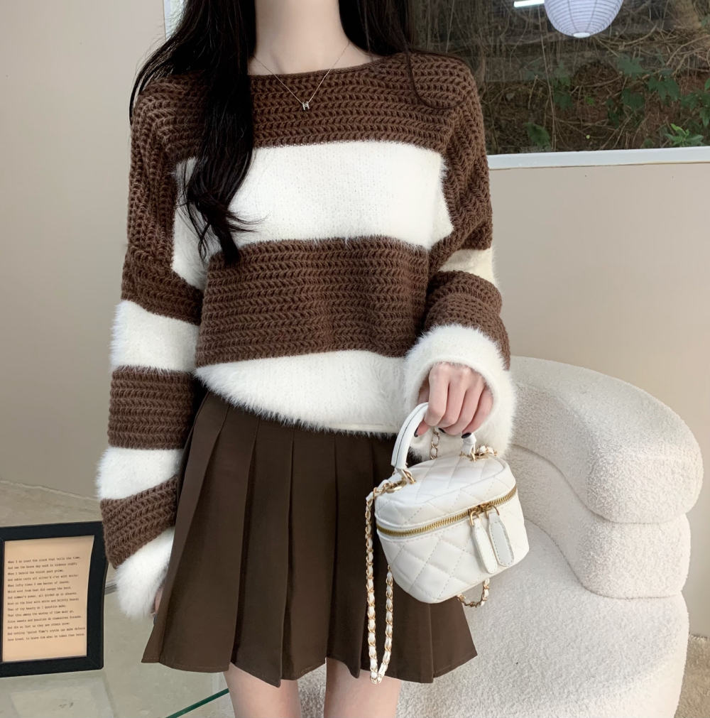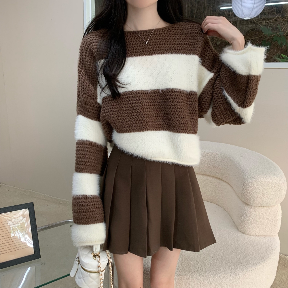 두꺼운 짧은 Maillard 다크 브라운 줄무늬 밍크 스웨터 여성의 가을과 겨울 느슨한 게으른 니트 탑