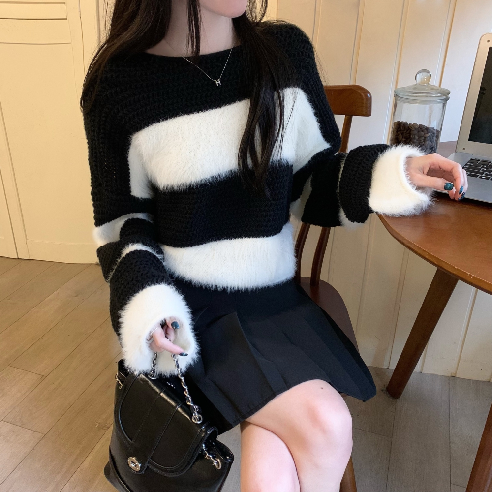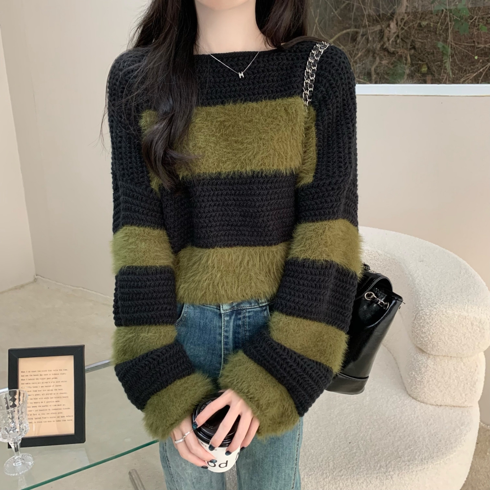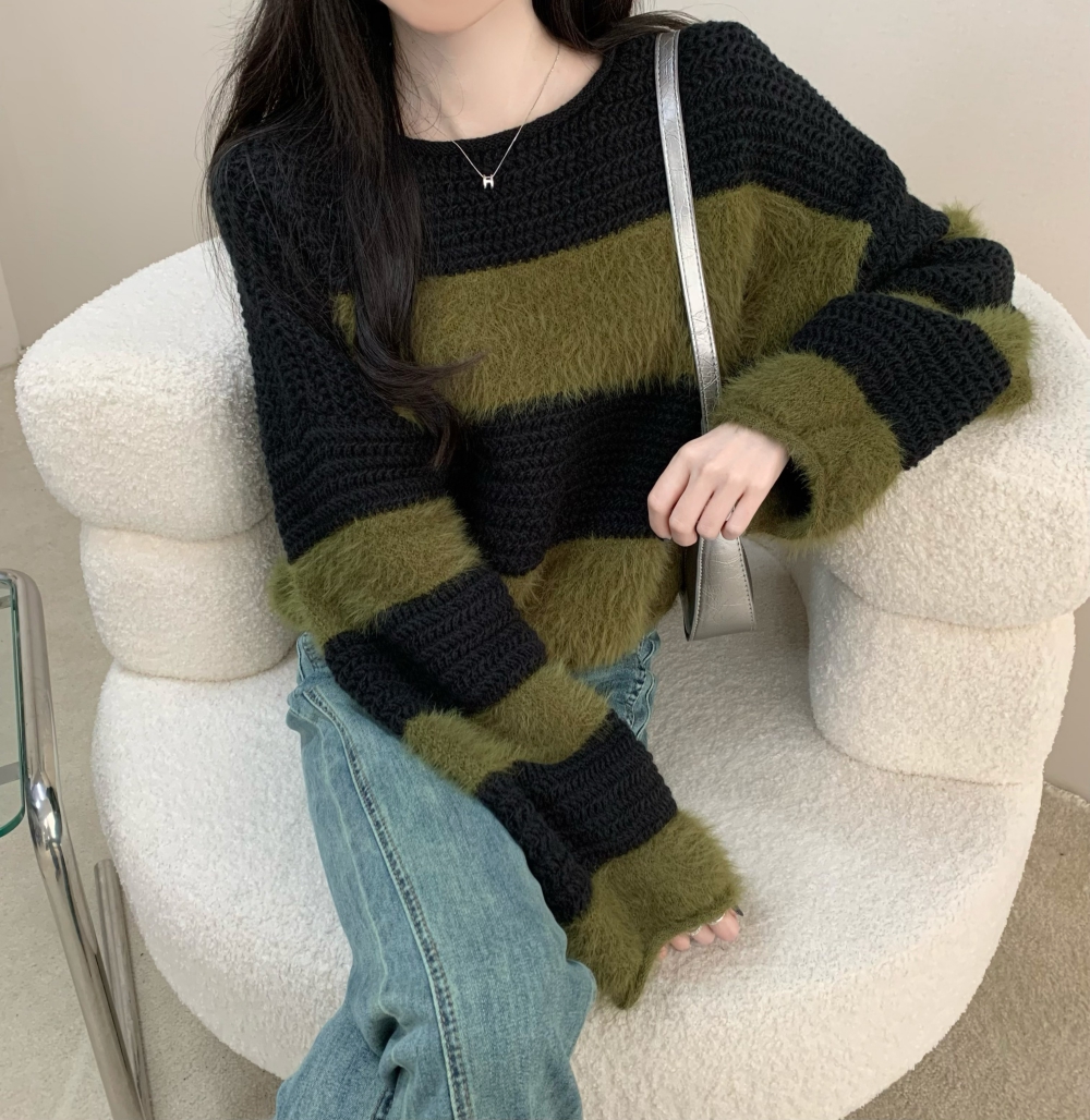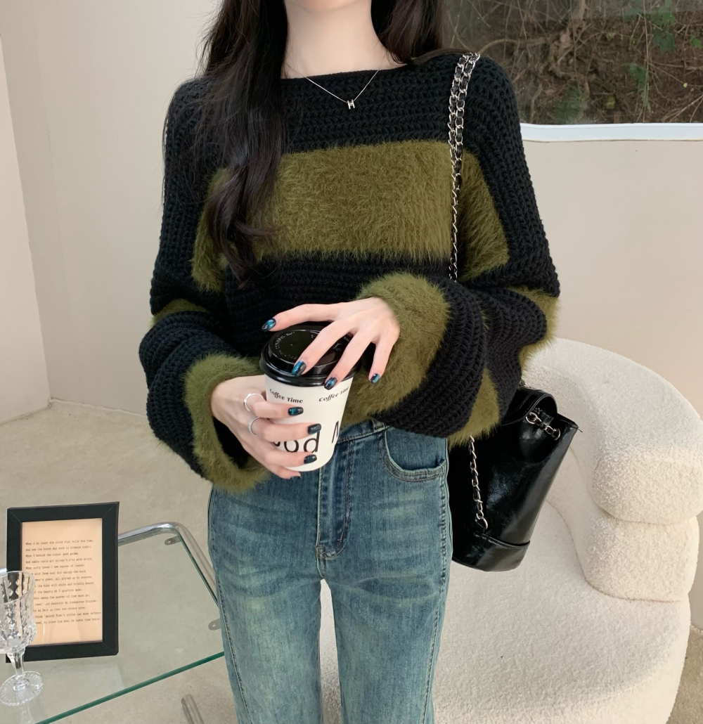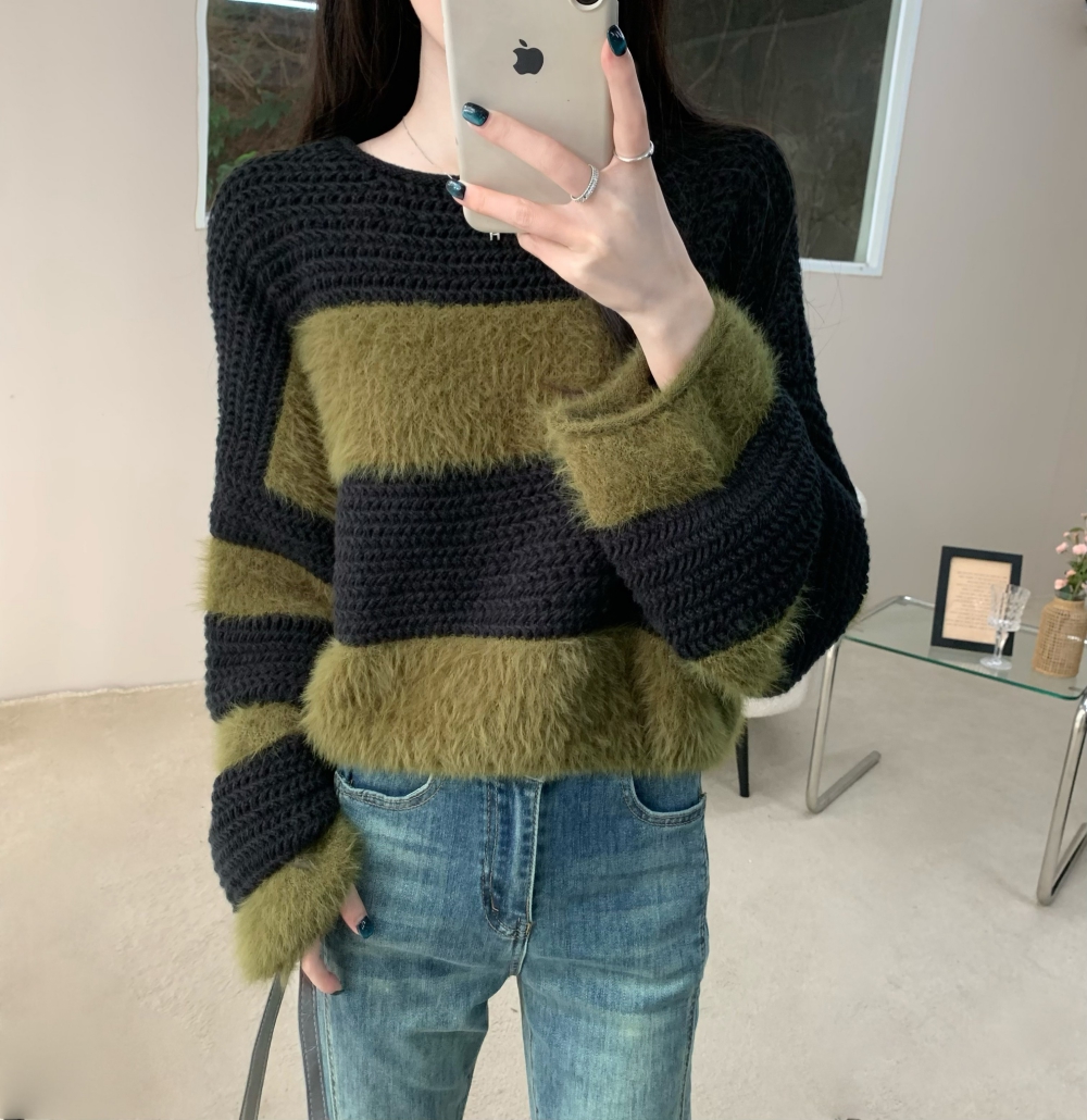 두꺼운 짧은 Maillard 다크 브라운 줄무늬 밍크 스웨터 여성의 가을과 겨울 느슨한 게으른 니트 탑