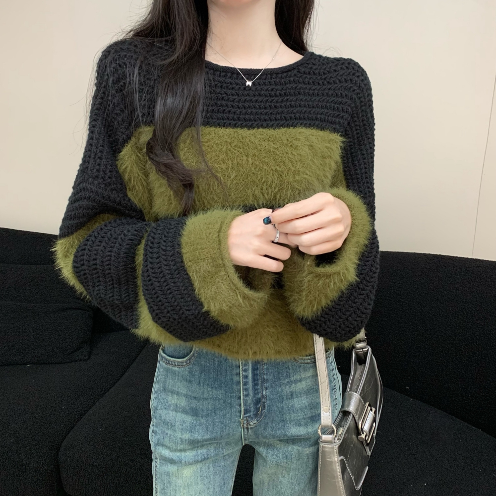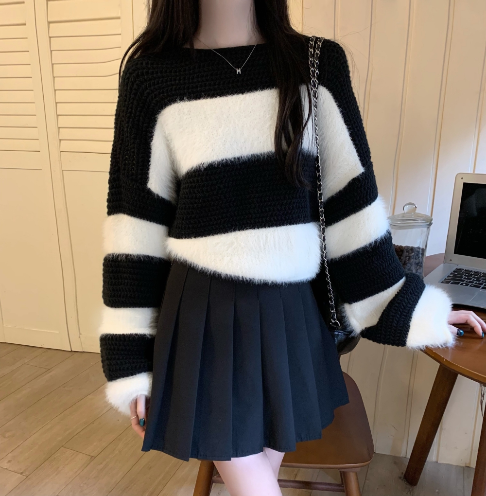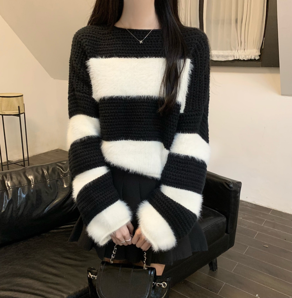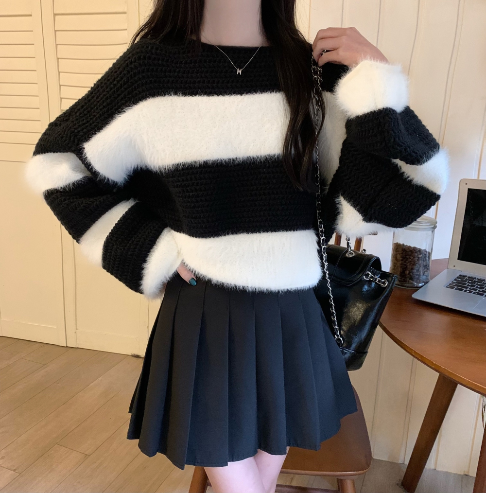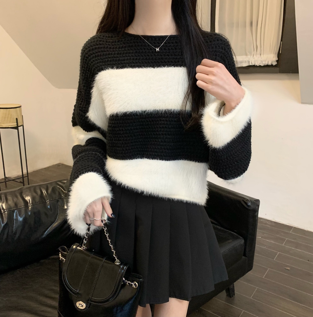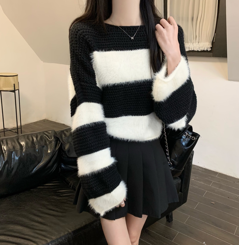 두꺼운 짧은 Maillard 다크 브라운 줄무늬 밍크 스웨터 여성의 가을과 겨울 느슨한 게으른 니트 탑