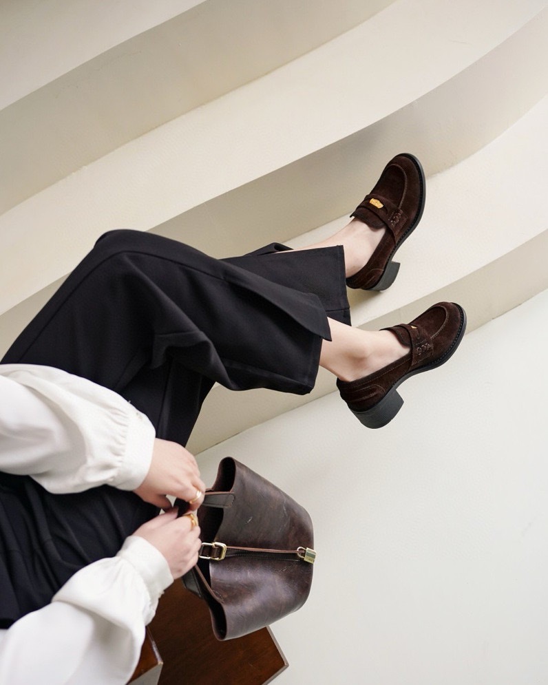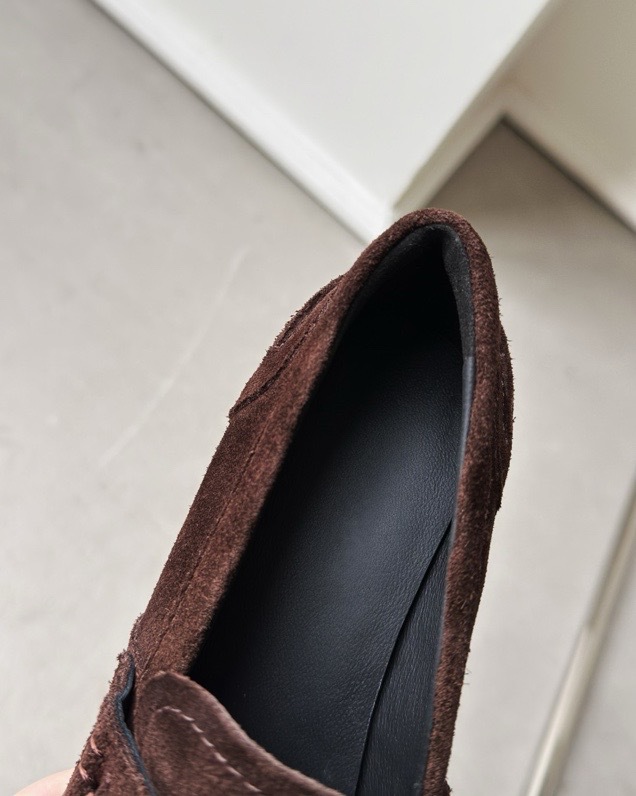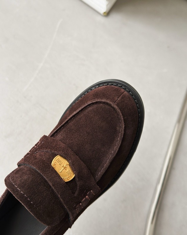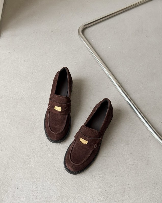 새로운 비싼 올드 머니 스타일 빈티지 스웨이드 작은 골드 코인 장식 버클 로퍼 여성 라운드 발가락 플랫 가죽 신발 같은 스타일스토어 가기