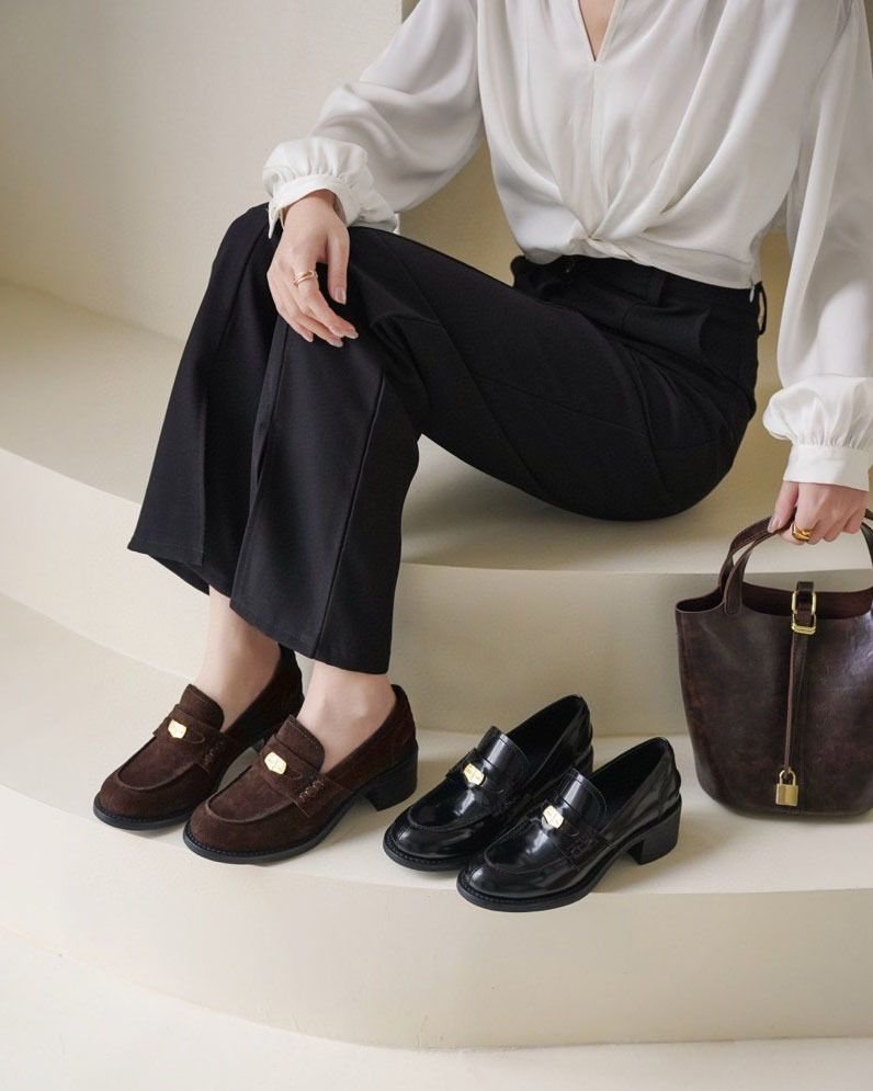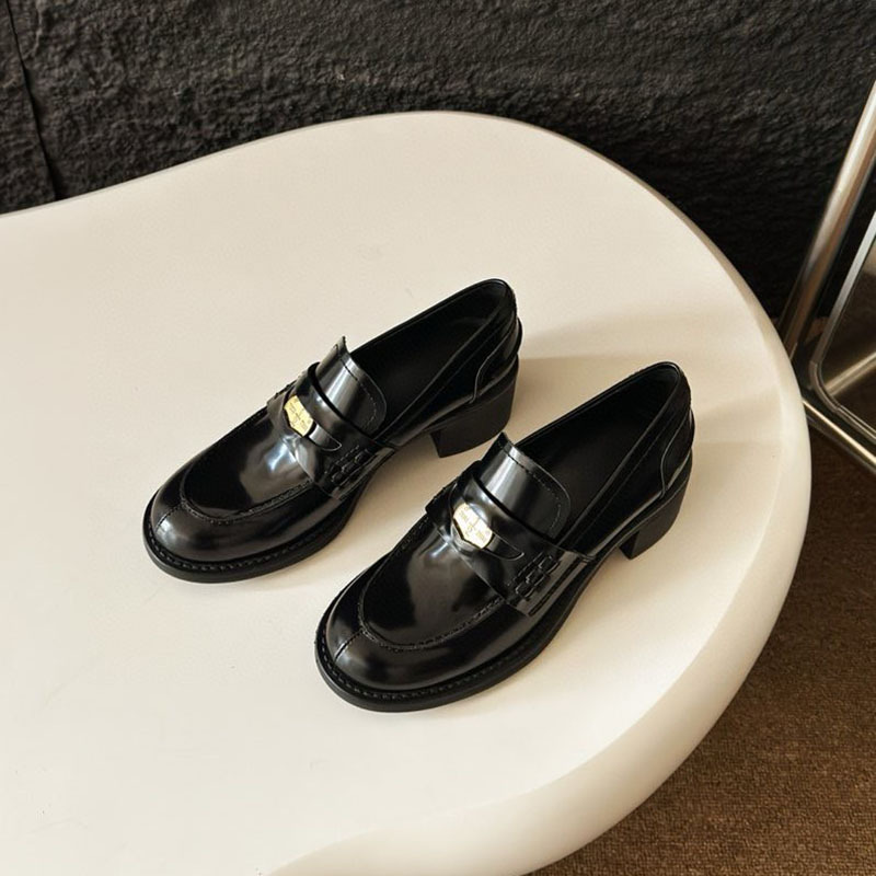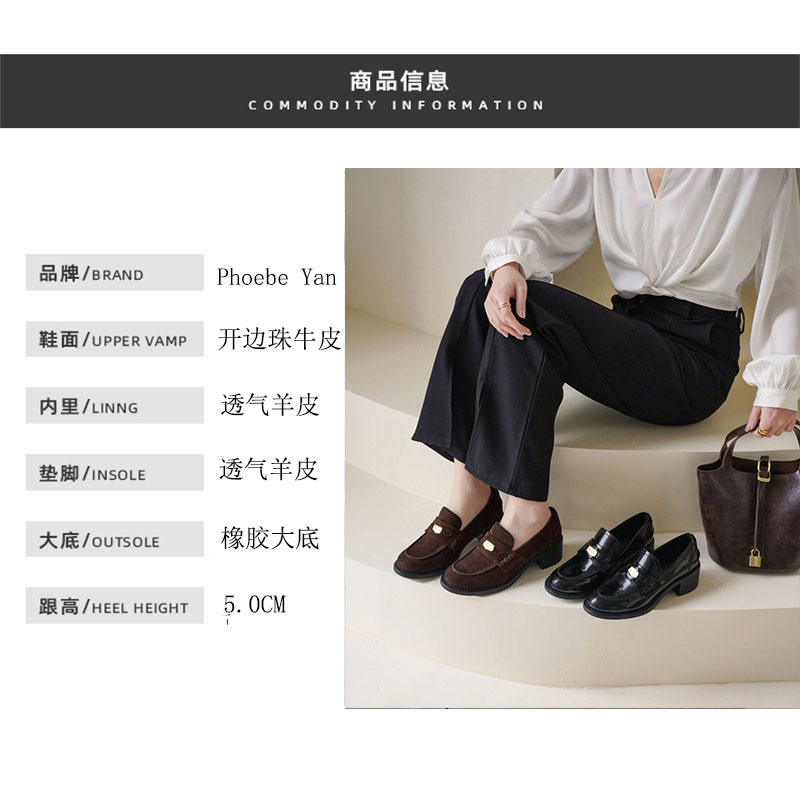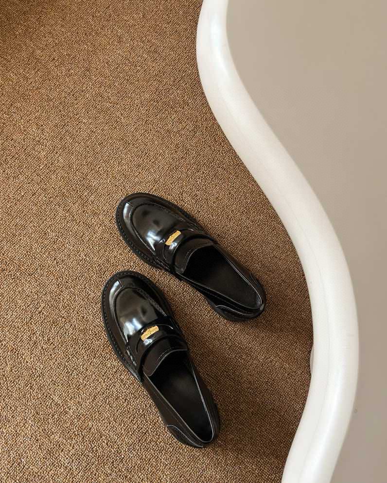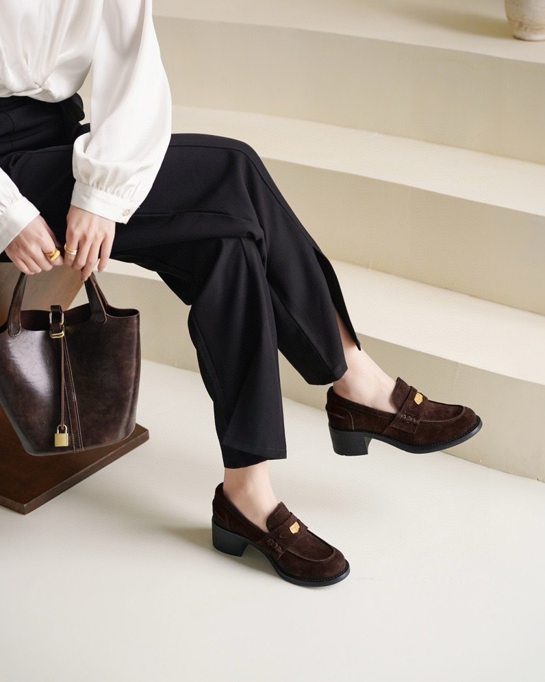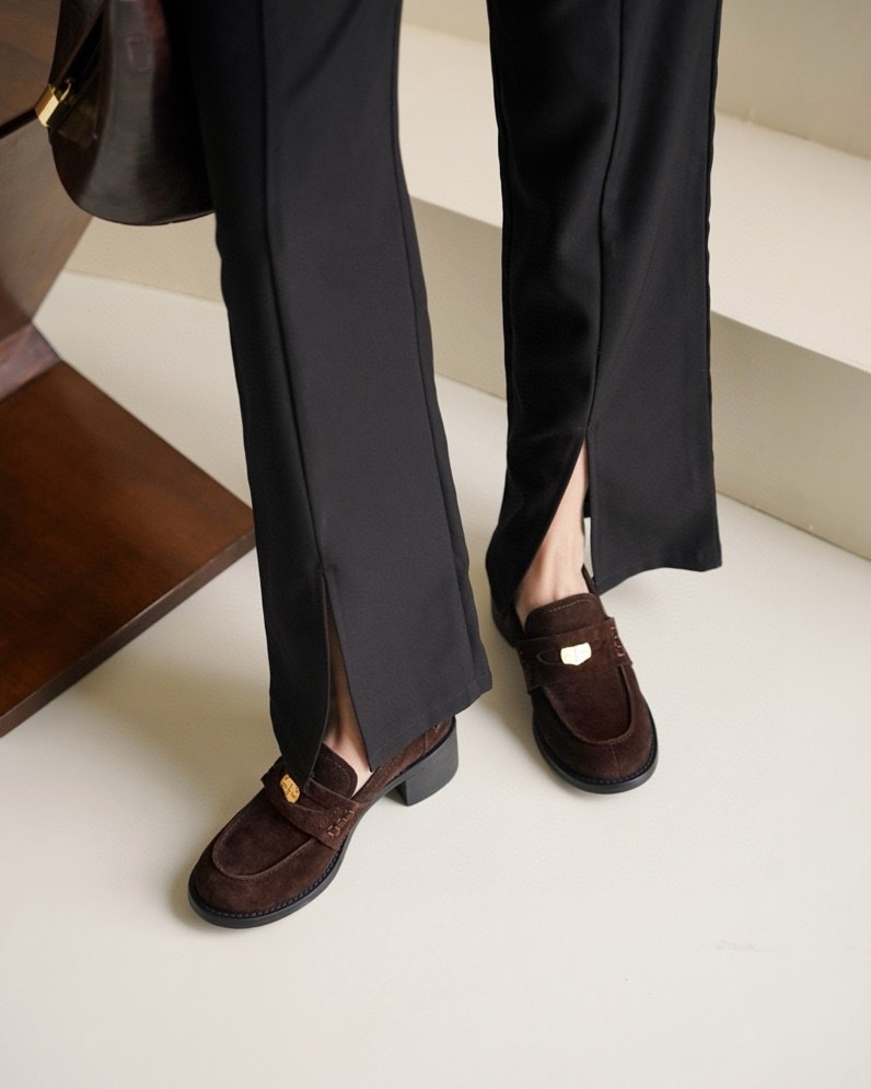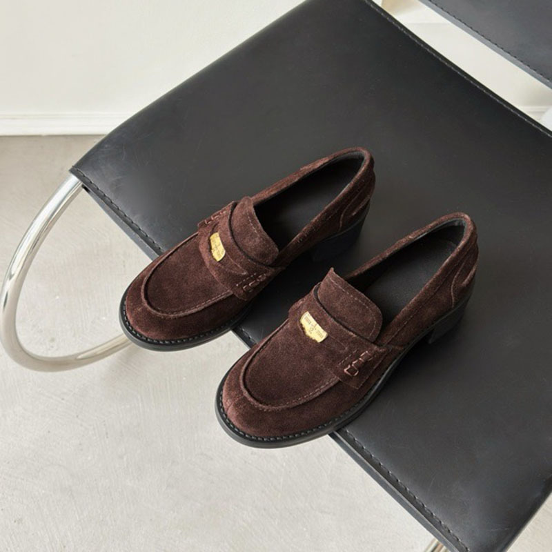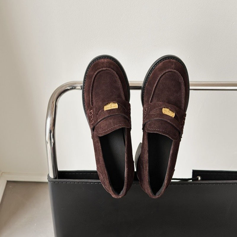 새로운 비싼 올드 머니 스타일 빈티지 스웨이드 작은 골드 코인 장식 버클 로퍼 여성 라운드 발가락 플랫 가죽 신발 같은 스타일